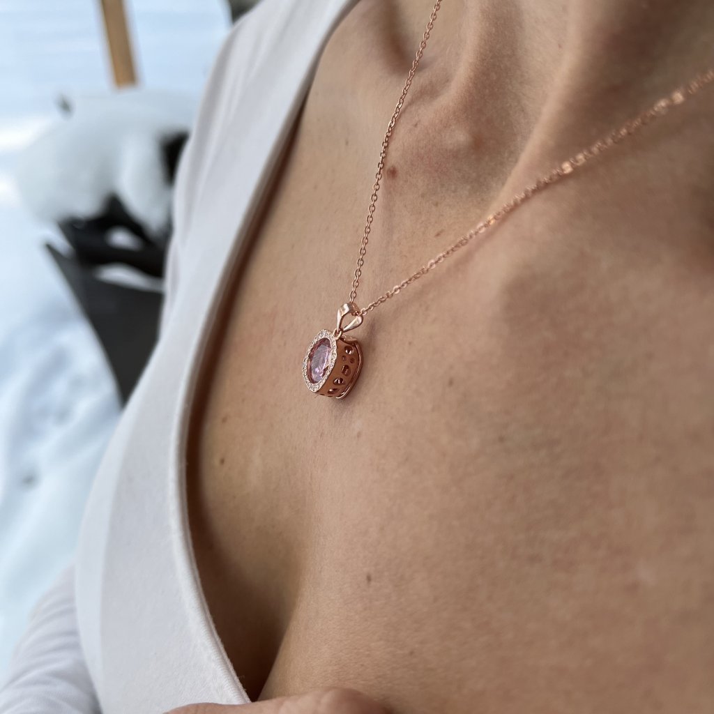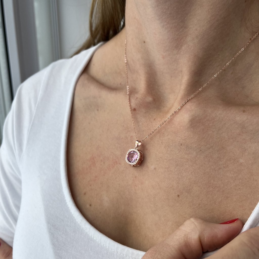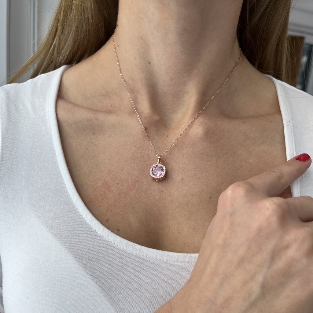 Wyjątkowy wisiorek ozdobiony jest piękną różową cyrkonią sześcienną o średnicy 9 mm, a cały element ma wymiary 11 x 12 mm, co nadaje klejnotowi blasku i luksusowego wyglądu. Łańcuszek ma długość 41 + 5 cm i jest regulowany.