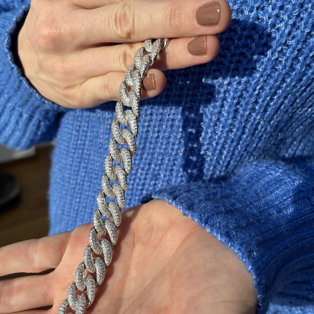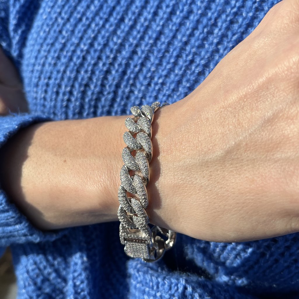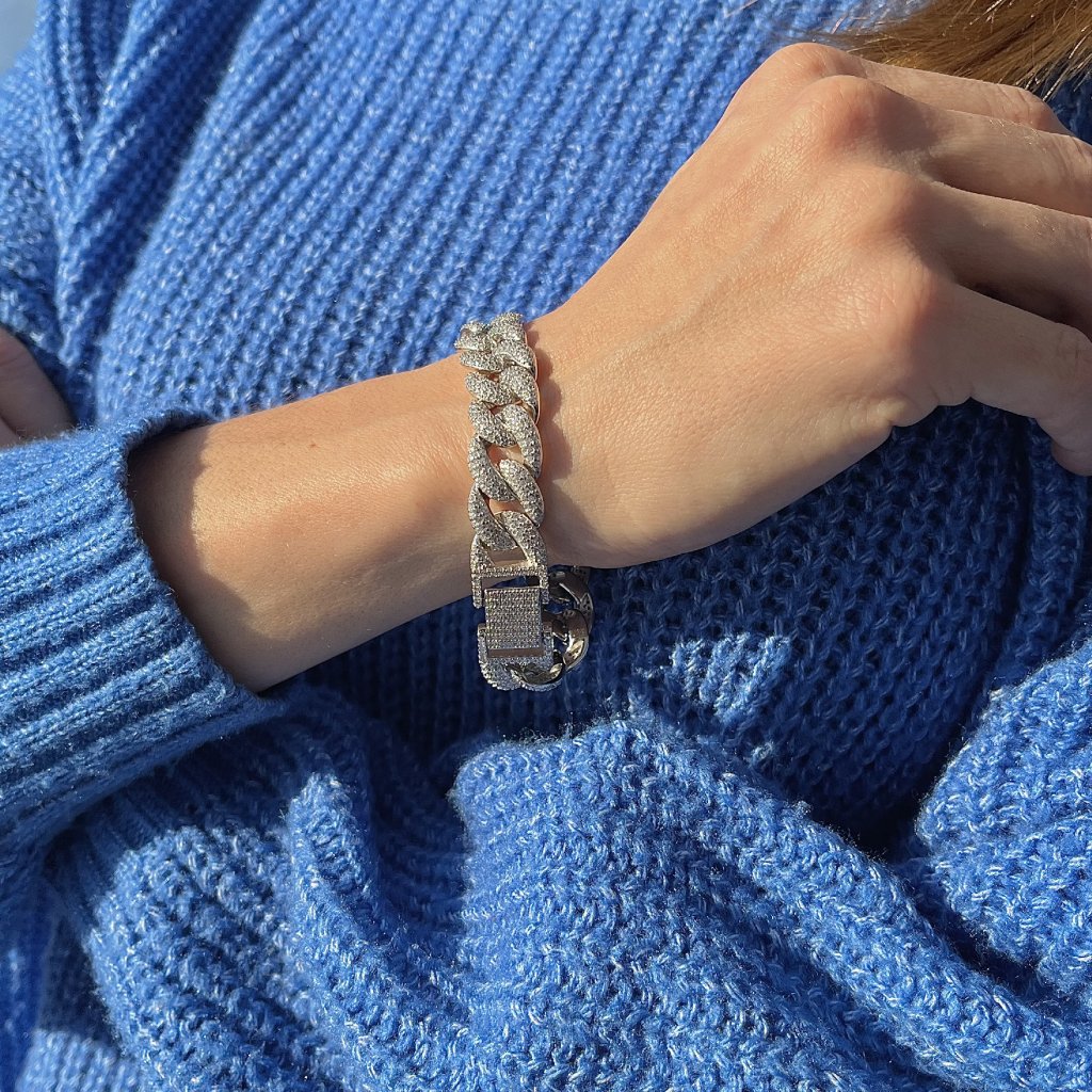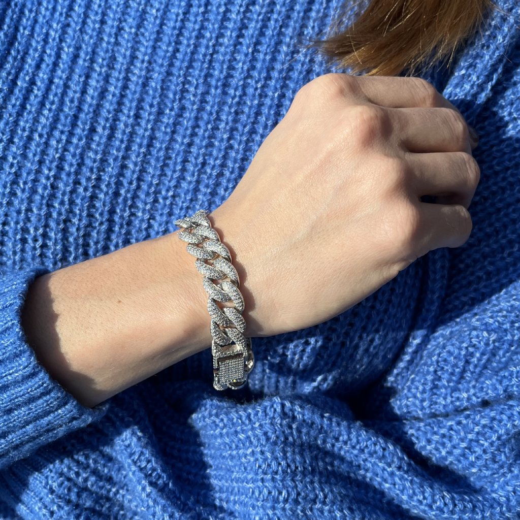 Wykonana z najczystszego srebra próby Ag925/1000, ta masywna bransoletka szczyci się wspaniałym połyskiem, który jest wzmocniony przez precyzyjnie osadzone przezroczyste cyrkonie sześcienne, które dodają klejnotowi niepowtarzalnego blasku.
