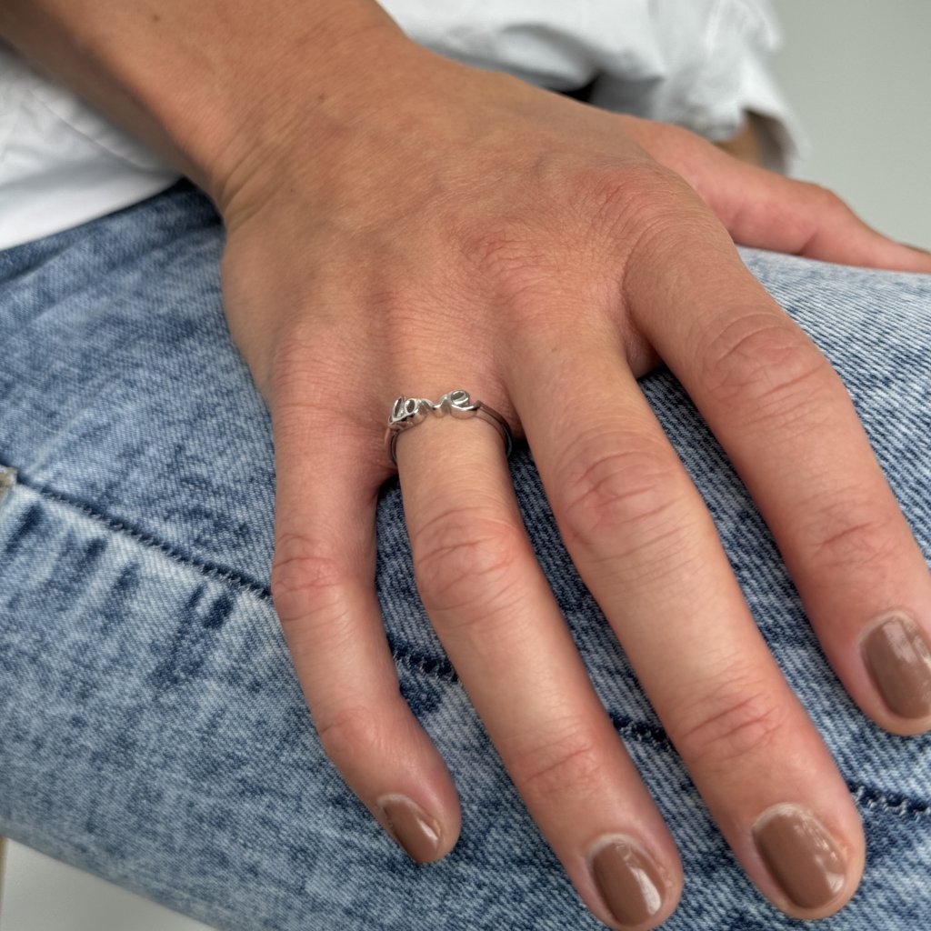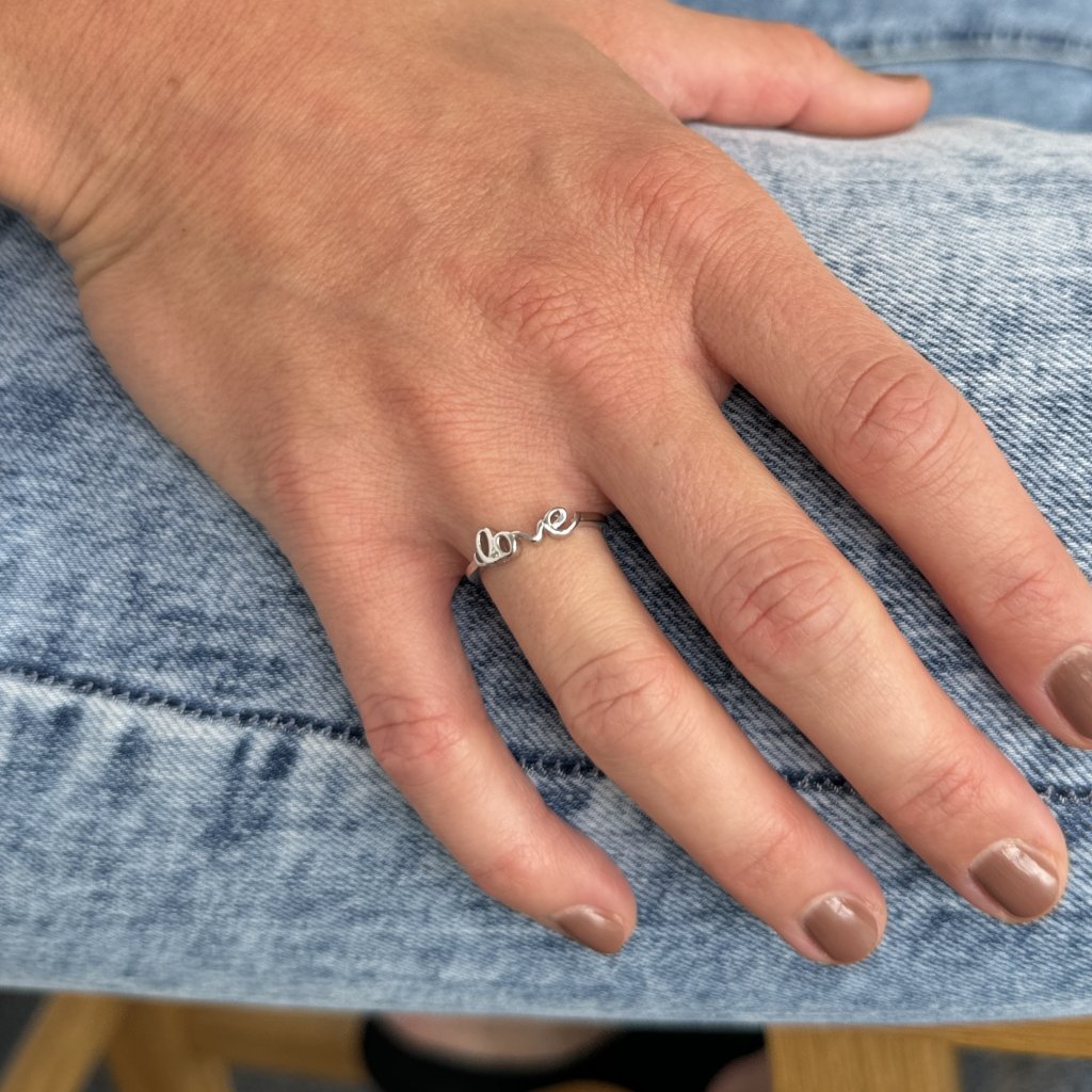 Głównym elementem pierścionka jest napis "love" tworzący jego przednią część. Ten projekt jest nie tylko atrakcyjny estetycznie, ale także niesie ze sobą silne przesłanie miłości, przywiązania i oddania. Pierścionek o szerokości 5 mm jest miękki i wygodny do noszenia przez cały dzień.