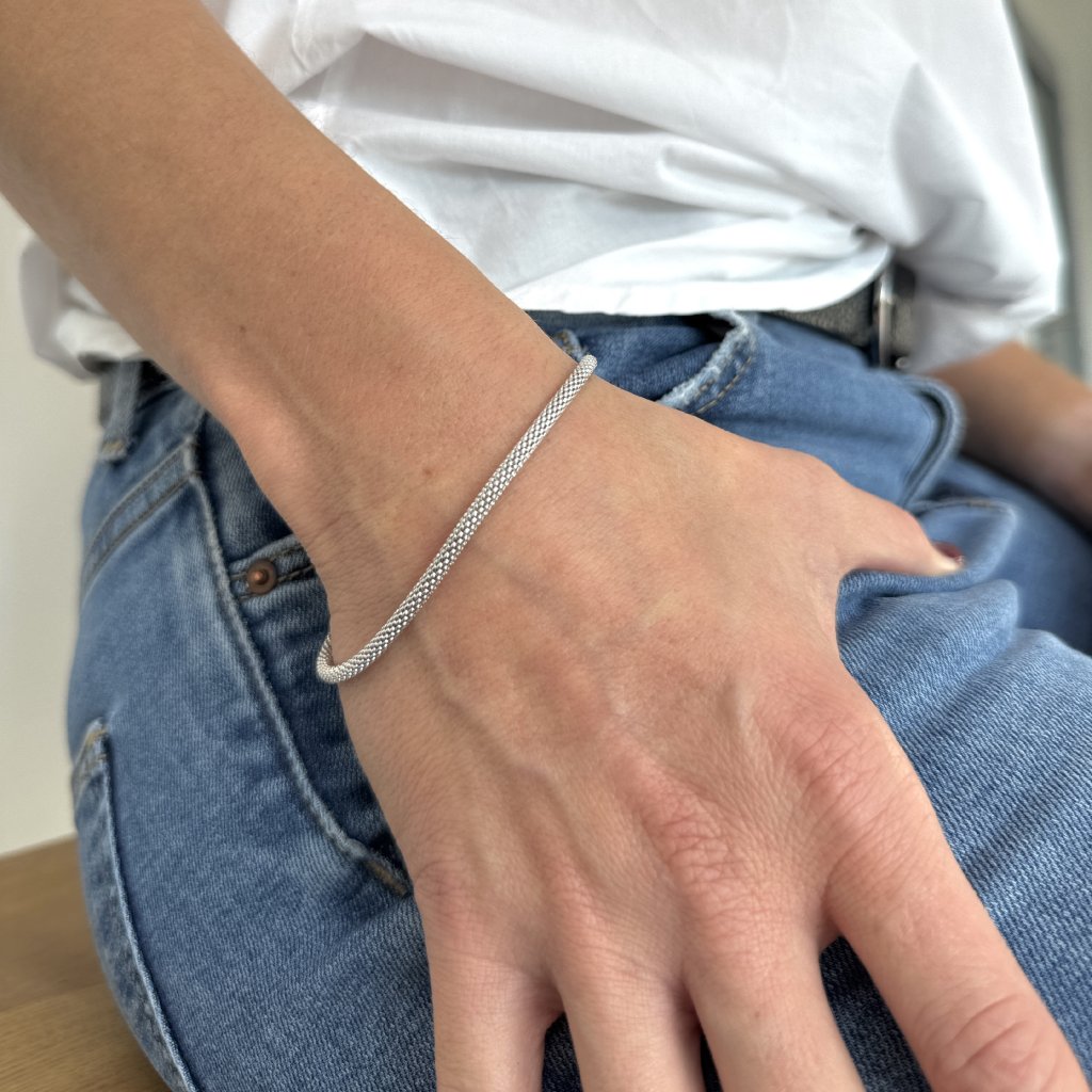 Srebrna bransoletka MADLEN to doskonałe połączenie nowoczesnego designu i klasycznej elegancji. Wykonana z wysokiej jakości srebra próby 925/1000 bransoletka o długości 19 cm zachwyca swoim stylem Popcorn, nadając jej niepowtarzalny wygląd i dotyk na skórze.