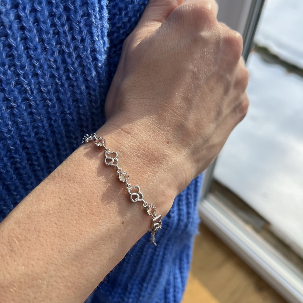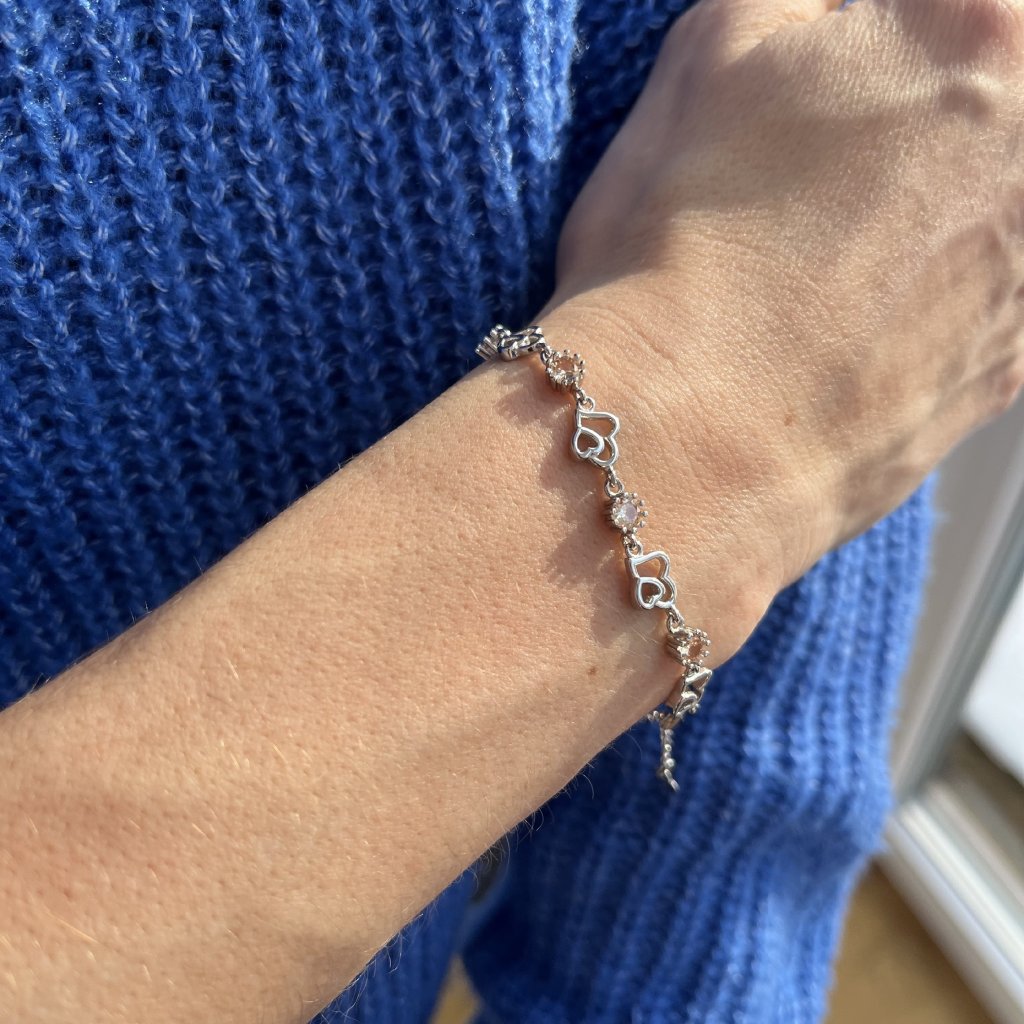 Każde z dwóch serc, wykonanych z czystego srebra próby 925, reprezentuje jedno serce kochającej się pary. Bransoletka jest starannie wykonana, a jej powierzchnia jest pokryta rodem dla dodatkowego połysku i trwałości. Jego długość 16 cm można przedłużyć o dodatkowe 3 cm, aby idealnie pasował na każdy nadgarstek.