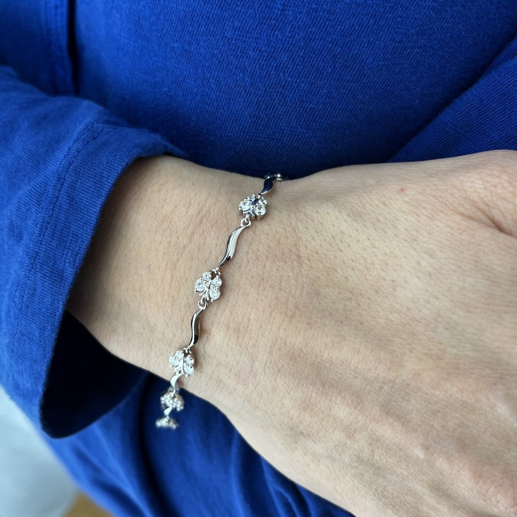 Ta bransoletka inspirowana jest pięknem natury i eleganckim tańcem motyli w locie. Srebro próby 925 i błyszczące cyrkonie nadają temu klejnotowi subtelnej i wyrafinowanej elegancji.