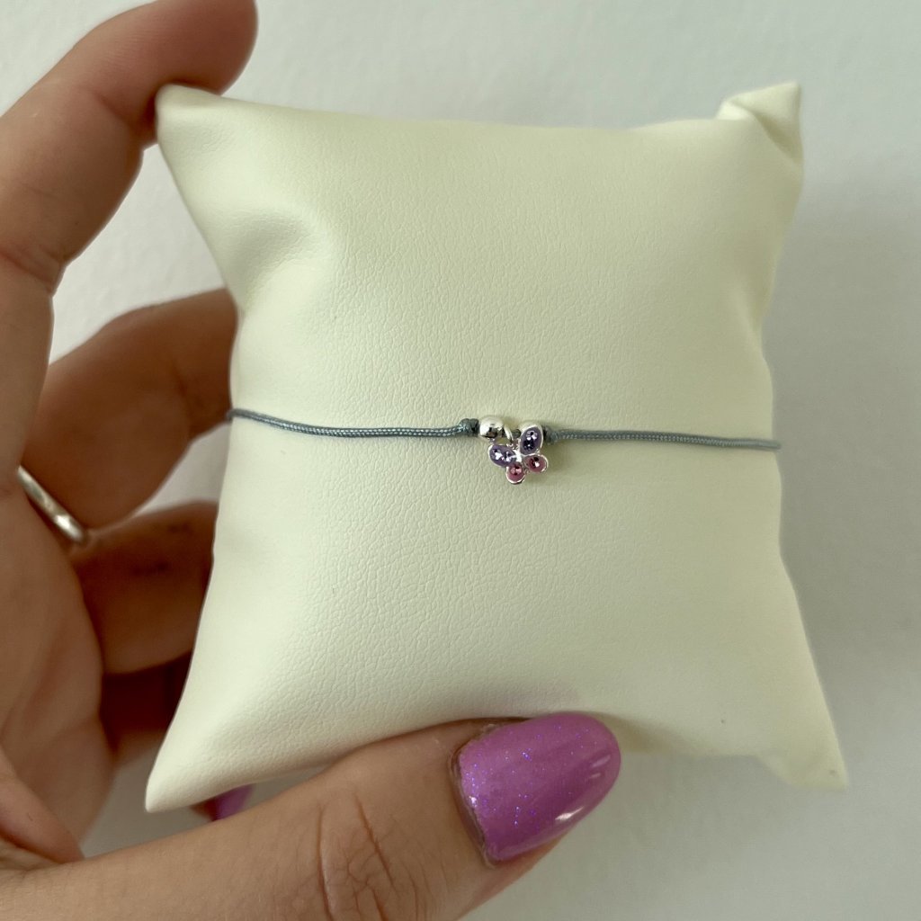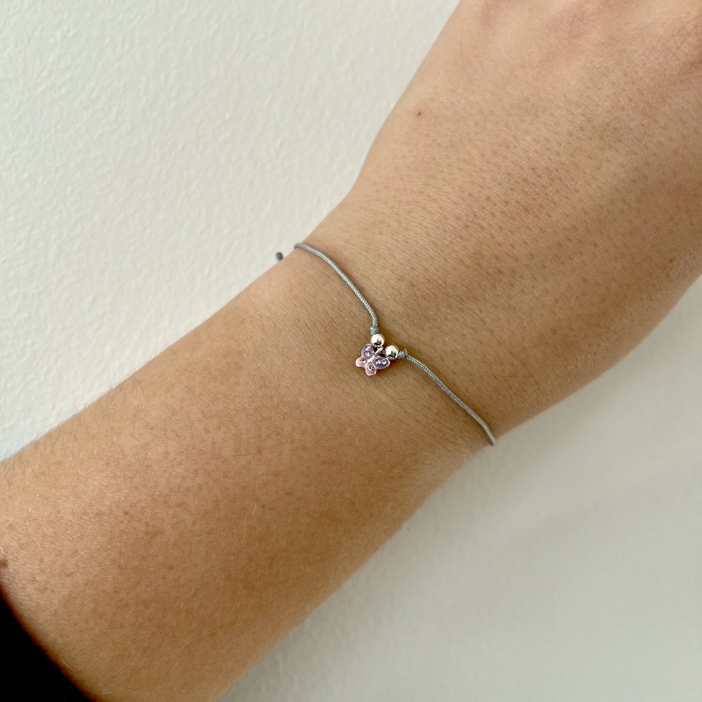 Srebrny element bransoletki ozdobiony jest motywem motyla, który wysadzany jest błyszczącymi kamieniami. Ten detal nadaje bransoletce delikatny i wyrafinowany wygląd. Rozmiar muszki wynosi 6 × 5 mm