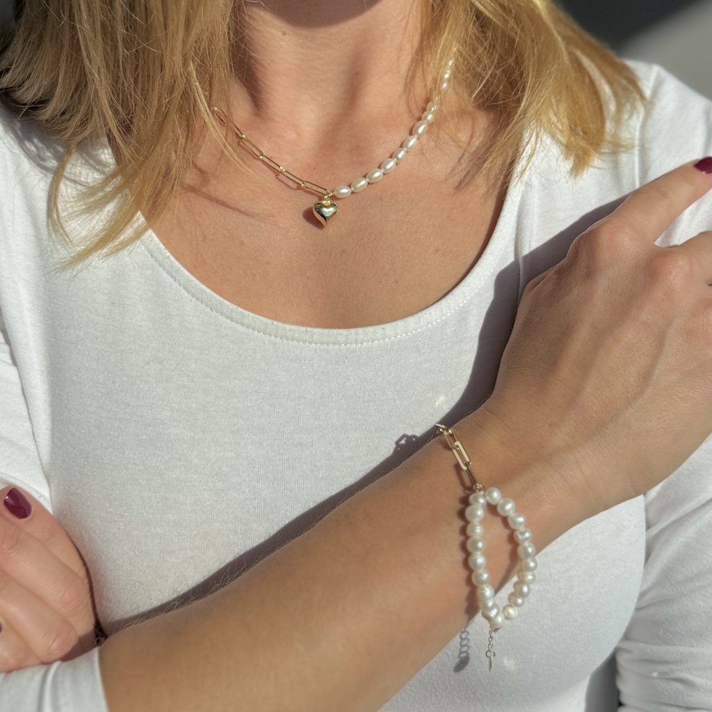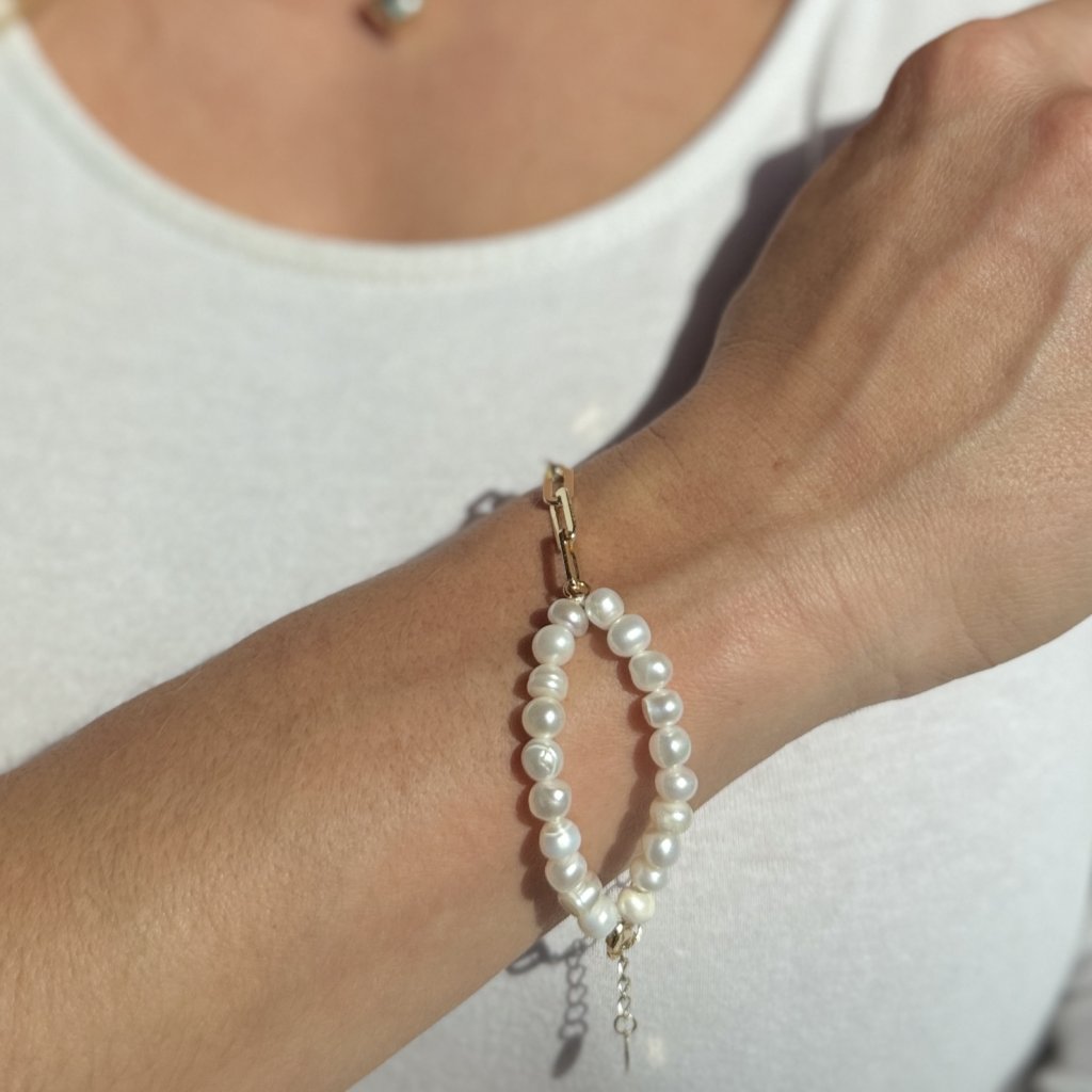 Głównym elementem jest podwójna część perłowa o szerokości 12 mm, która płynnie przechodzi w delikatny pozłacany łańcuszek o szerokości 5 mm. To połączenie tworzy interesujący kontrast i nadaje bransoletce wyrafinowany wygląd.