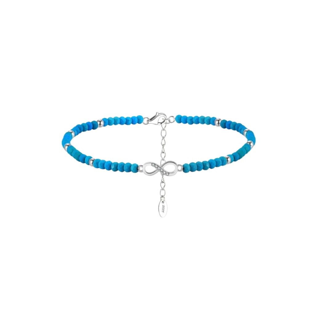 Srebrna bransoletka DAFNE to ucieleśnienie letniej elegancji i symboliki. Połączenie lśniącego, rodowanego srebra próby 925/1000, turkusowych kamieni i zawieszki nieskończoności tworzy wyjątkowy i uroczy wygląd. Dzięki regulowanej długości 21 + 5 cm oferuje wygodne dopasowanie do różnych rozmiarów nadgarstka lub kostki.
