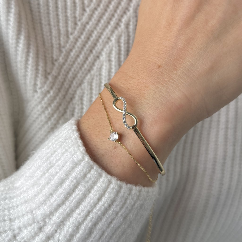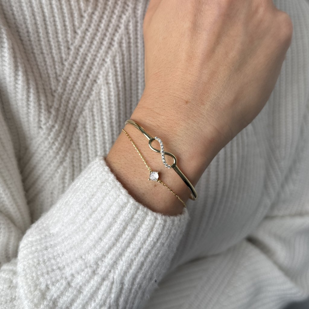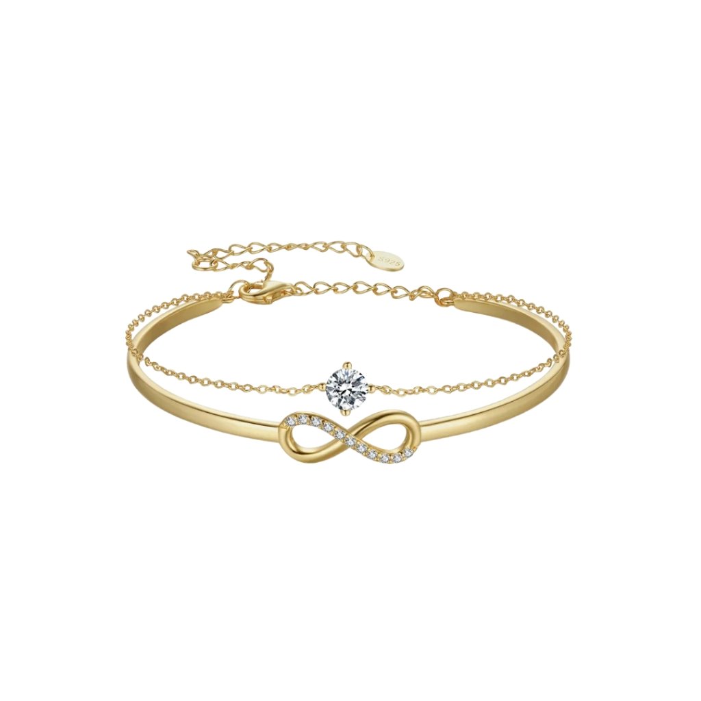 Przedstawiamy wyjątkową srebrną bransoletkę KONSTANCIE, która przyciągnie uwagę swoim niezwykłym podwójnym wzorem. Pierwsza część składa się z pełnego okręgu o średnicy 50 mm z eleganckim symbolem nieskończoności (18 × 7 mm), który symbolizuje wieczność i nieskończoną miłość. Drugą część bransoletki stanowi delikatny łańcuszek ozdobiony mieniącymi się przezroczystymi cyrkoniami sześciennymi.
