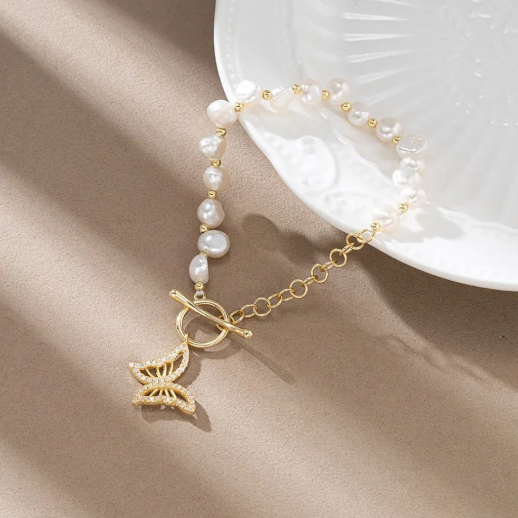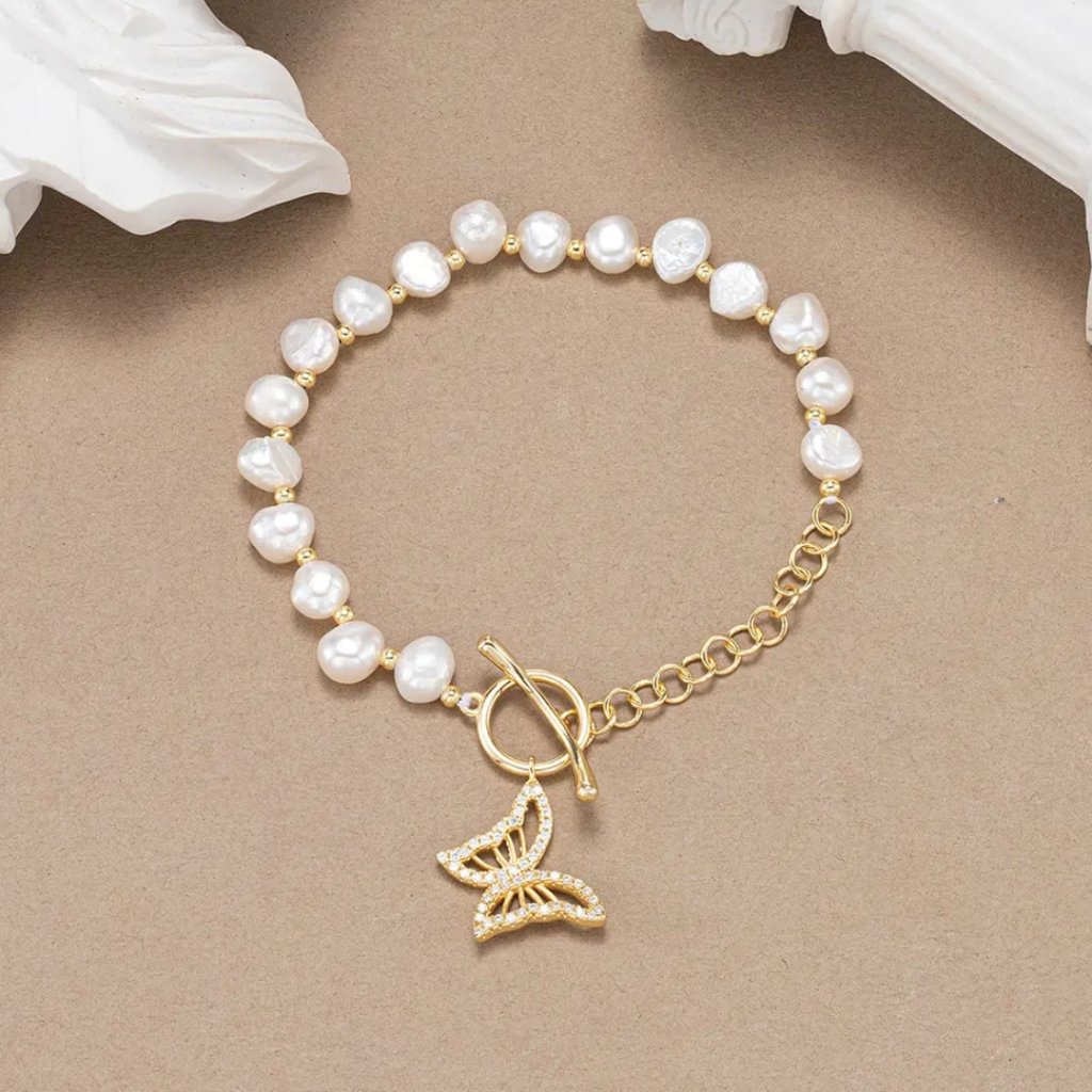 Odkryj piękno pozłacanej bransoletki ELA, która łączy w sobie ponadczasową elegancję pereł z figlarnym motywem motyla. Ta wyjątkowa biżuteria jest wykonana z najwyższej jakości srebra Ag925/1000 i ozdobiona luksusowym 14-karatowym złoceniem. Bransoletka zdobi się szeregiem wspaniałych słodkowodnych pereł o wielkości 5×6 mm i unikalnym przednim zapięciem.