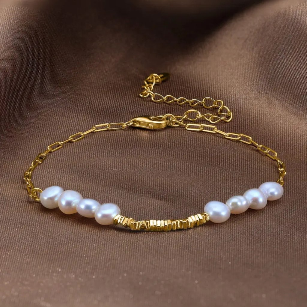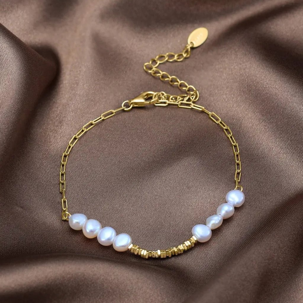Oczaruj się bransoletką SAVELA, która łączy w sobie delikatność słodkowodnych pereł z przepychem pozłacanego srebra. Wykonana z wysokiej jakości srebra próby 925/1000 z luksusowym 14-karatowym pozłoceniem gwarantuje długotrwałe piękno i elegancję.