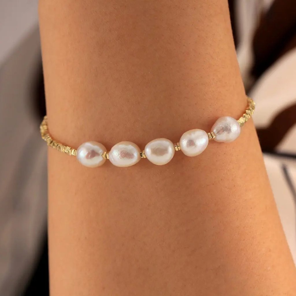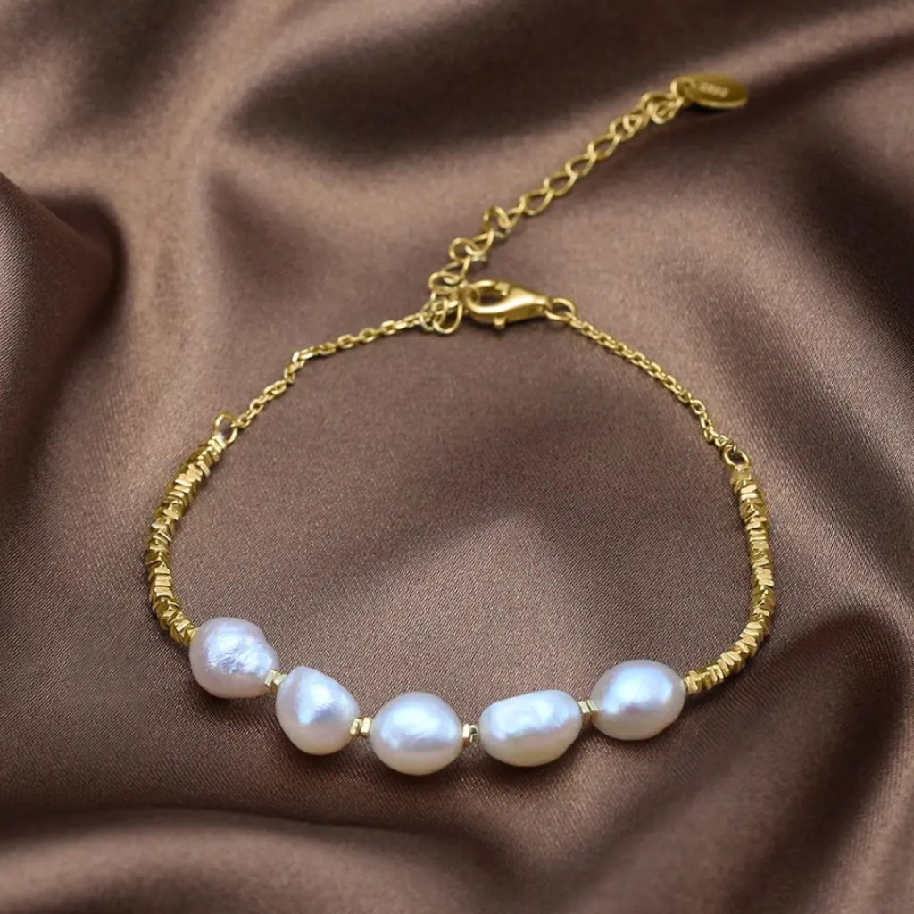 Odkryj urok bransoletki SAVINA, która łączy wdzięk słodkowodnych pereł z olśniewającym blaskiem pozłacanego srebra. Wykonana z wysokiej jakości srebra próby 925/1000 z luksusowym 14-karatowym złoceniem zapewnia długotrwałe piękno i elegancję.