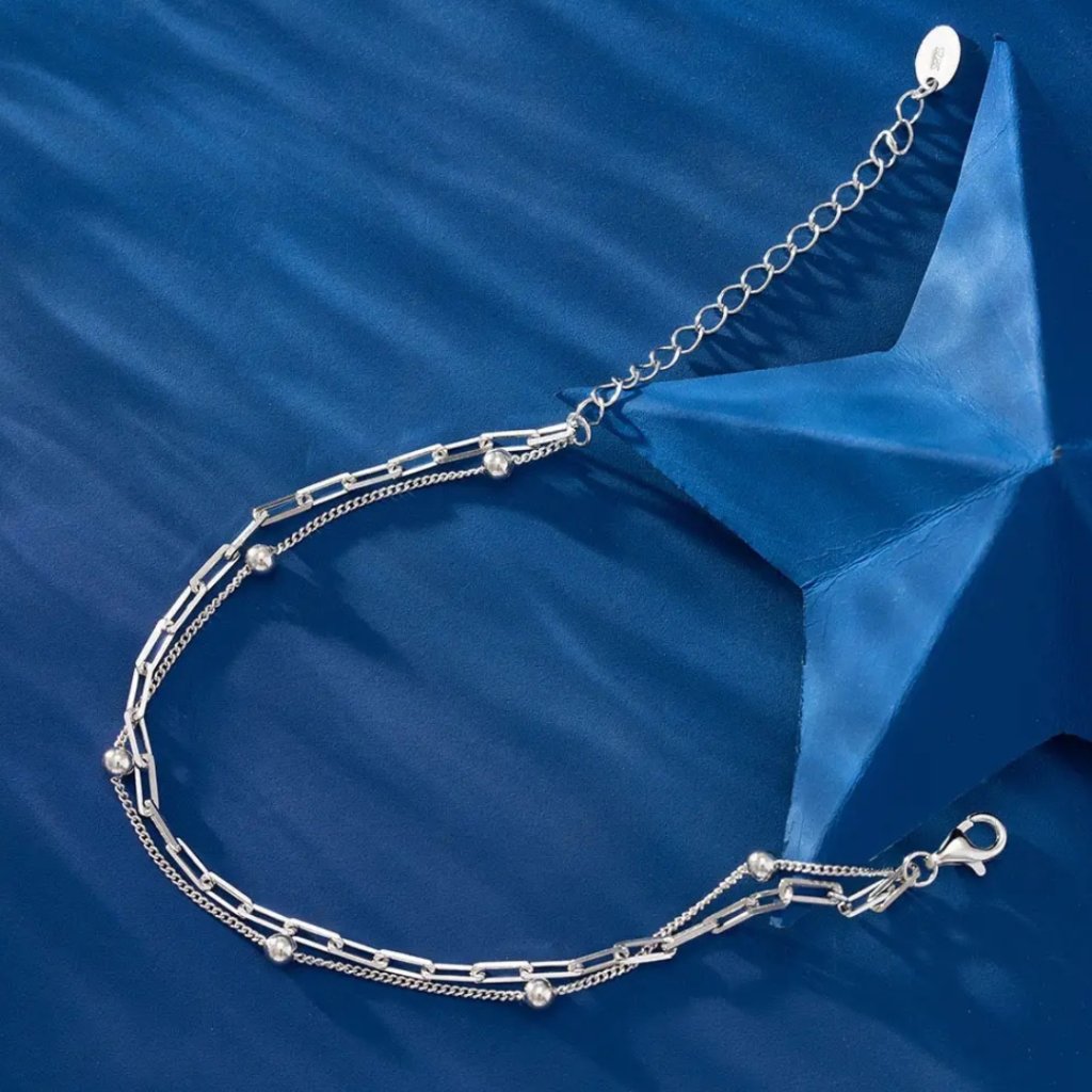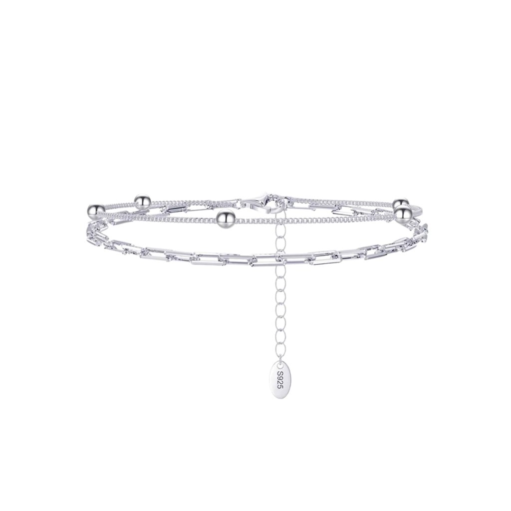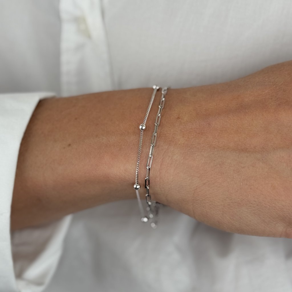 Jego dwurzędowa konstrukcja łączy elegancki łańcuszek w stylu Paperclip z delikatnym rzędem kuleczek o średnicy 3 mm, tworząc fascynującą grę światła i cienia na Twoim nadgarstku. Wykonany z wysokiej jakości srebra próby 925/1000 z rodowanym wykończeniem. Dzięki regulowanej długości 16 + 5 cm idealnie dopasowuje się do rozmiaru Twojego nadgarstka.