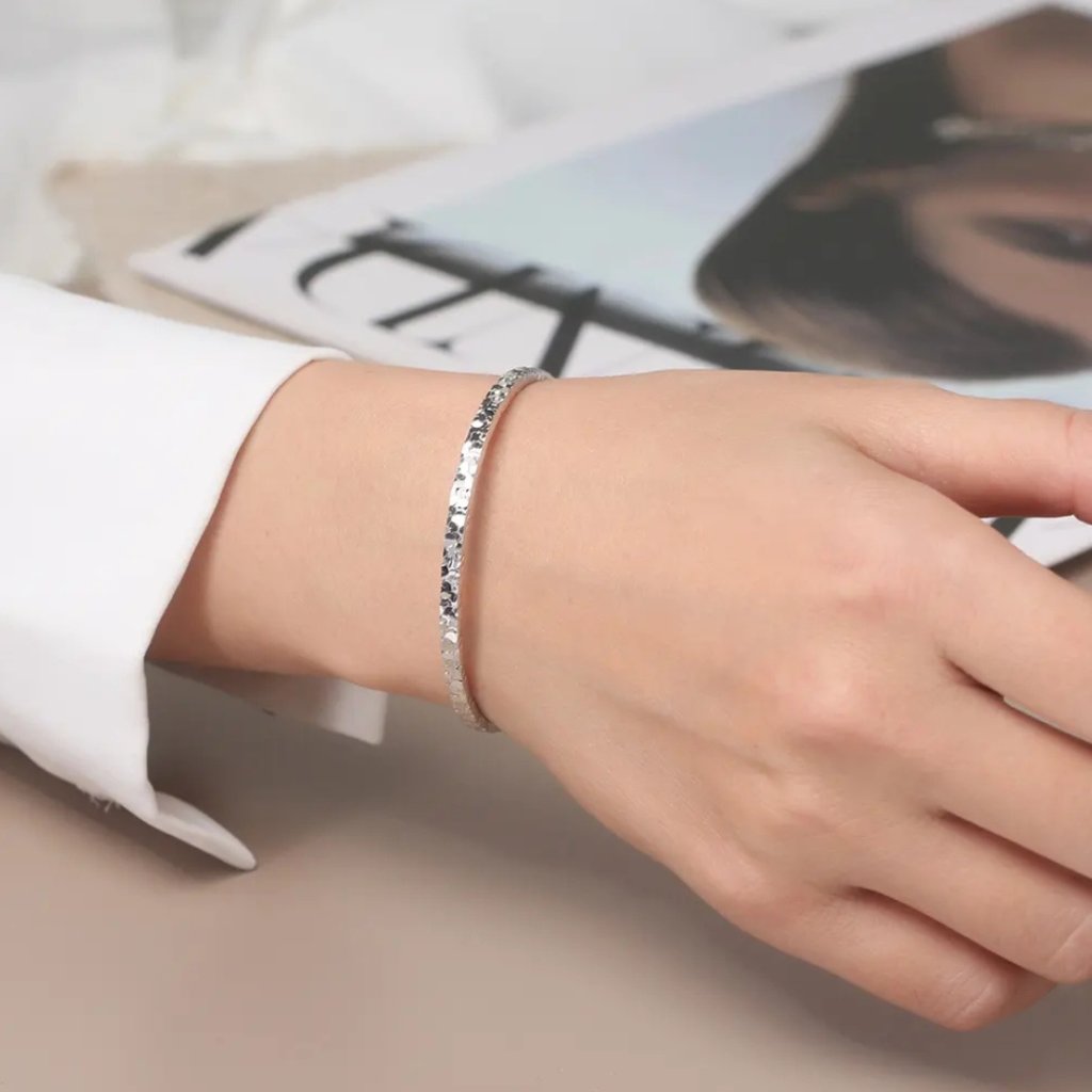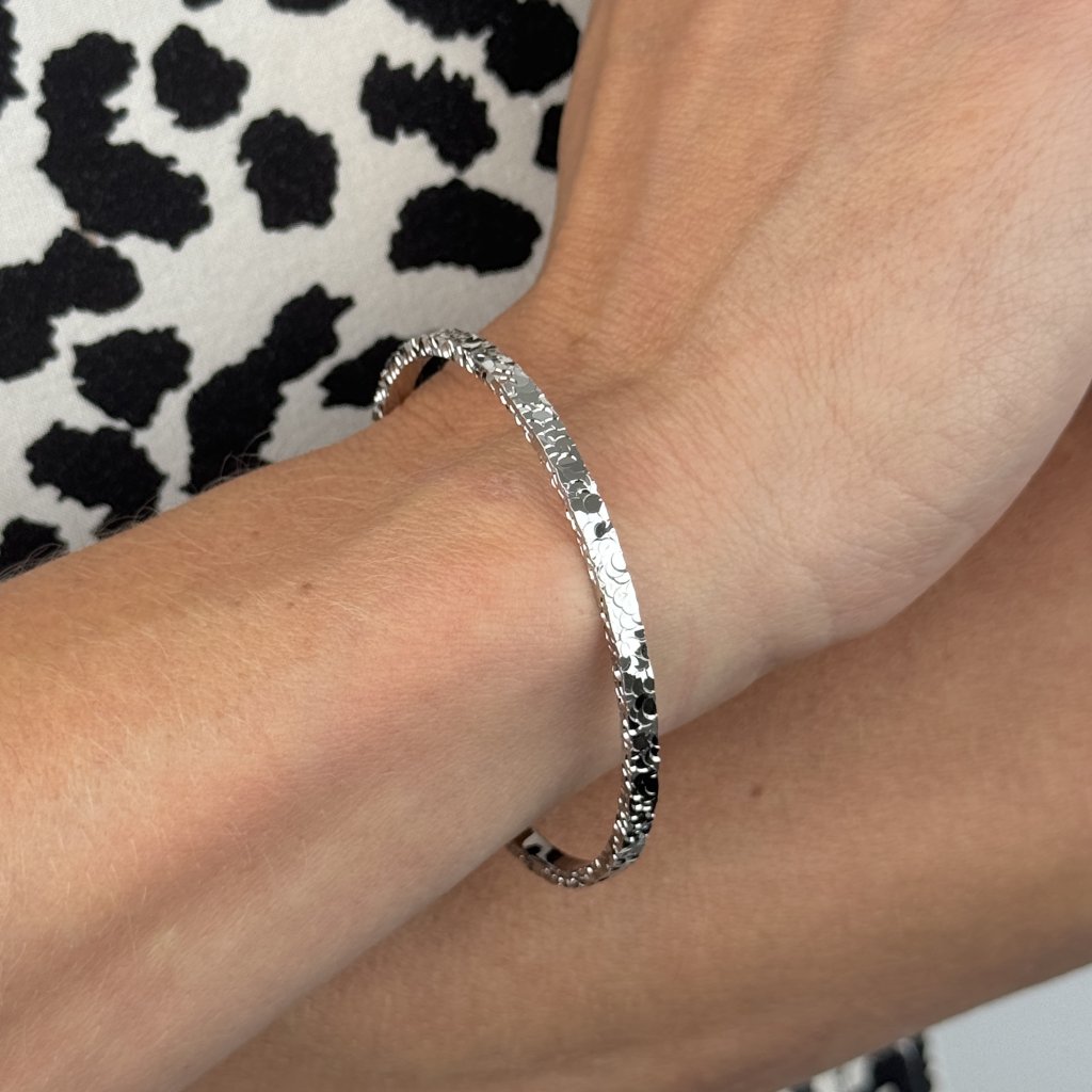Ta sztywna, otwarta bransoletka o średnicy 65 mm z łatwością dopasowuje się do każdego nadgarstka. Jej szerokość 3 mm zapewnia idealną równowagę między delikatnością a wyrazistością, dzięki czemu jest zauważalna, ale nigdy nie przeszkadza.