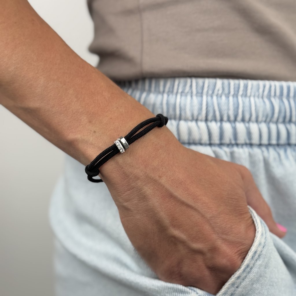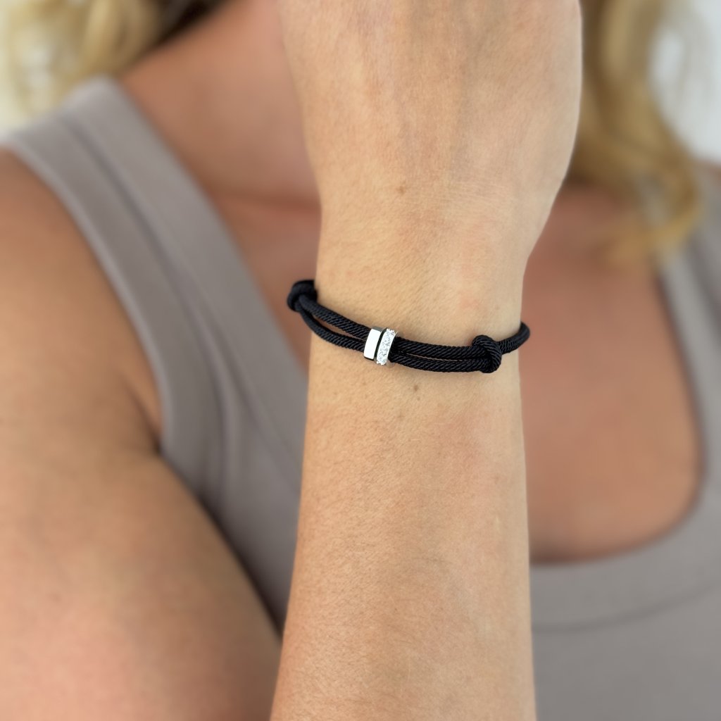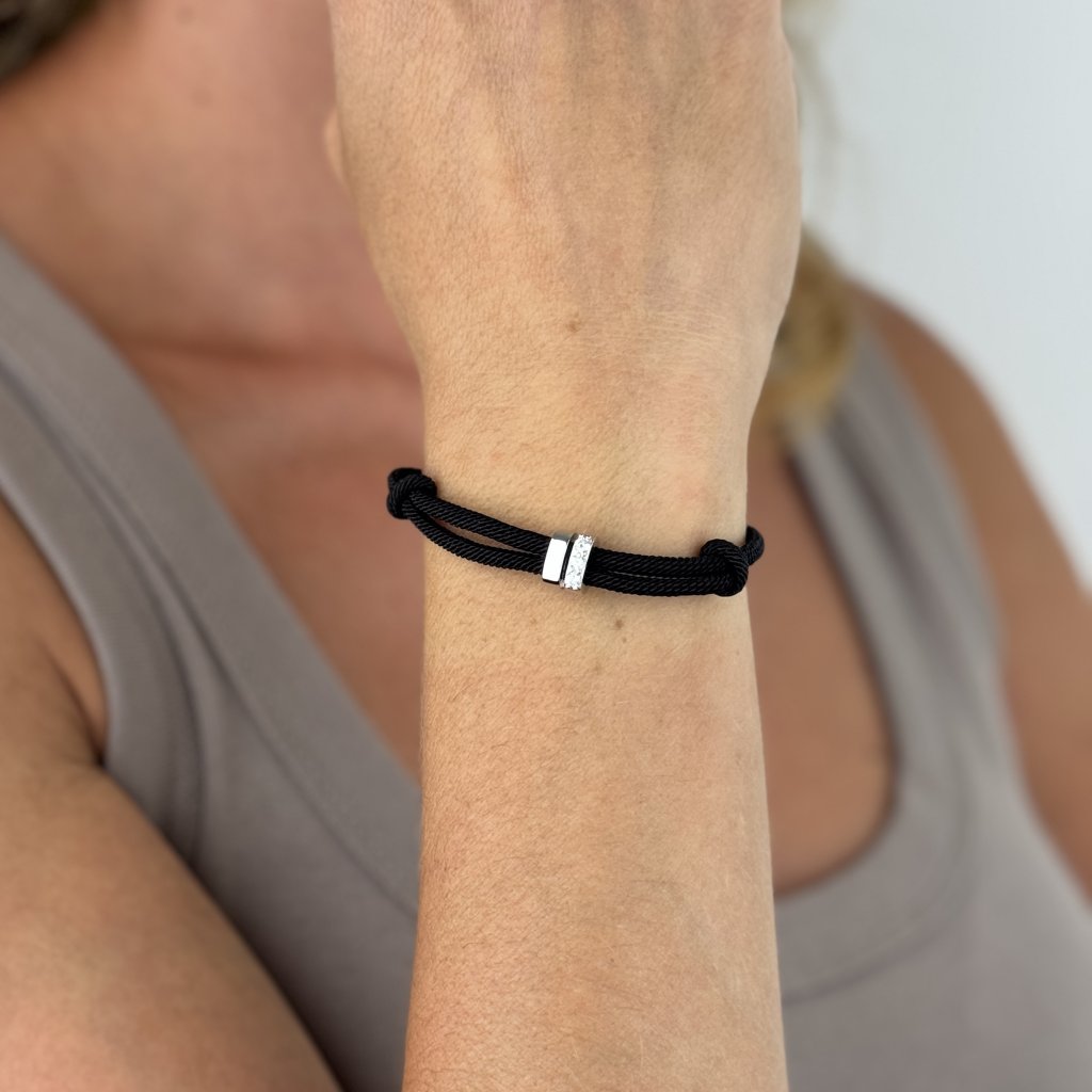 Czarny nylonowy sznurek o długości 16,5 cm z 5-centymetrowym przedłużeniem zapewnia wygodne noszenie. Kółka o szerokości 7 mm i 3 mm są eleganckie i jednocześnie przyciągają wzrok.