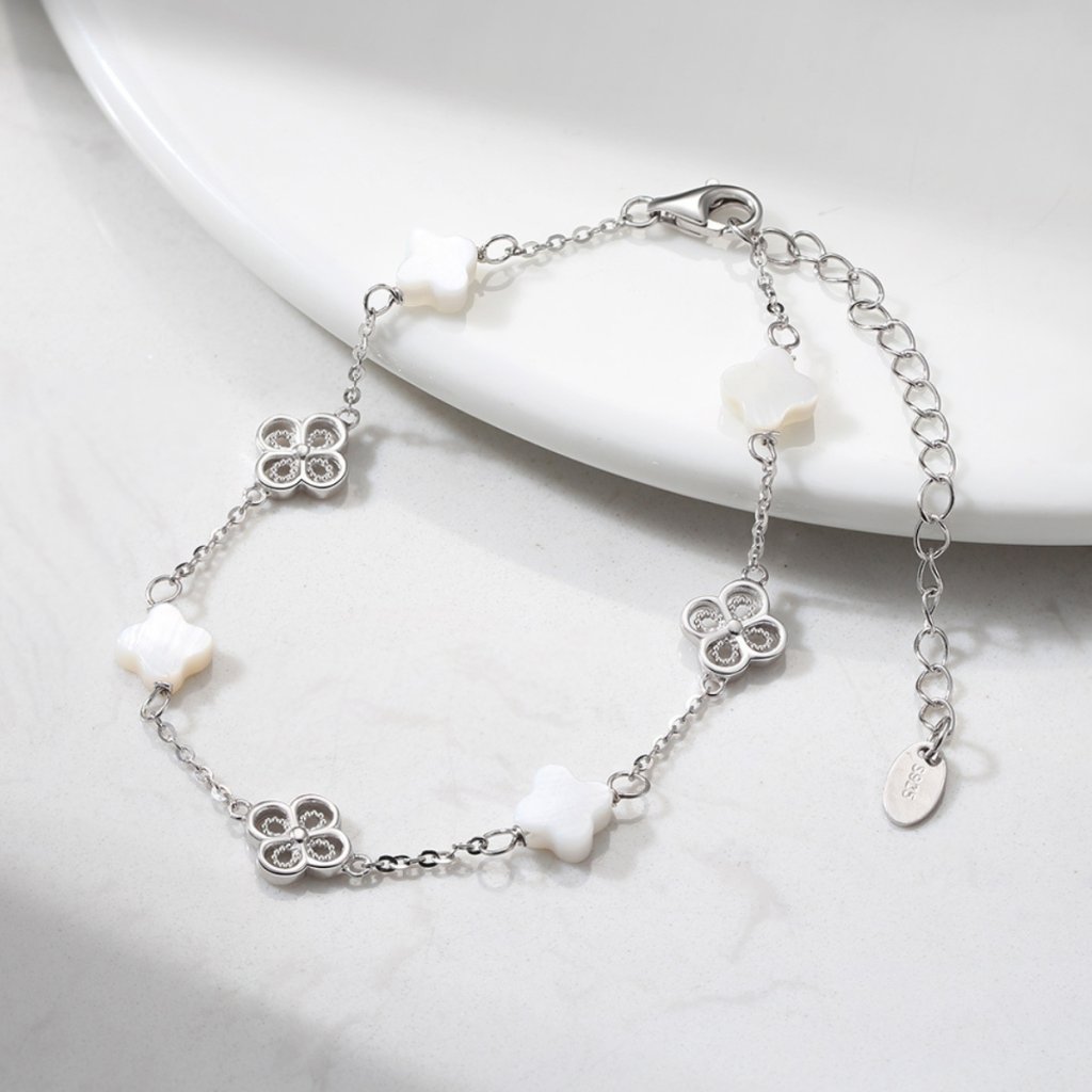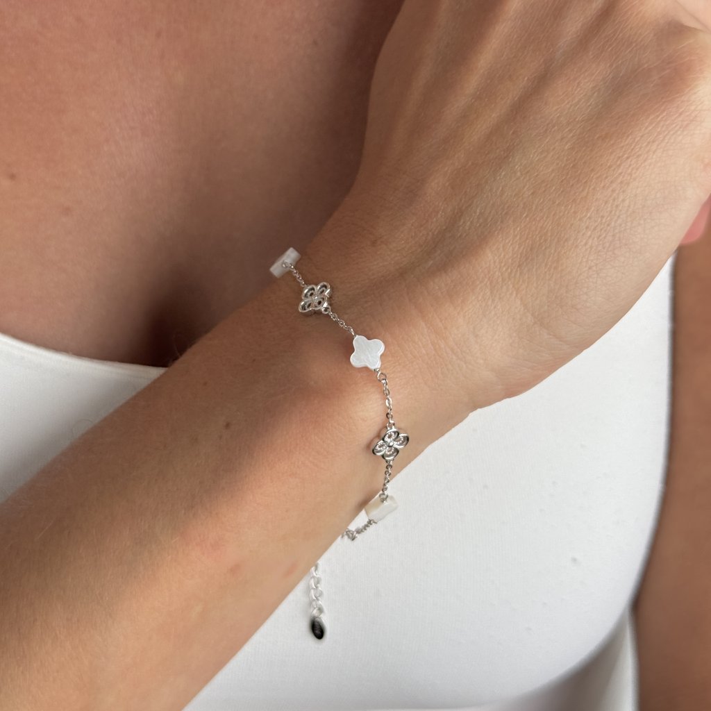 Bransoletka LUCKY CAREN wykonana z wysokiej jakości srebra próby 925/1000 z roduowanym wykończeniem wnosi do Twojej szkatułki odrobinę szczęścia i elegancji. Delikatny łańcuszek zdobią tematyczne zawieszki - czterolistna koniczyna jako symbol szczęścia, uzupełniona pięknymi perłami słodkowodnymi uformowanymi w czterolistne koniczyny.