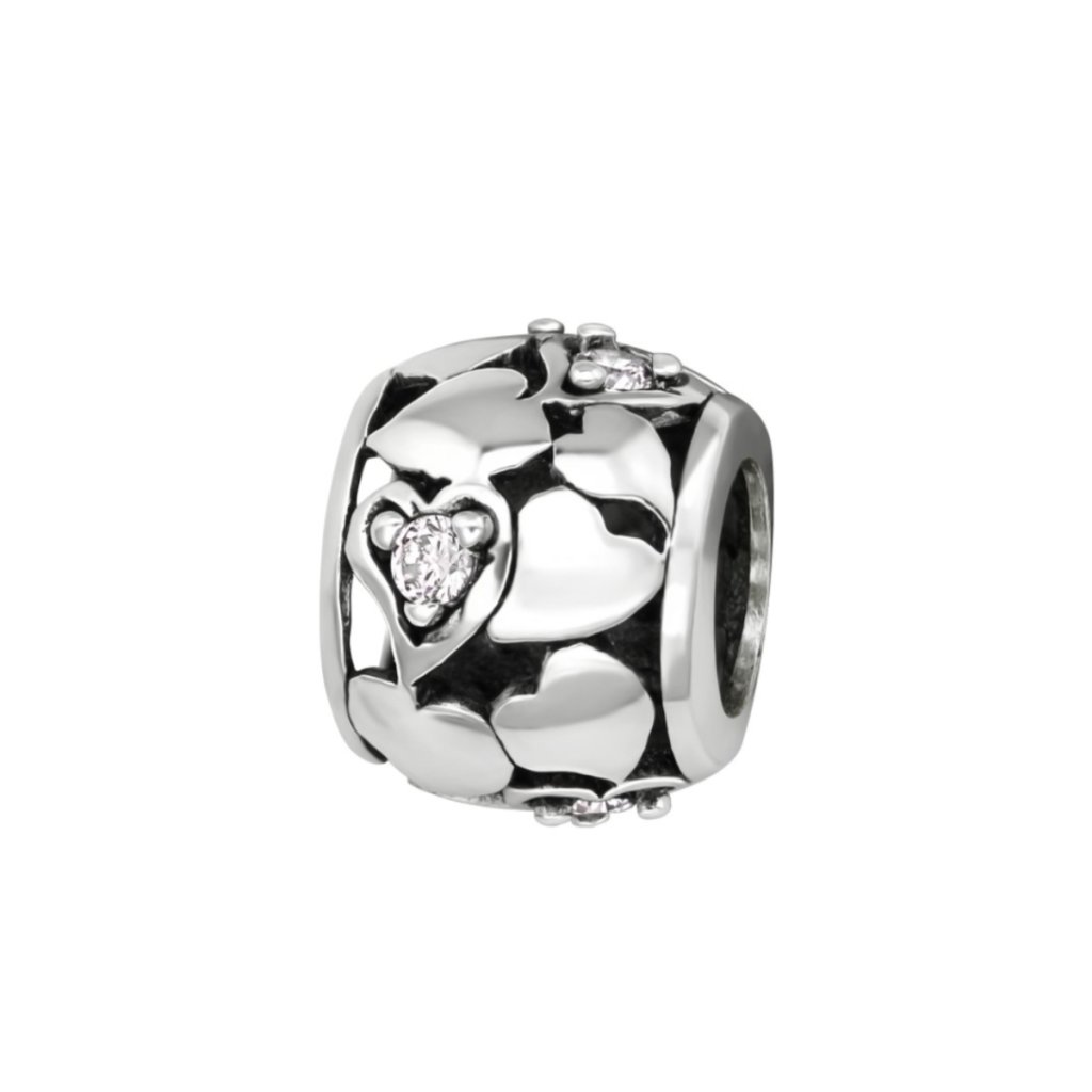 Srebrny koralik HEARTS z bezbarwnymi cyrkoniami z kolekcji MAY STORY to piekny symbol milosci i oddania. Ten elegancki wisiorek z czystego srebra proby 925/1000 zdobi delikatny motyw serduszek, z ktorych niektore sa wysadzane blyszczacymi bezbarwnymi cyrkoniami, nadajacymi bizuterii luksusowy wyglad i czarujacy blask.