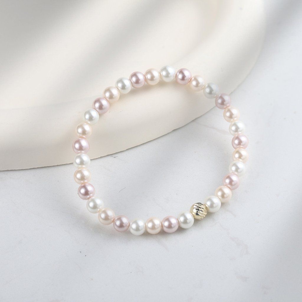 Bransoletka ozdobiona jest syntetycznymi perłami o średnicy 6 mm w subtelnych odcieniach bieli, perłowym i romantycznych tonach, które wyglądają bardzo delikatnie i kobieco. Długość bransoletki 18 cm umożliwia wygodne noszenie i idealne dopasowanie do nadgarstka. Subtelna pozłacana kulka dodaje biżuterii delikatnego, eleganckiego akcentu.