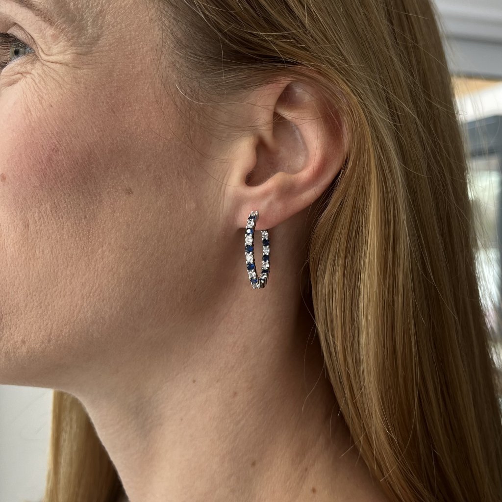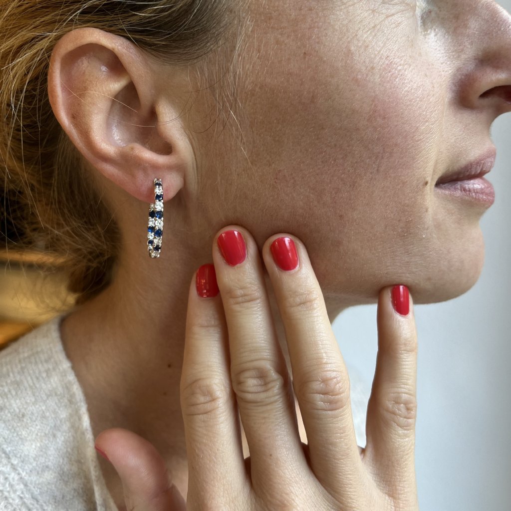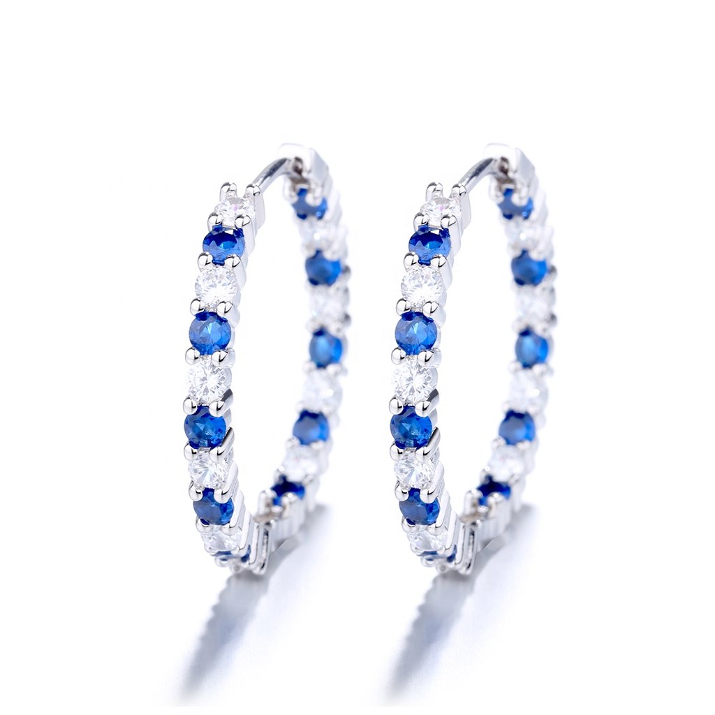Wkrocz do świata elegancji i wyrafinowania dzięki tym fascynującym srebrnym kolczykom w kształcie koła, które są ozdobione przezroczystymi i niebieskimi cyrkoniami sześciennymi. Ten uroczy dodatek z naszej kolekcji wykonany jest ze srebra próby 925.