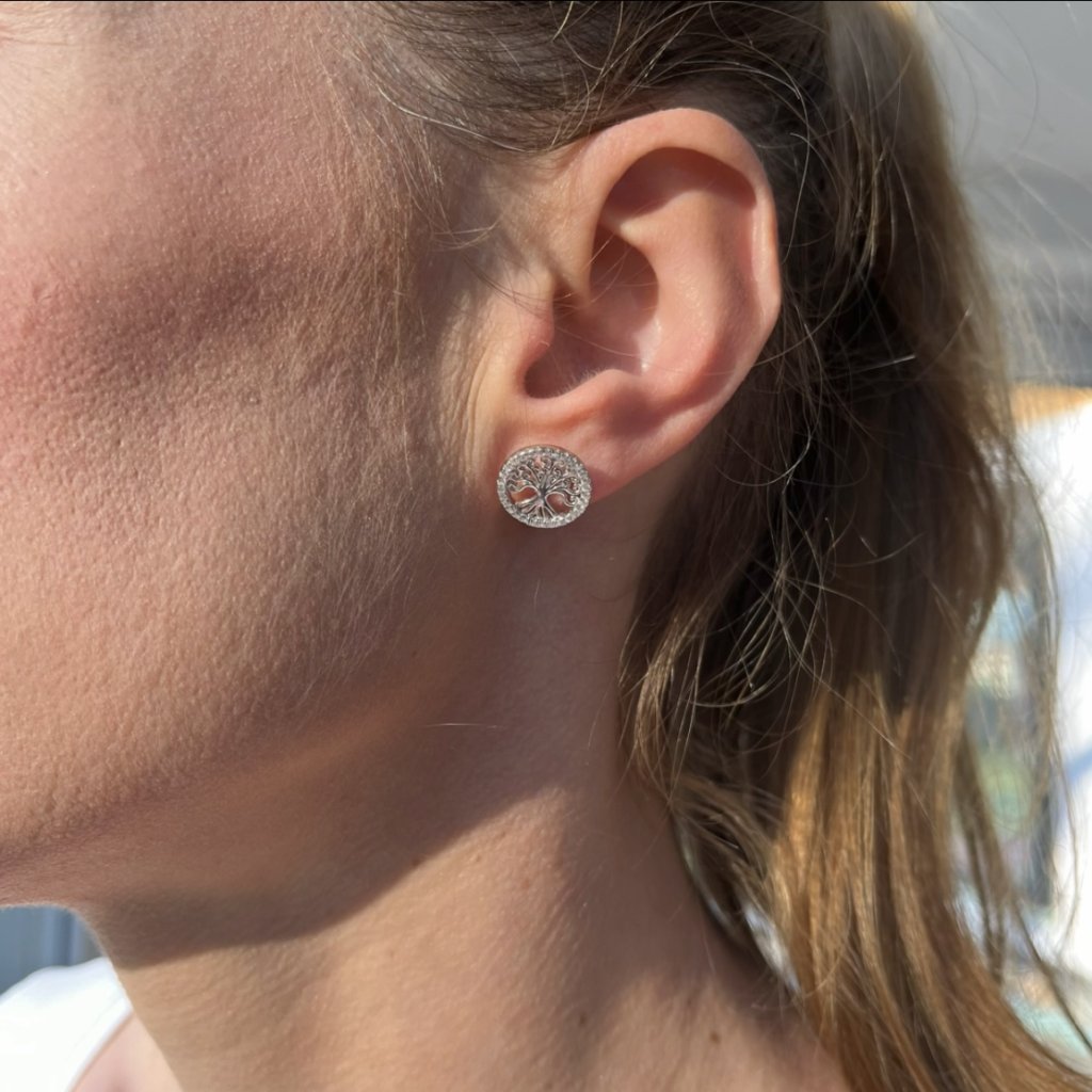 Każdy szczegół tych kolczyków jest perfekcyjnie wykonany. Okrąg wokół drzewa jest wysadzany błyszczącymi cyrkoniami, które dodają klejnotowi dodatkowego blasku i piękna.