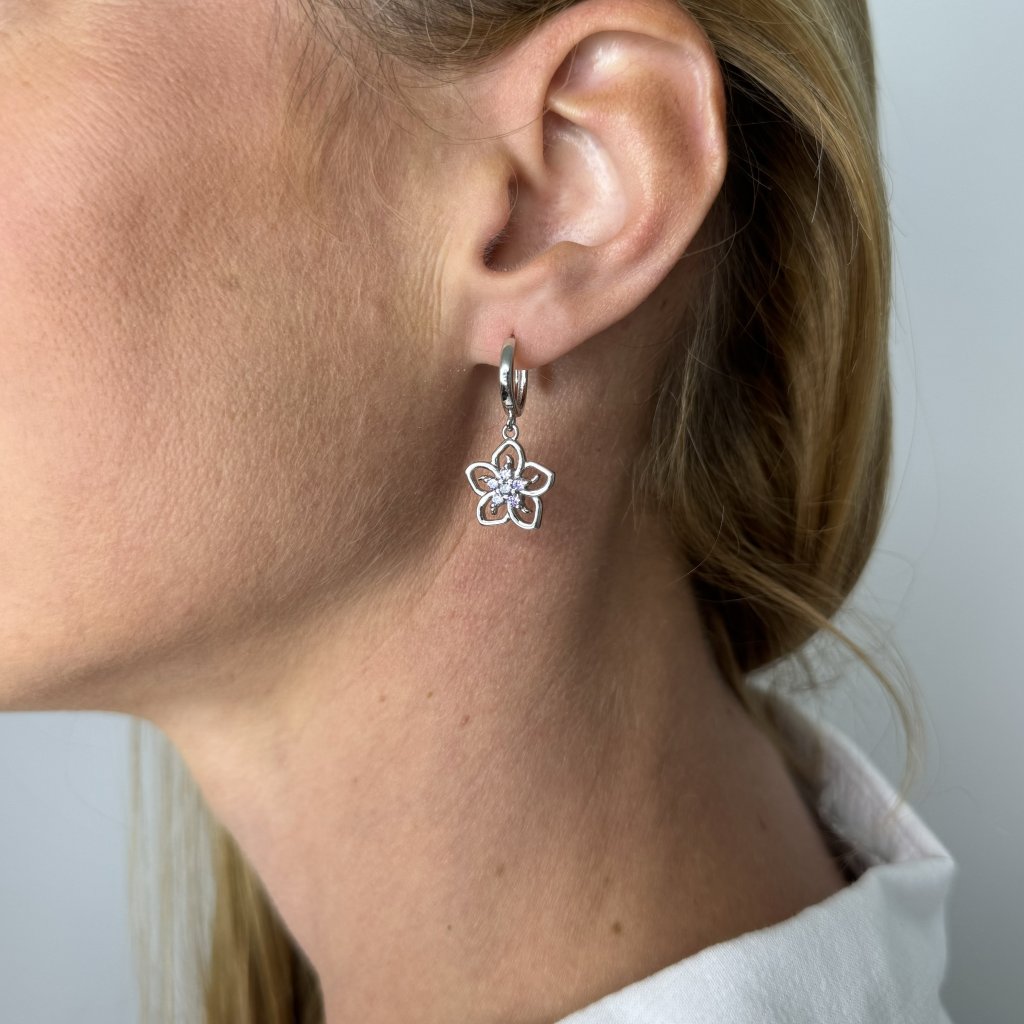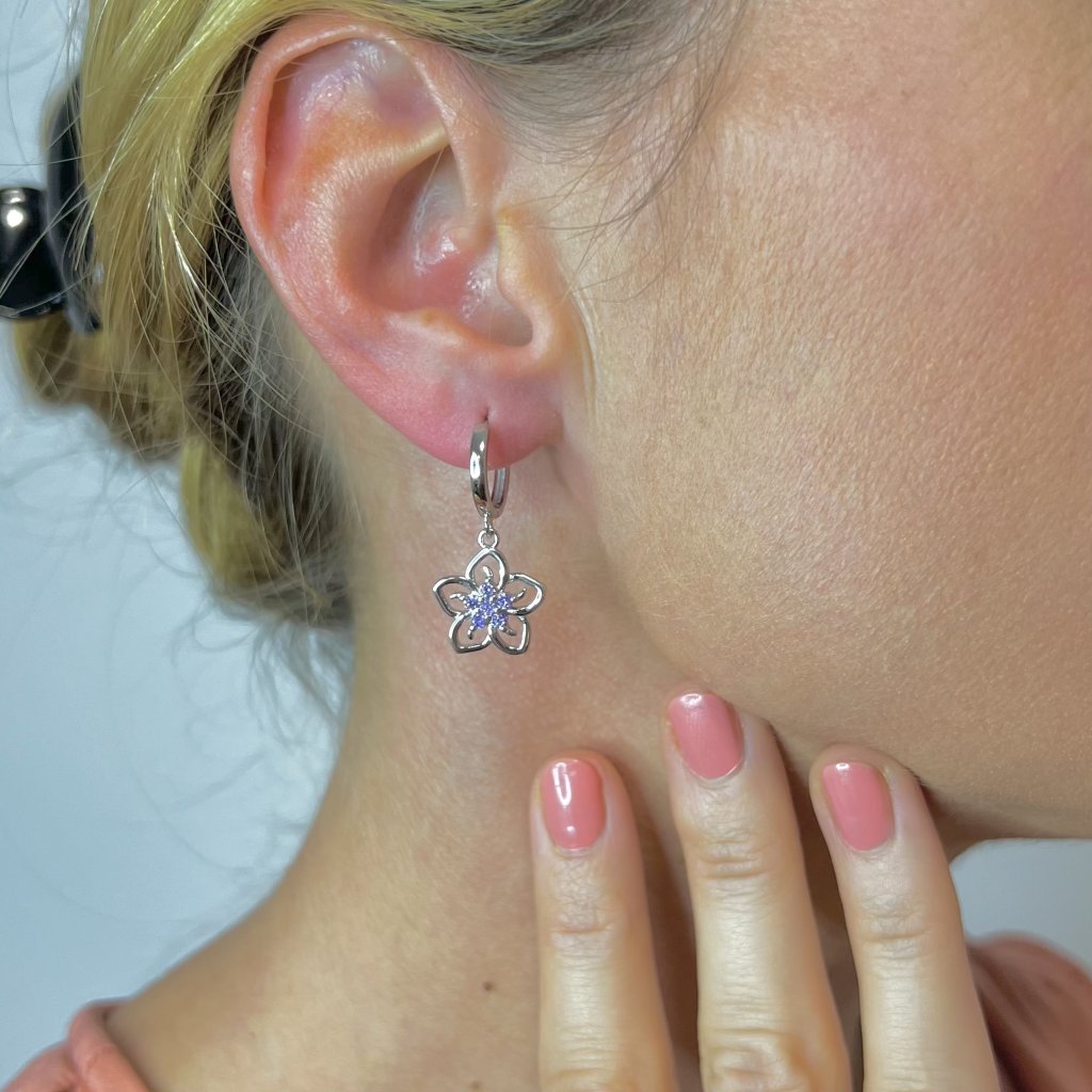 Wykonany ze srebra o próbie Ag925/1000 i ozdobiony pięknymi fioletowymi cyrkoniami sześciennymi, które nadają kwiatowi żywy i uroczy wygląd. Kolczyki są pokryte rodem dla długotrwałego połysku i odporności na zużycie. Średnica kwiatu wynosi 14 mm, a średnica pierścienia 13 mm, co czyni je idealnymi do noszenia na co dzień i na specjalne okazje.