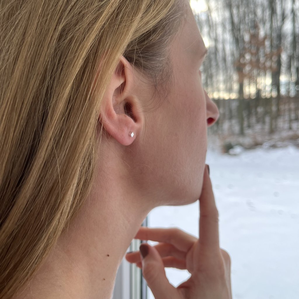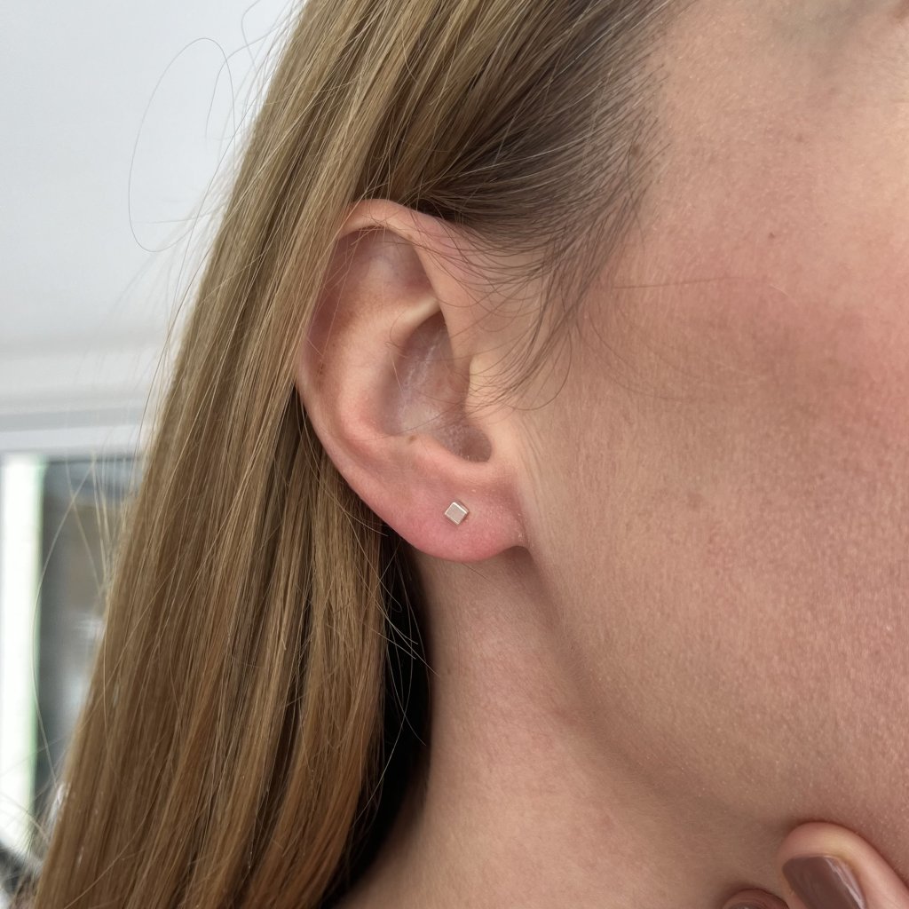 Kolczyki zostały zaprojektowane w uniwersalnym, minimalistycznym kształcie sześcianu o wymiarach 2x2 mm, który jest idealnym rozmiarem do noszenia na co dzień. Są to czółenka z zapięciem na guziki, co gwarantuje wygodne dopasowanie.