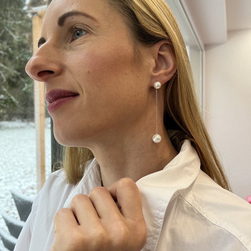 Wykonany z najwyższej próby srebra 925, każdy kolczyk jest gustownie ozdobiony dwiema białymi perłami, które są połączone delikatnym łańcuszkiem, zapewniając idealną równowagę między klasycznym i nowoczesnym designem.