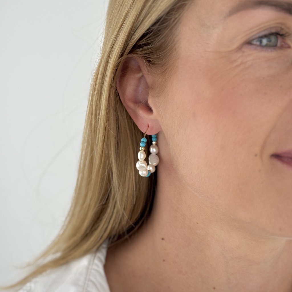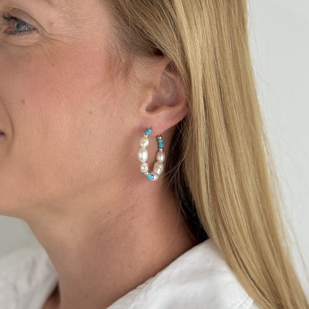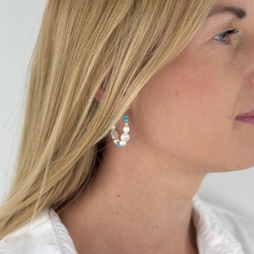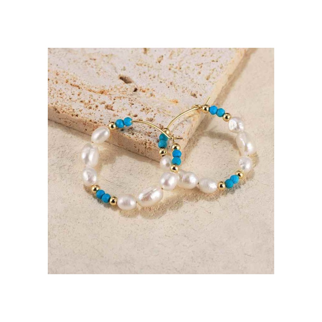 Okrągły kształt o średnicy 30 mm i szerokości 6 mm stanowi idealną platformę dla naprzemiennych pereł i turkusów, które tworzą fascynującą harmonię kolorów. Perłowy połysk pereł w kontraście z żywym turkusowym kolorem na złotej podstawie nadaje kolczykom odrobinę egzotyki i wyrafinowania.