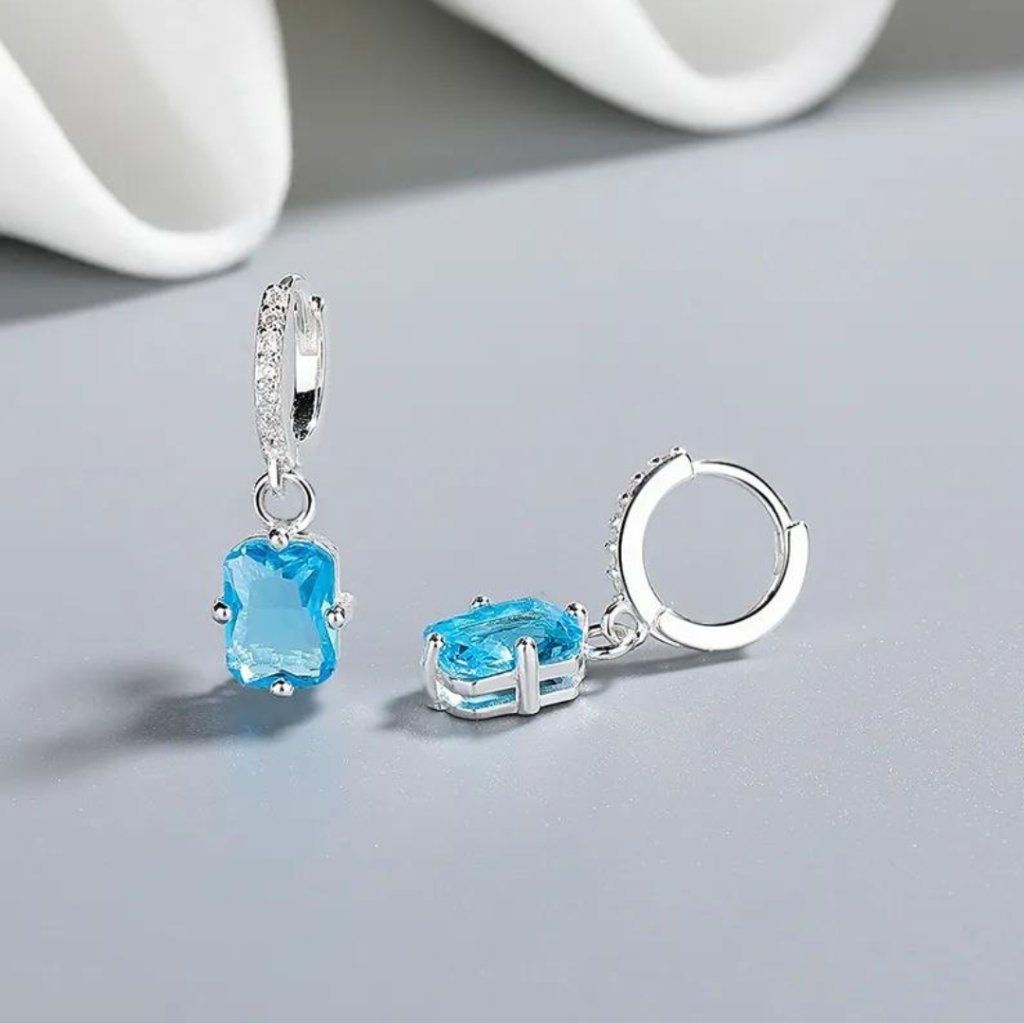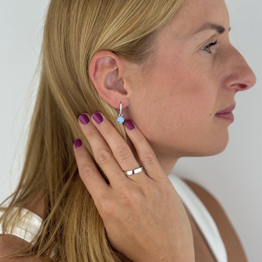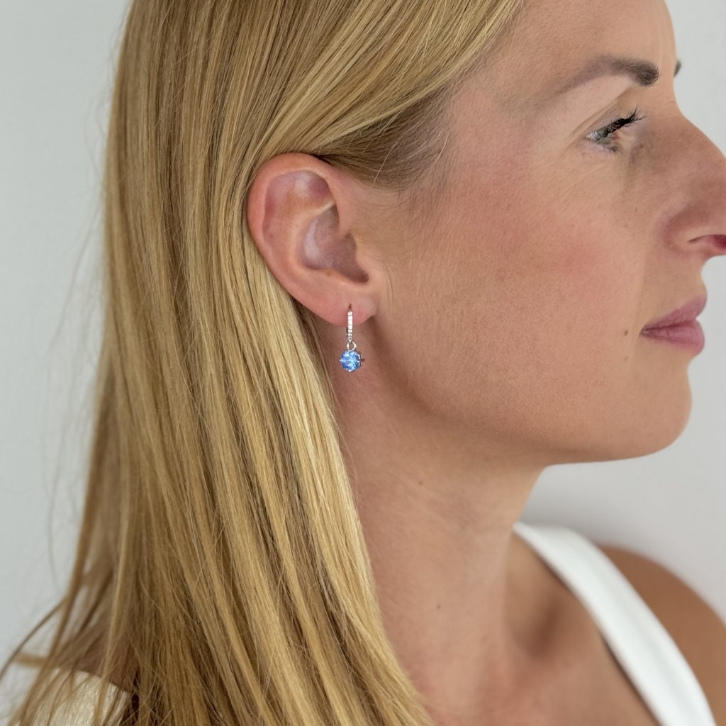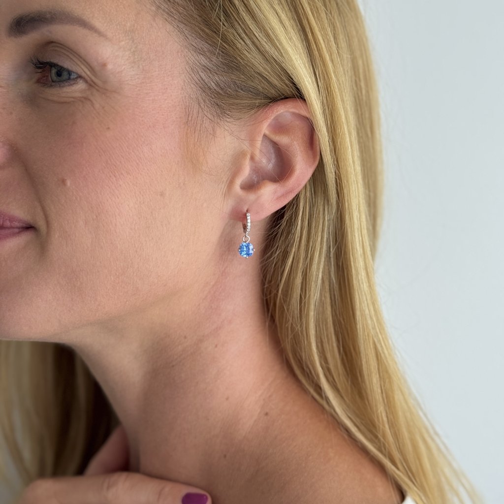 Głównym elementem są okrągłe kolczyki o średnicy 11 mm, które dookoła wysadzane są błyszczącymi, przezroczystymi cyrkoniami sześciennymi. Niebieska sześcienna cyrkonia zwisa z wdziękiem z tych kolczyków, dodając im odrobinę świeżości i lekkości.