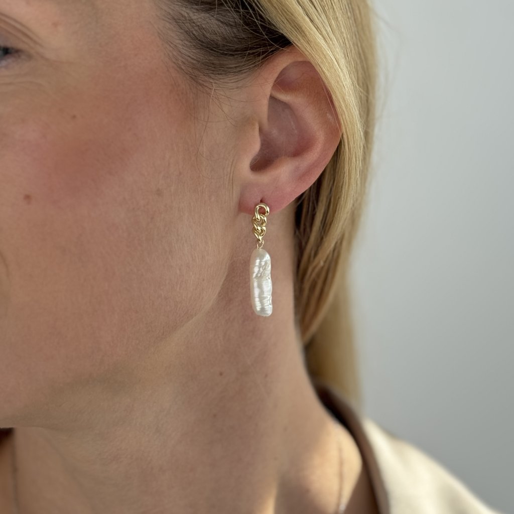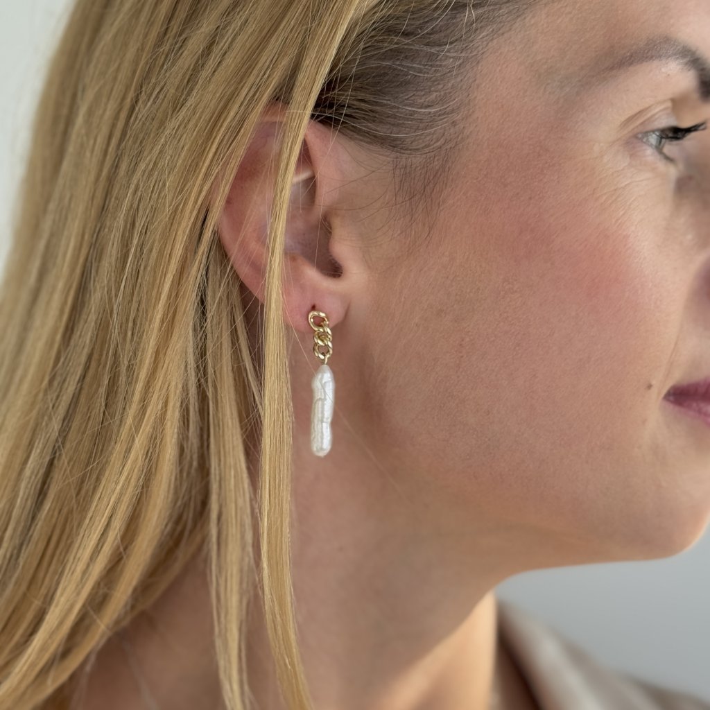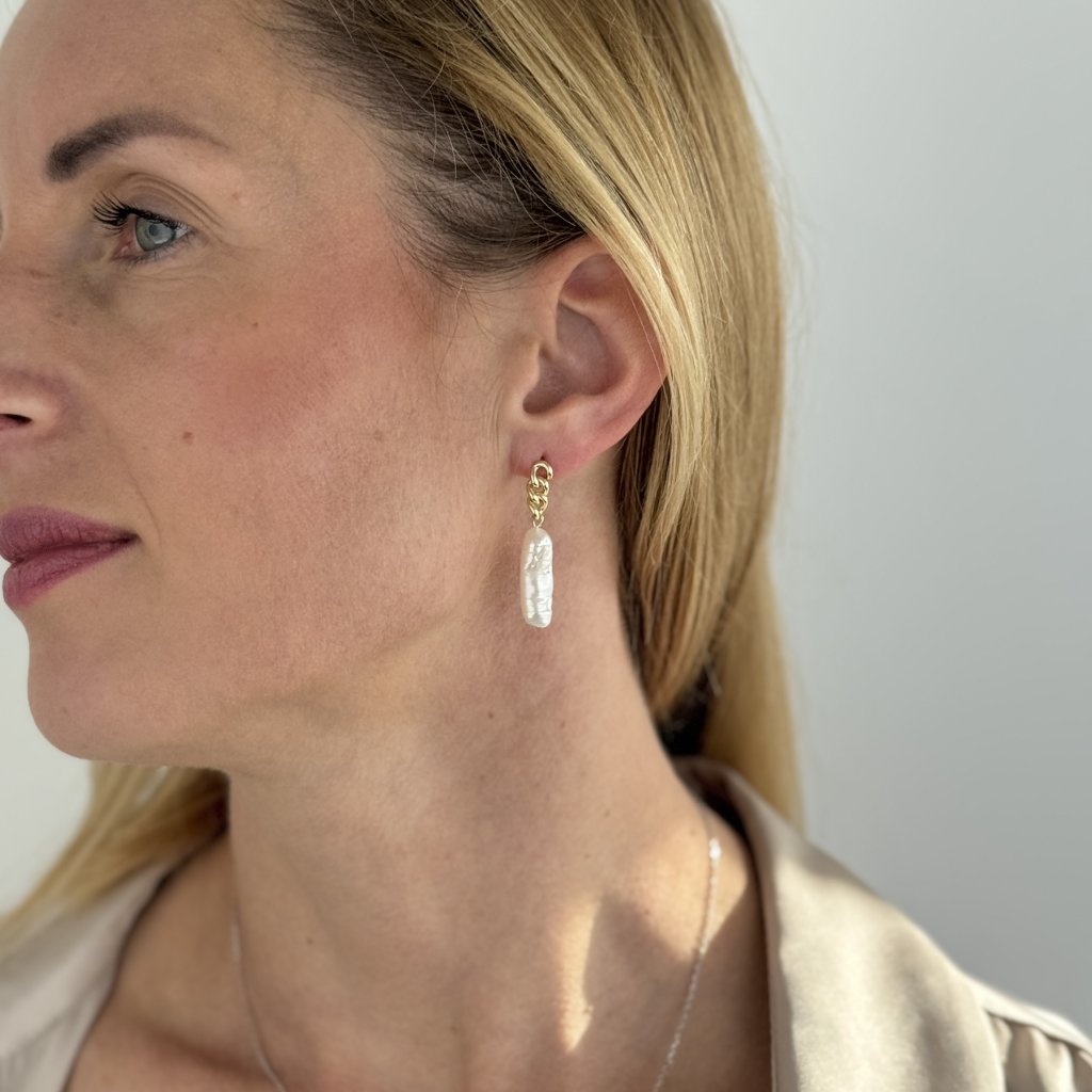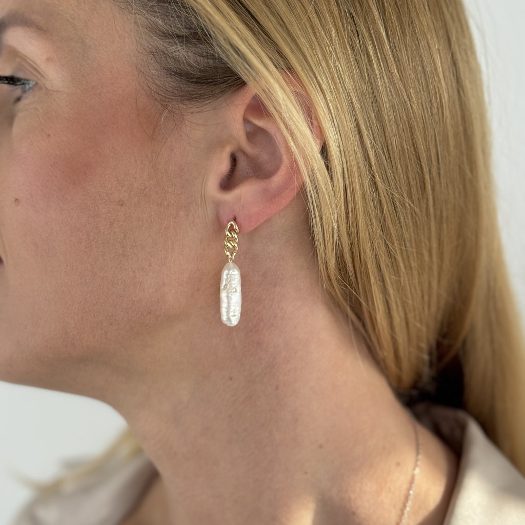 Całkowita długość 30 mm sprawia, że kolczyki prezentują się w wyrafinowany sposób. Dominującym elementem każdego kolczyka jest wyjątkowa perła o wymiarach 5 × 22 mm, zawieszona na łańcuszku. Każda perła ma swój własny, charakterystyczny kształt, co czyni każdą parę kolczyków unikatową.