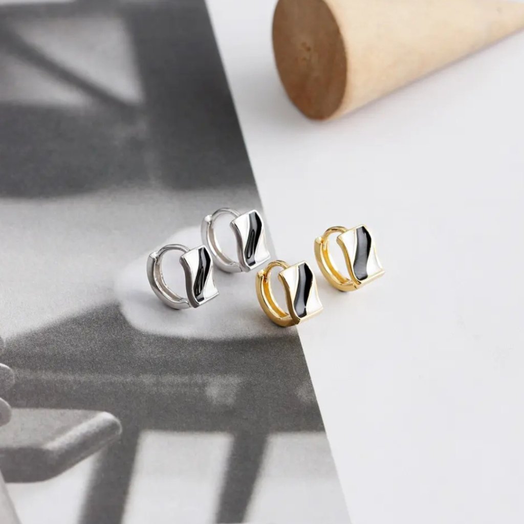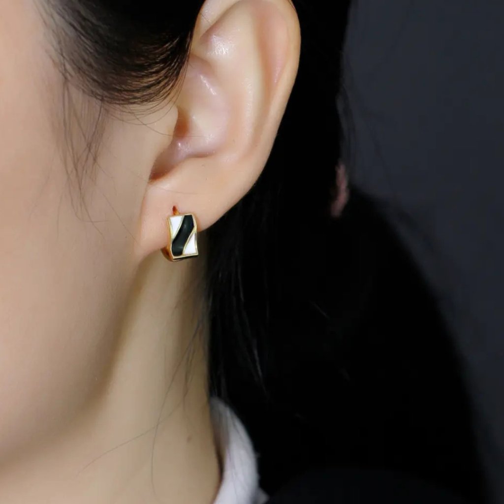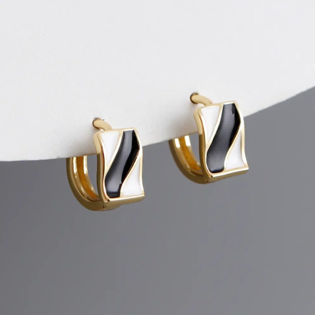 Dzięki średnicy kółka 11 mm i wymiarom detalu 6 × 9 mm kolczyki są doskonale wyważone i wygodne do noszenia przez cały dzień. Czarno-białe elementy emaliowane tworzą efektowny kontrast ze złotą powierzchnią. Bezpieczne zapięcie na zawias zapewnia, że kolczyki pewnie trzymają się na swoim miejscu.