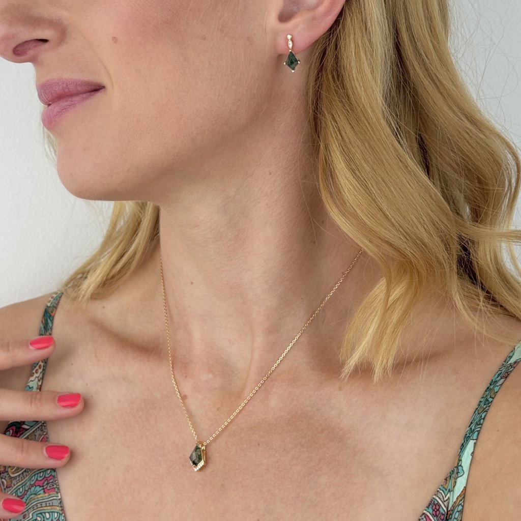 Kolczyki RENEWAL z agatem mszystym to doskonała symbioza luksusu i naturalnego piękna. Pozłacane srebro próby 925/1000 tworzy urzekający kontrast z unikalnym agatem mszystym, który skrywa tajemnicze zielone ogrody. Każdy kamień jest absolutnym oryginałem, co czyni te kolczyki naprawdę wyjątkowymi.