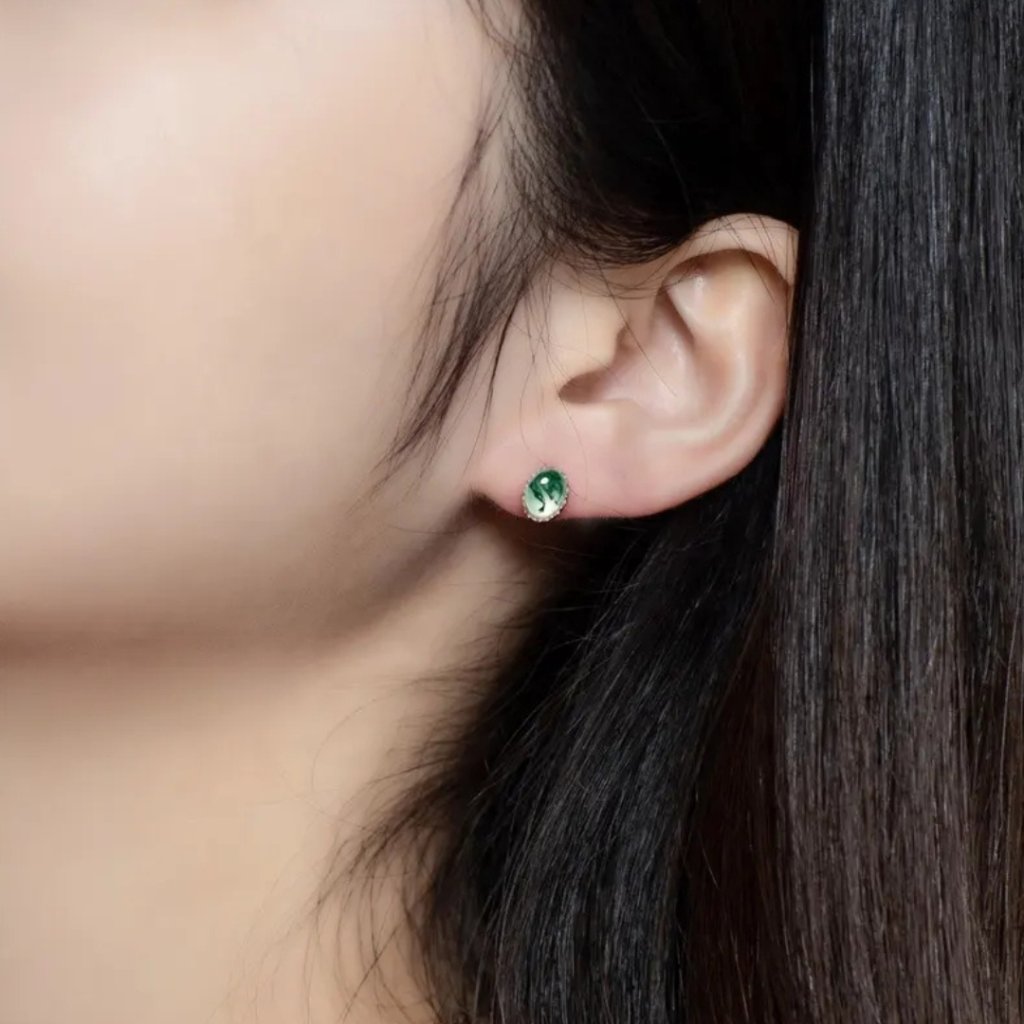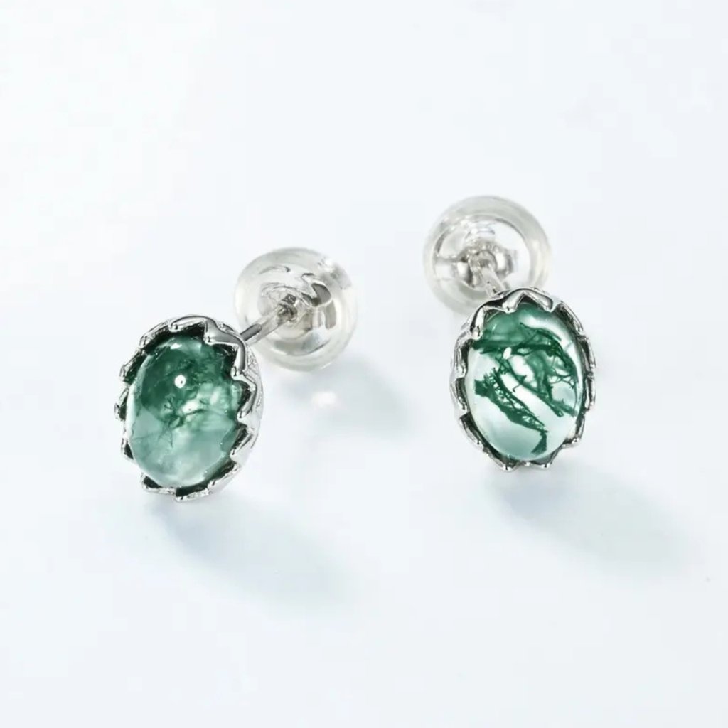 Kolczyki QUIET z agatem mszystym to doskonała harmonia między prostotą a naturalnym pięknem. Każdy agat mszysty o wymiarach 5 × 7 mm jest absolutnie unikatowy, z zielonymi wzorami przypominającymi tajemnicze leśne krajobrazy, co czyni te kolczyki prawdziwie oryginalną biżuterią.