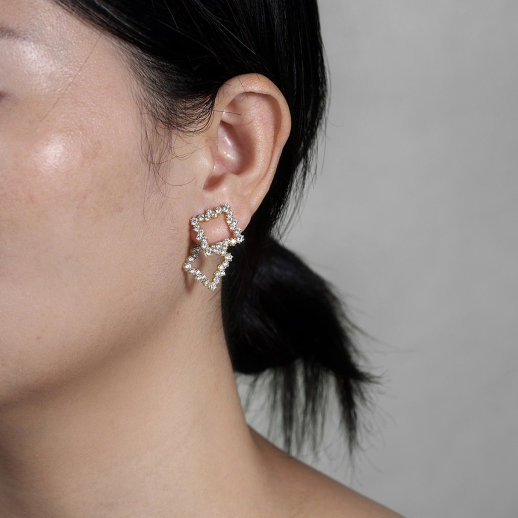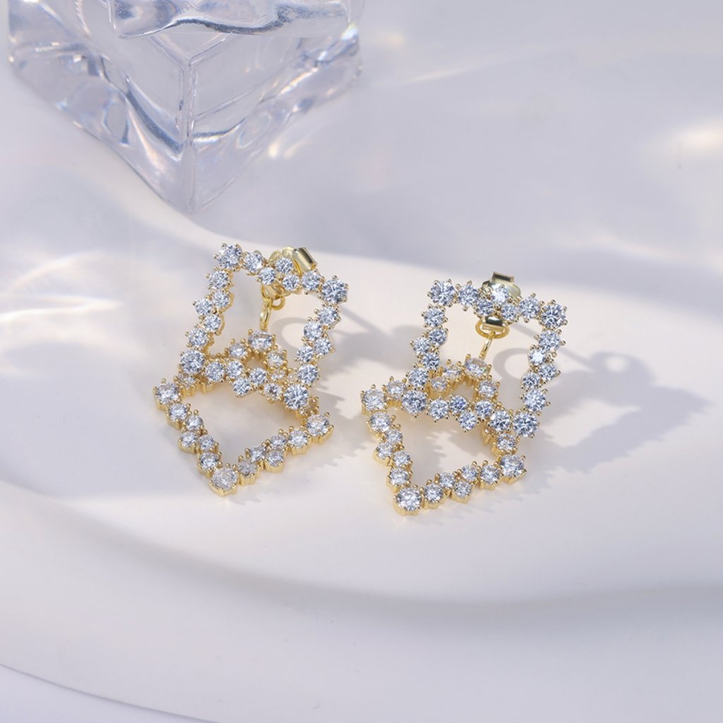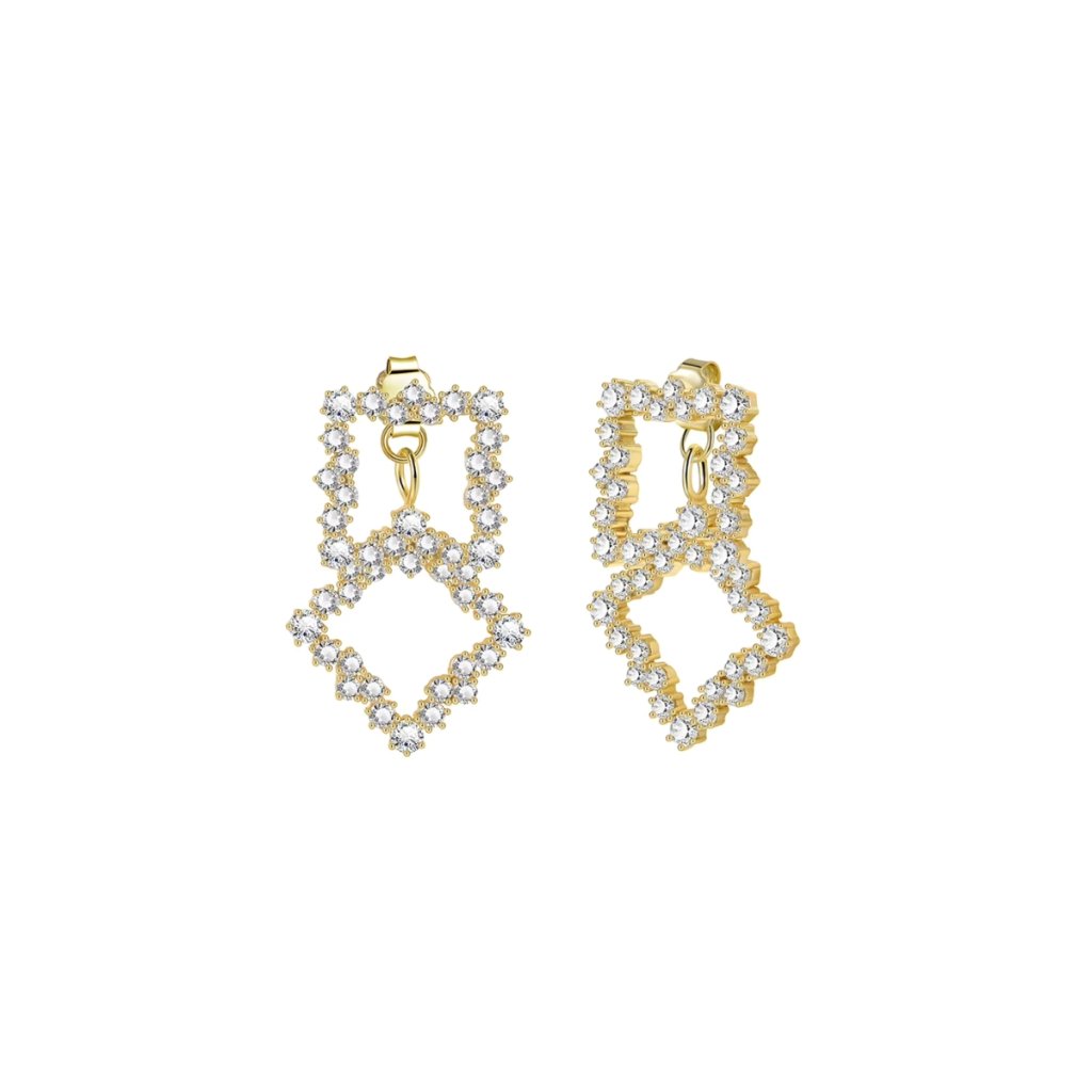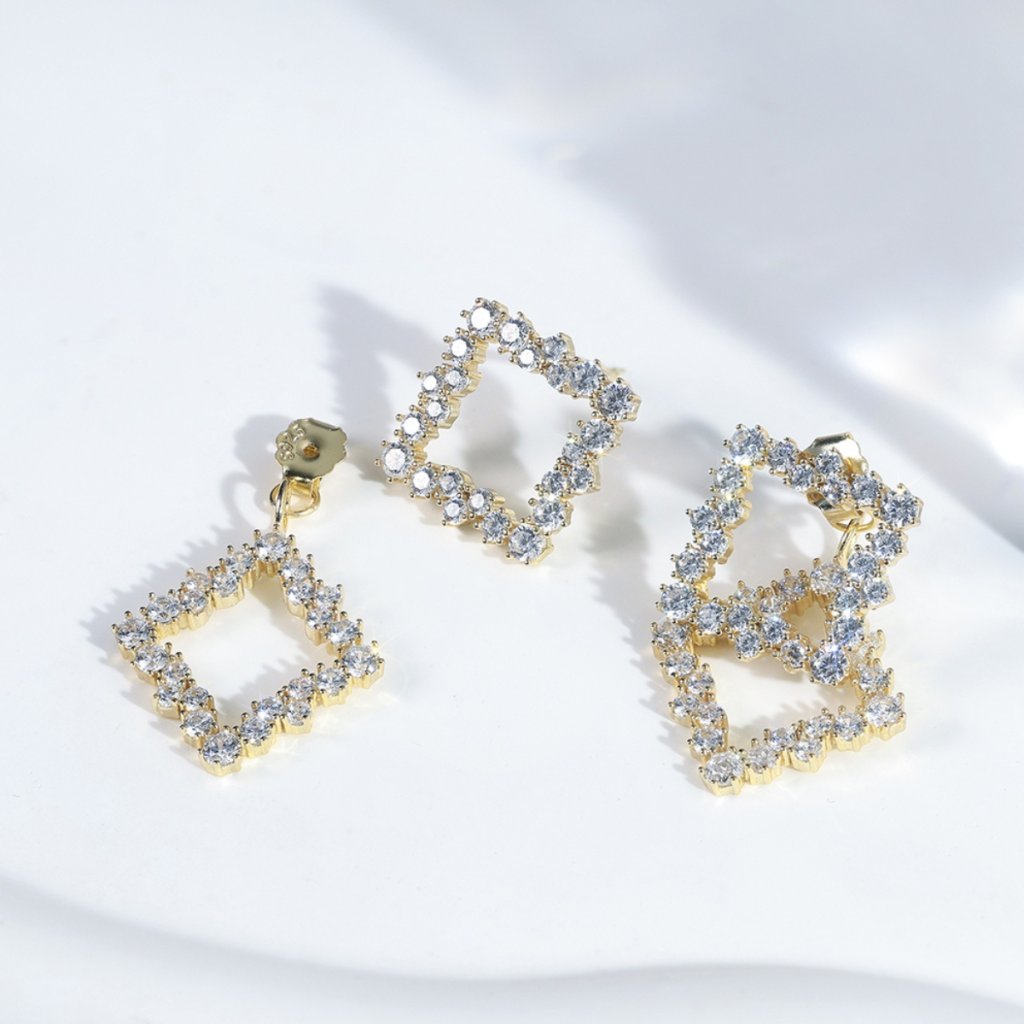 Kolczyki wykonane są z czystego srebra 925/1000 pokrytego 14-karatowym złotem, która zapewnia piękny ciepły odcień złota, długotrwały połysk i ochronę przed utlenianiem. Kwadratowy element o wymiarach 14 × 14 mm jest bogato osadzony przezroczystymi cyrkoniami, które tworzą olśniewający efekt migotania i odbijają światło pod każdym kątem.