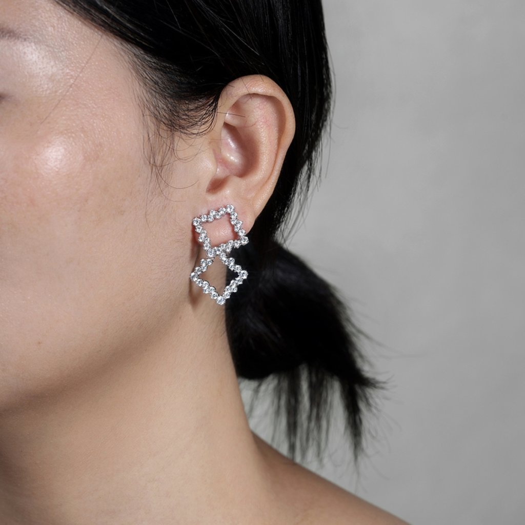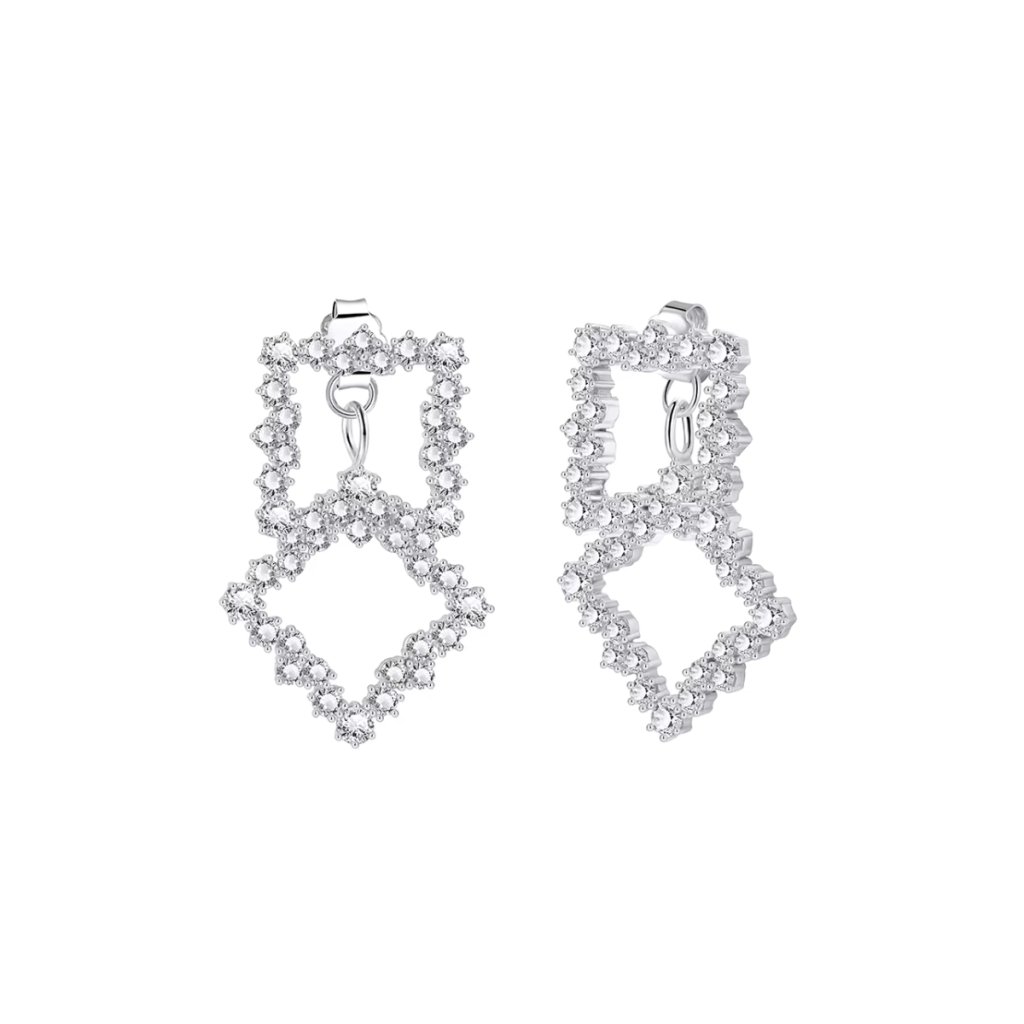 Kolczyki mają wiszący fason z wygodnym zapięciem na sztyft, co gwarantuje bezpieczne i komfortowe noszenie. Centralnym elementem jest błyszczący kwadratowy motyw o wielkości 14 × 14 mm, uzupełniony doskonale oszlifowanymi cyrkoniami, które pięknie odbijają światło przy każdym ruchu.