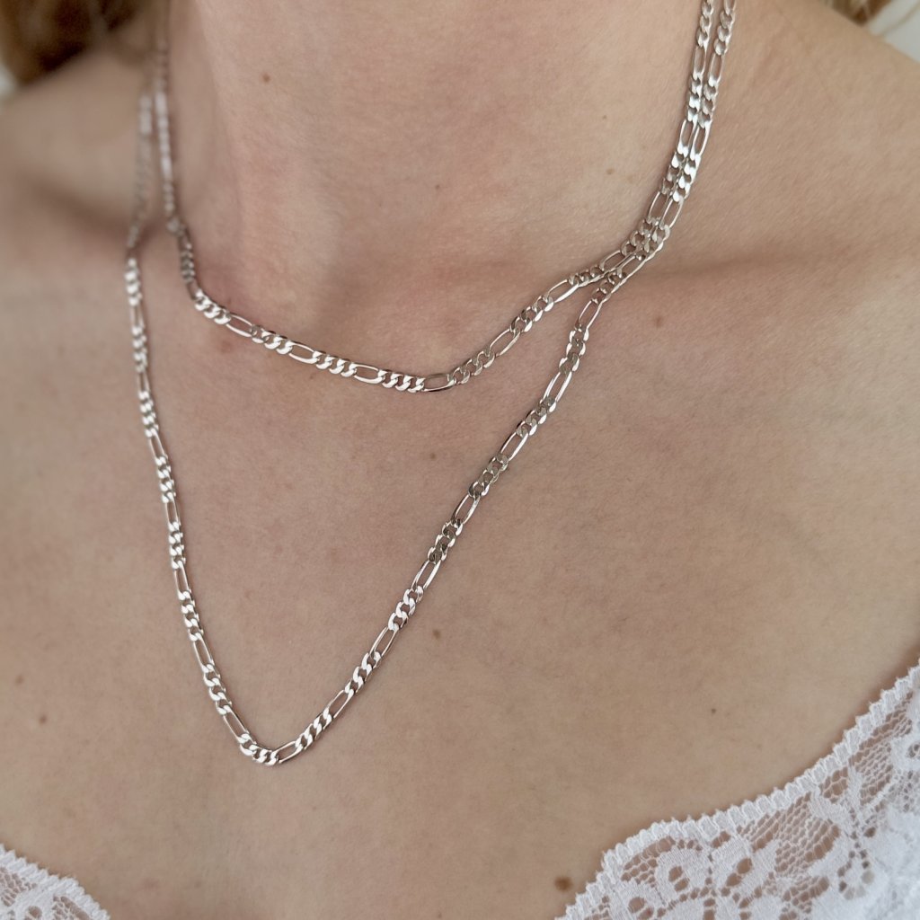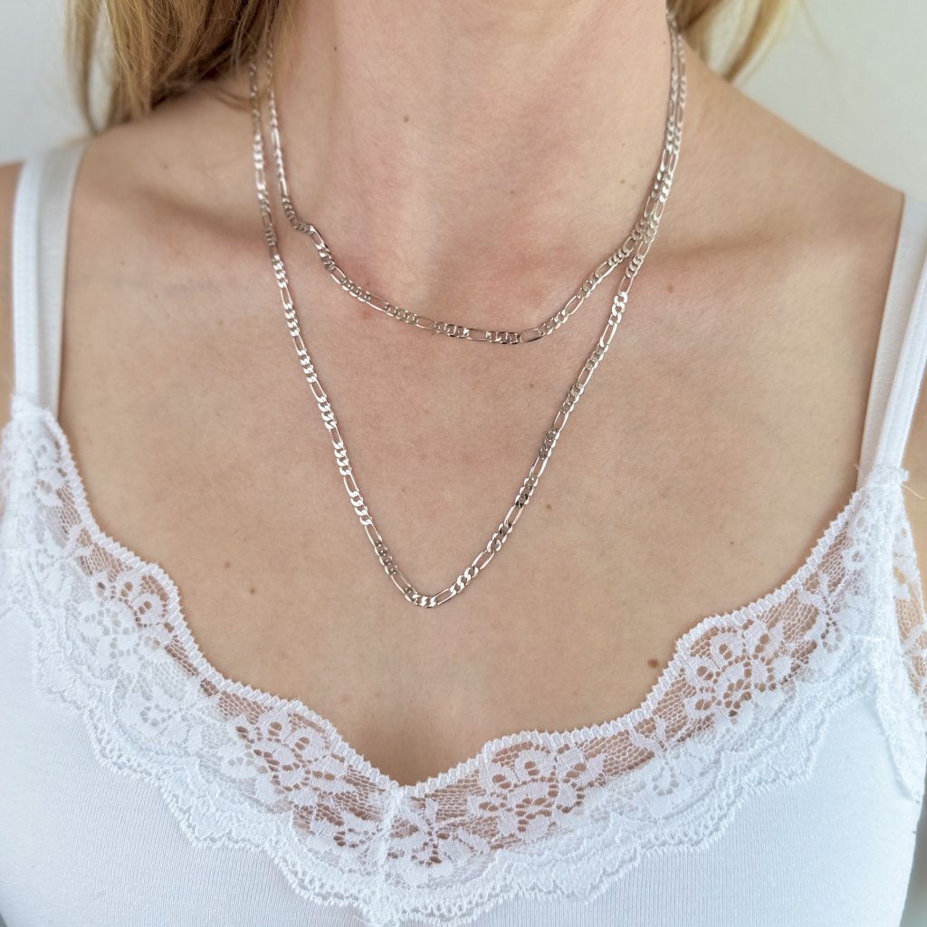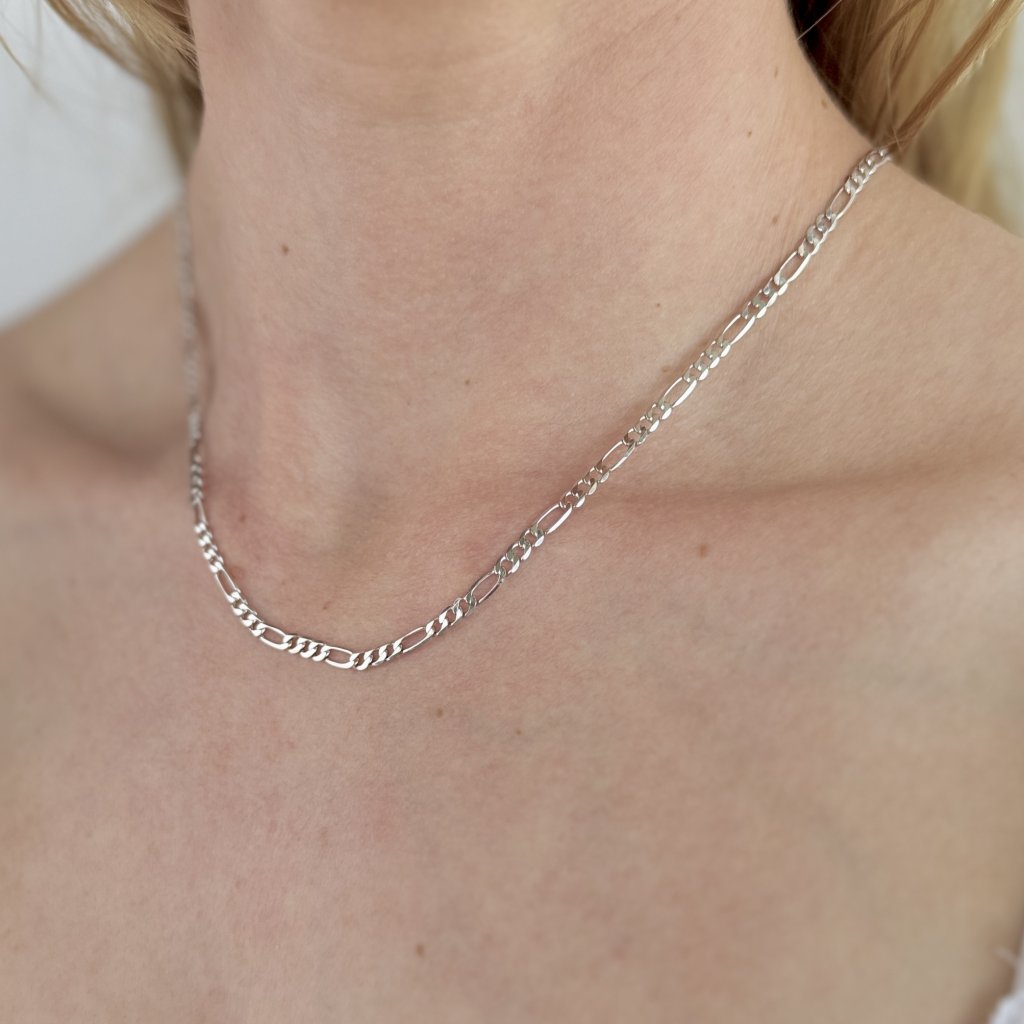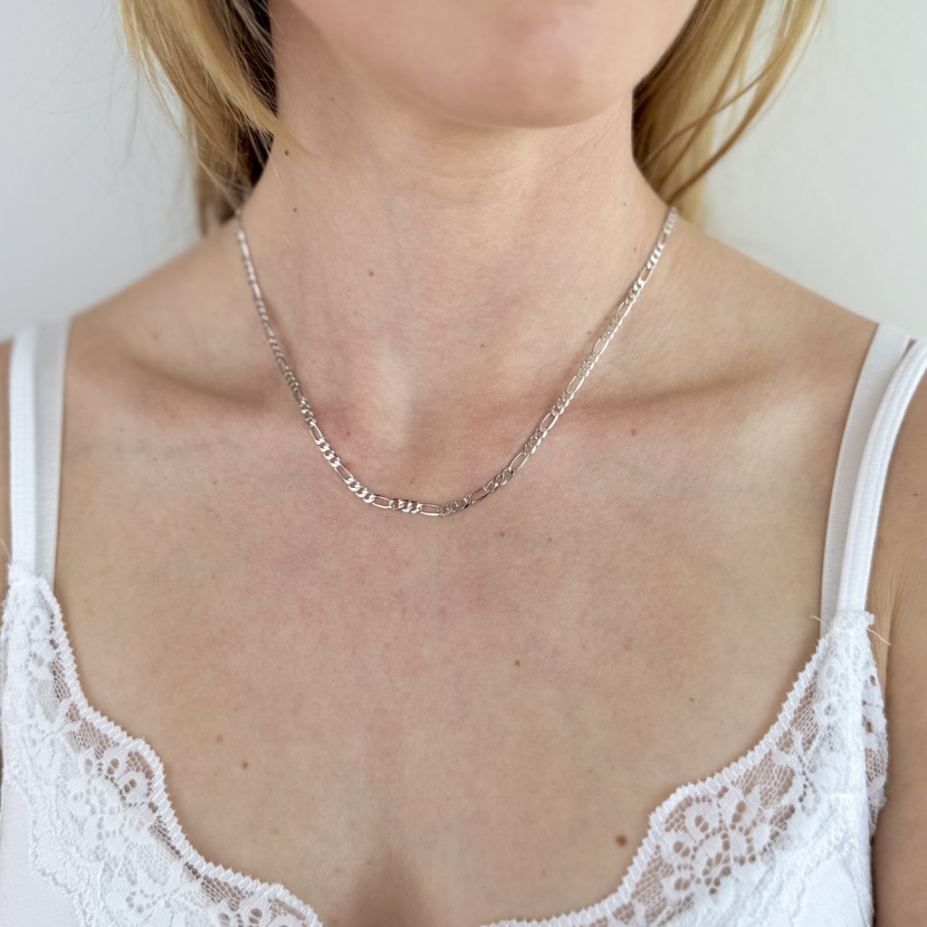 Srebrny łańcuszek HAMIS typu Figaro to doskonałe połączenie siły i elegancji. O szerokości 3,3 mm i długości 45 cm tworzy wyrazisty wygląd, który nie pozostanie niezauważony. Klasyczny wzór Figaro dodaje łańcuszkowi osobistego charakteru i czyni go uniwersalnym dodatkiem na każdą okazję.