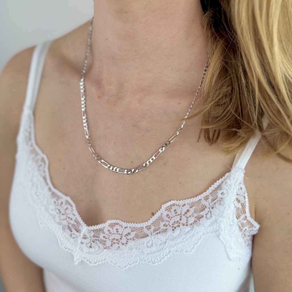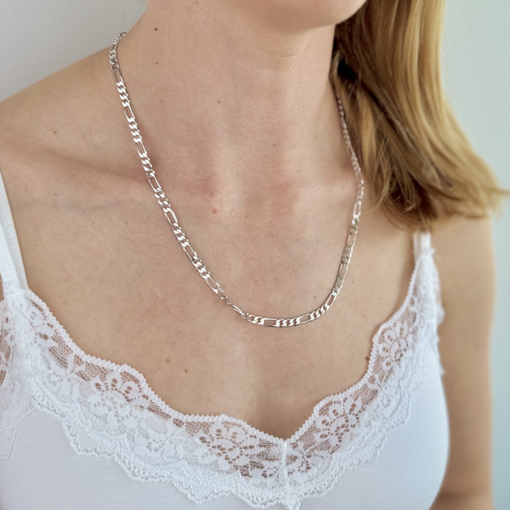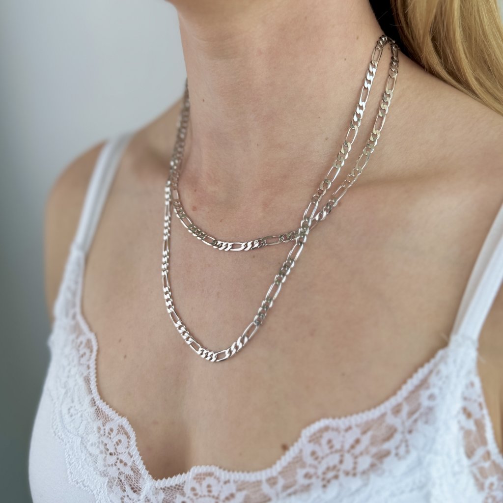 Srebrny łańcuszek HAMIS typu Figaro to prawdziwy król wśród masywnej biżuterii. Dzięki imponującej szerokości 5 mm i długości 55 cm tworzy dramatyczny wygląd, który przyciąga uwagę. Klasyczny wzór Figaro w połączeniu z masywnym wykonaniem czyni ten łańcuszek wyjątkowym elementem dla pewnych siebie osób.