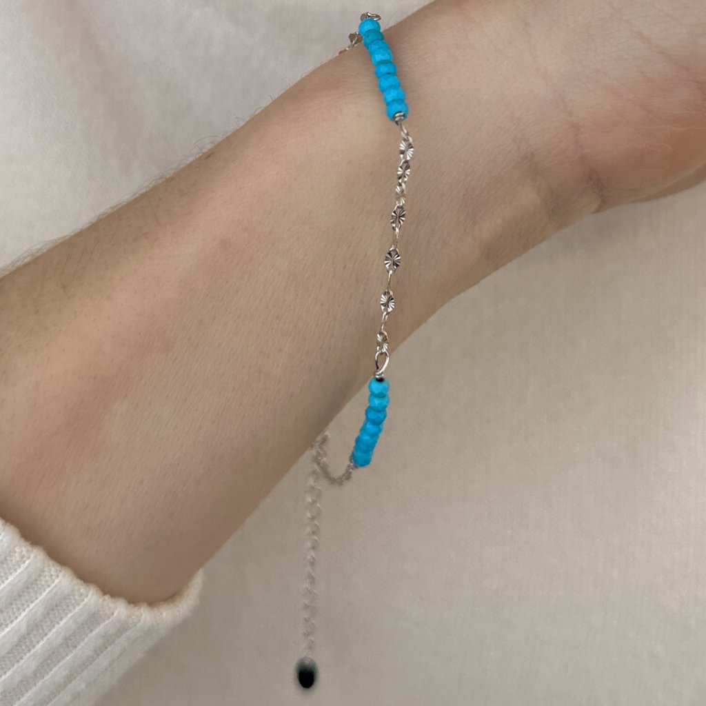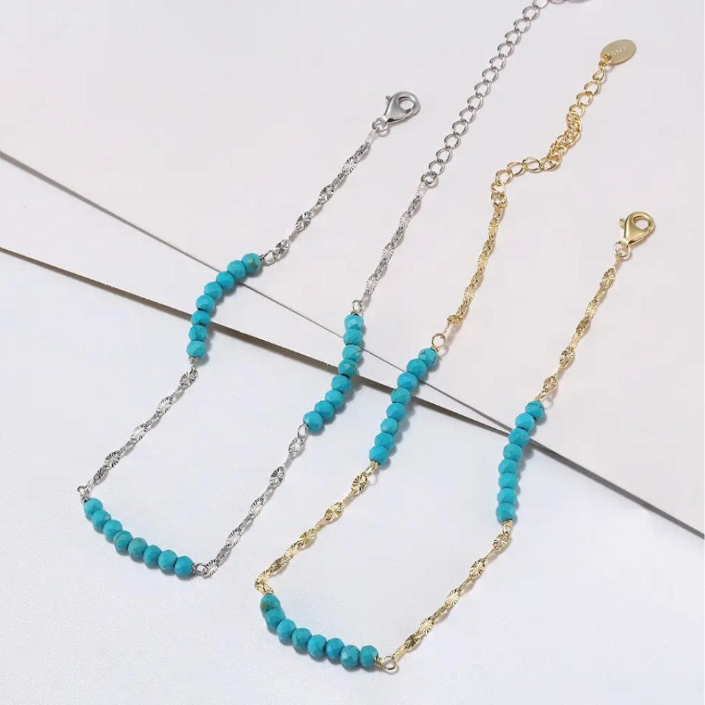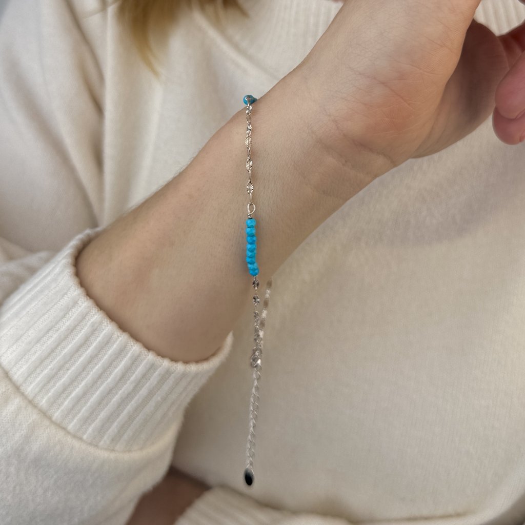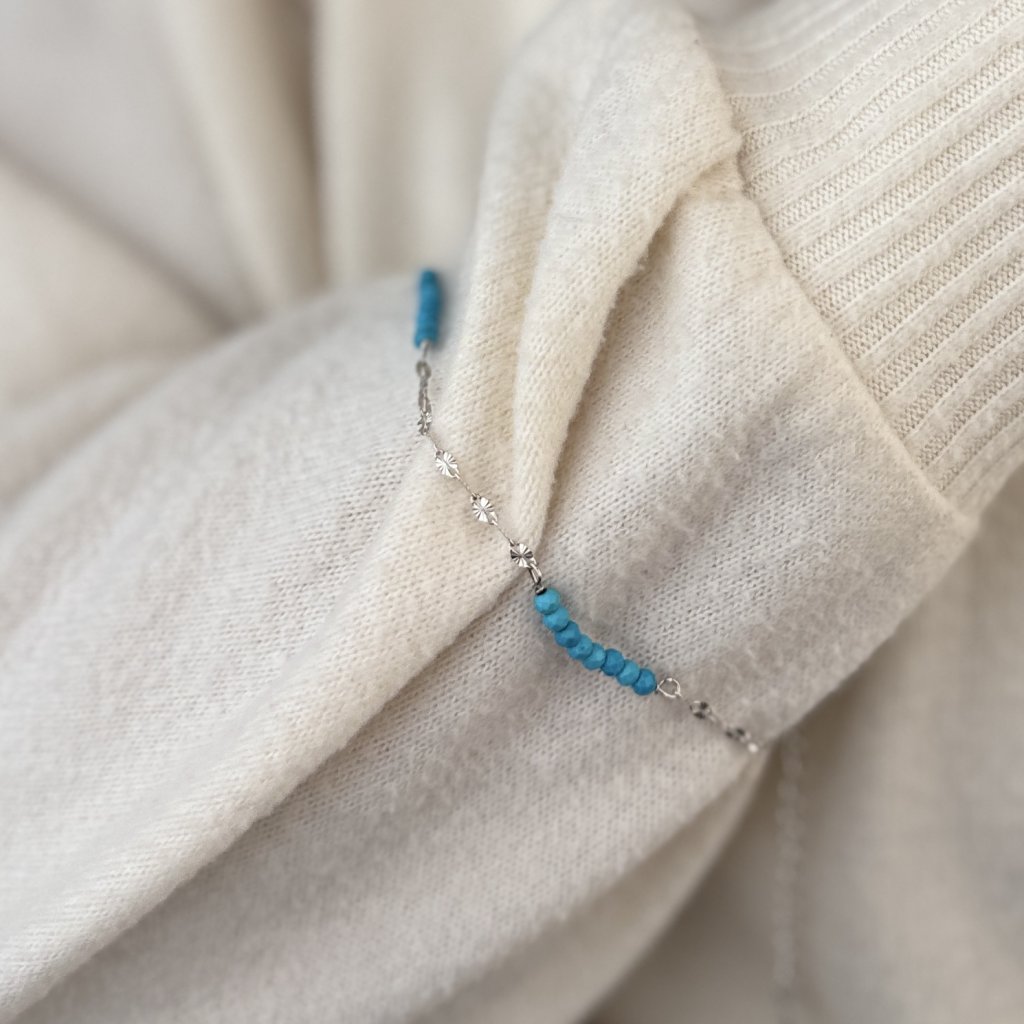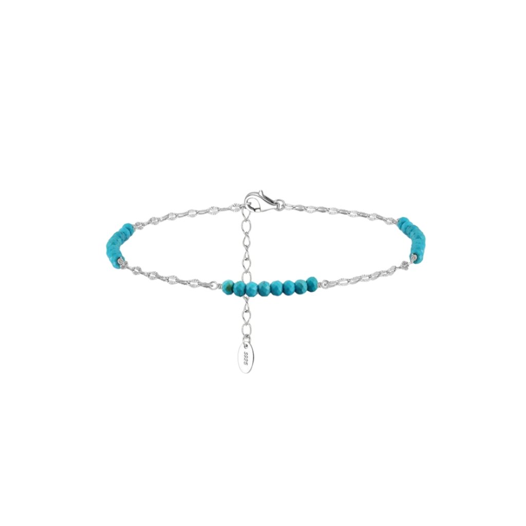Srebrny łańcuszek na nogę SHANNEN to uosobienie letniej elegancji i wyrafinowania. Wykonany z wysokiej jakości srebra próby 925/1000, ten klejnot zachwyca oryginalnym designem z drobnymi turkusami, które nadają bransoletce odrobinę egzotyki i świeżości.