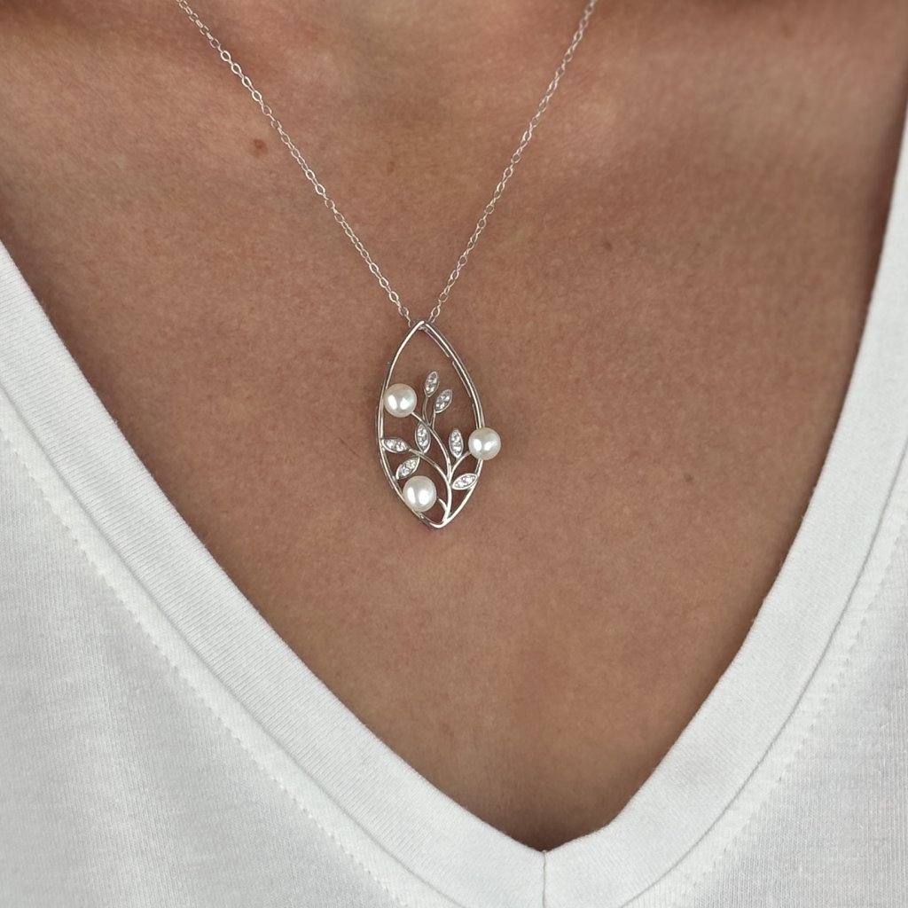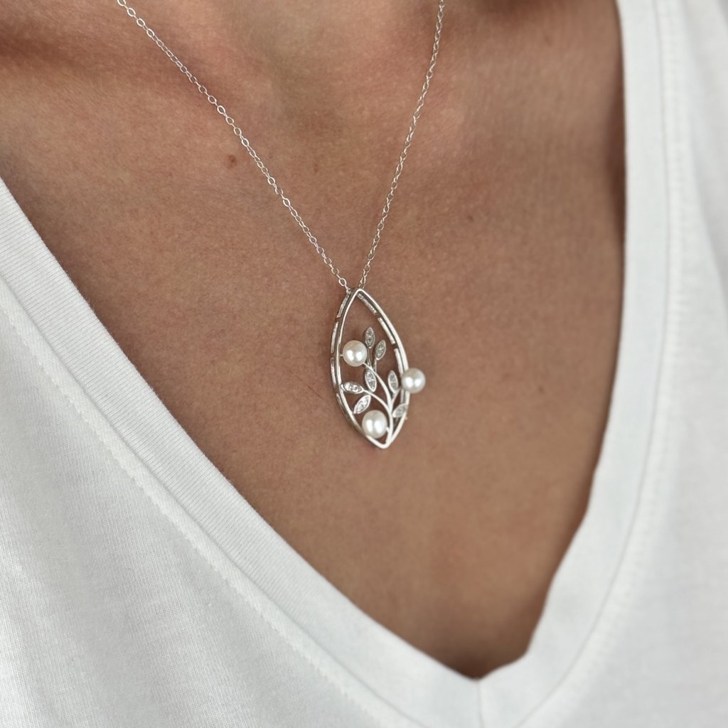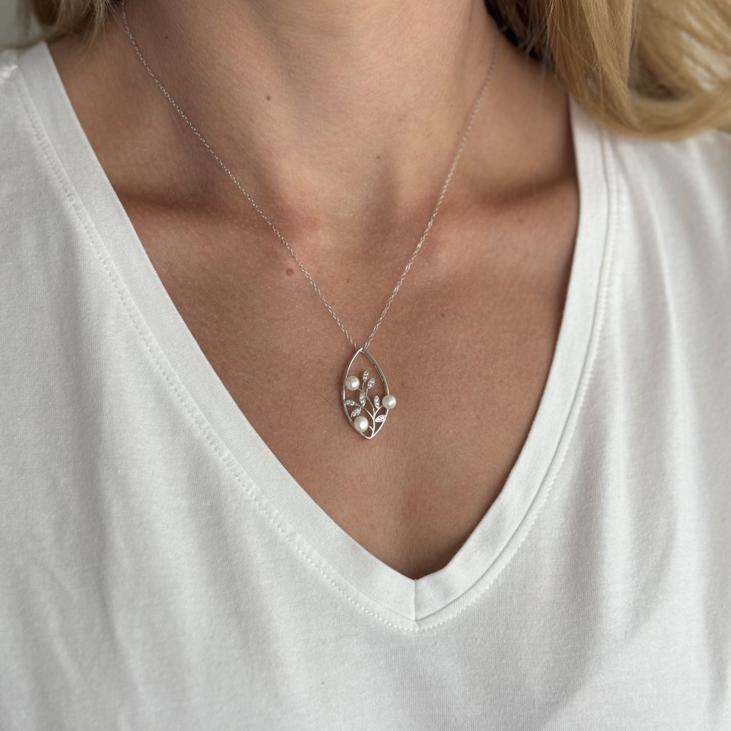 Wisiorek o wymiarach 30 × 15 mm przedstawia stylizowany listek, w którym wije się gałązka ozdobiona błyszczącymi cyrkoniami i delikatnymi perłami słodkowodnymi o średnicy 5 mm. Łańcuszek typu Link o długości 45 cm zapewnia wygodne noszenie i elegancki wygląd.