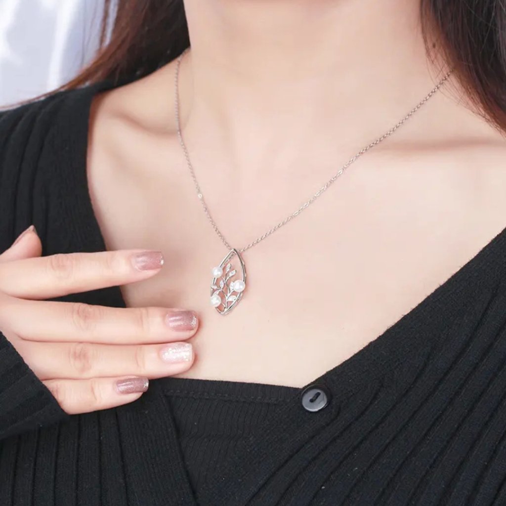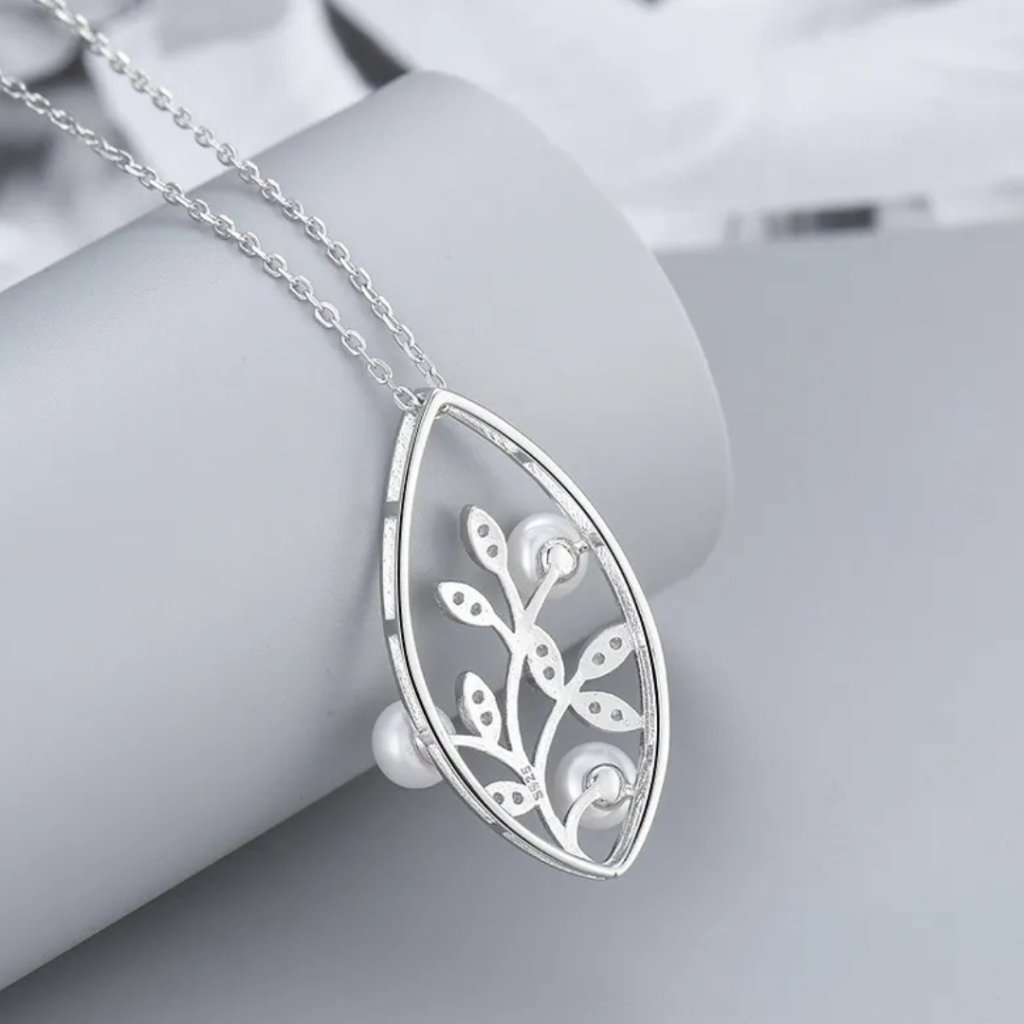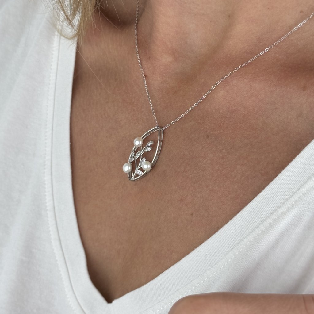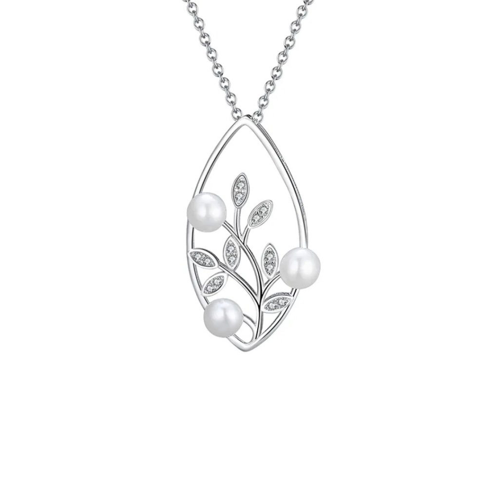 Wisiorek o wymiarach 30 × 15 mm przedstawia stylizowany listek, w którym wije się gałązka ozdobiona błyszczącymi cyrkoniami i delikatnymi perłami słodkowodnymi o średnicy 5 mm. Łańcuszek typu Link o długości 45 cm zapewnia wygodne noszenie i elegancki wygląd.