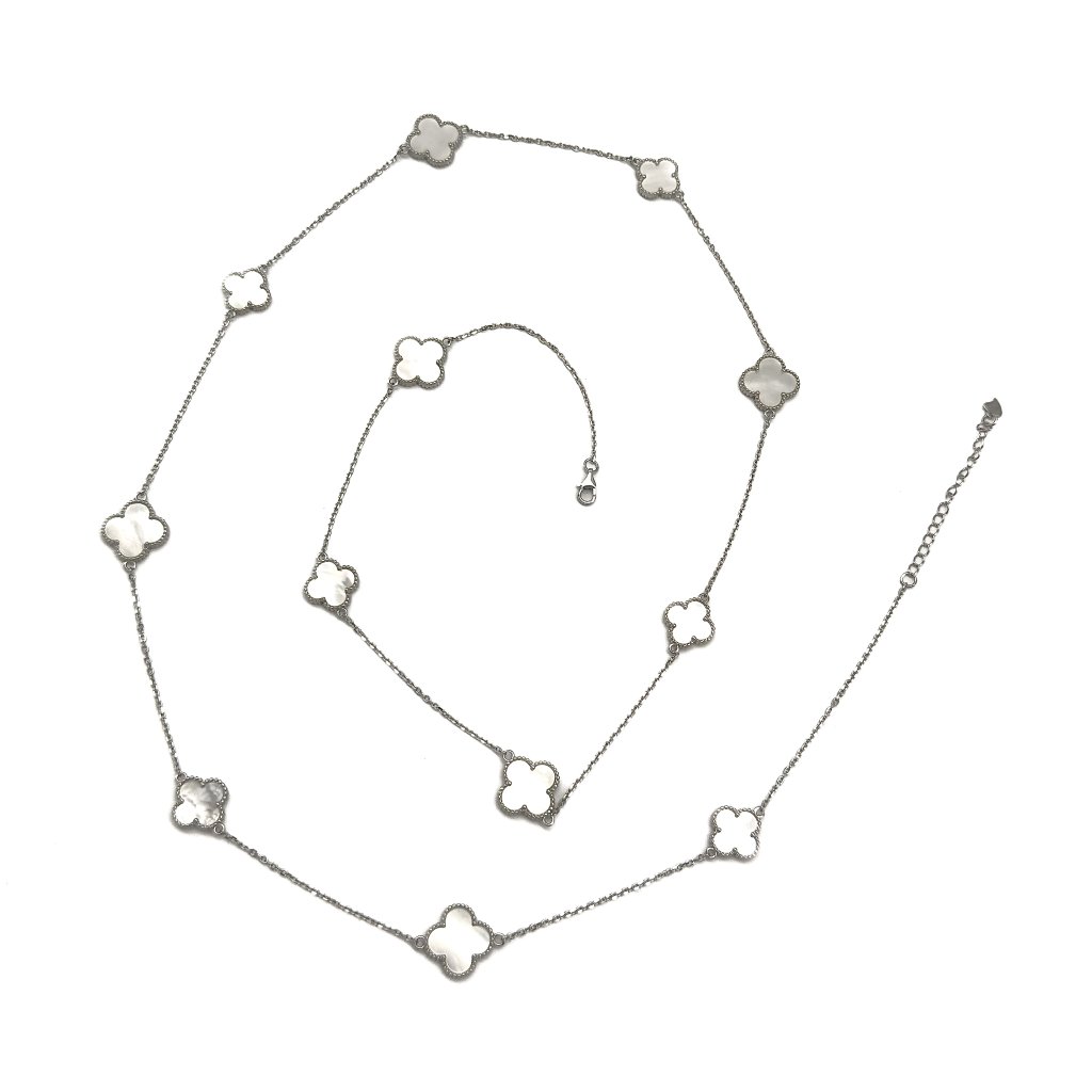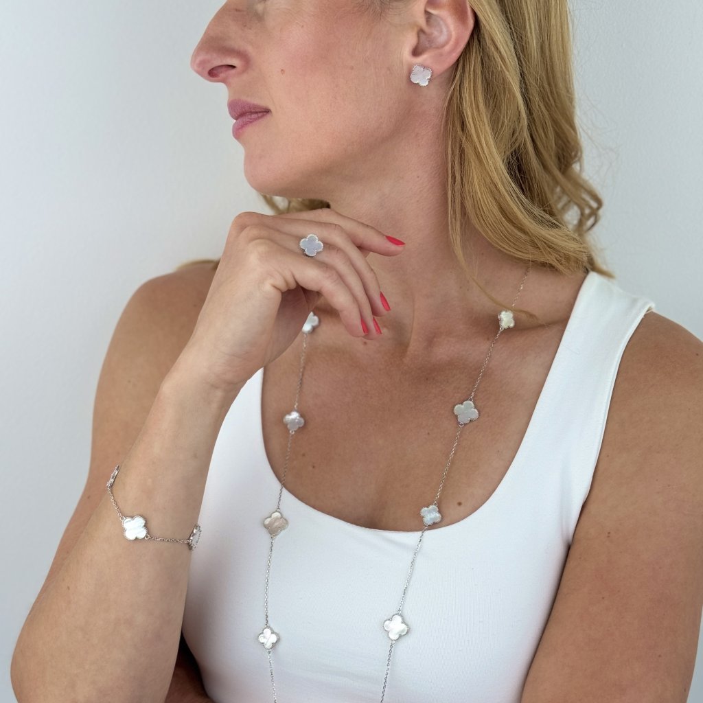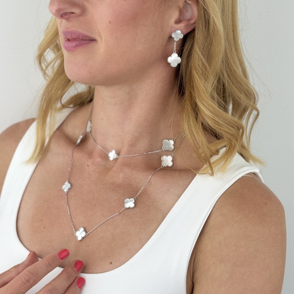 Połączenie rodowanego srebra najwyższej próby Ag925/1000 i perłowych czterolistnych koniczynek tworzy ponadczasowy dodatek, który rozświetli każdą kreację. Szczególnie dobrze komponuje się z letnimi sukienkami i topami z odkrytymi ramionami. Każdy łańcuszek jest starannie wykonany i dostarczany w eleganckim pudełku prezentowym, co czyni go idealnym prezentem dla Twoich bliskich lub dla Ciebie samej.