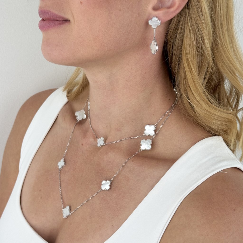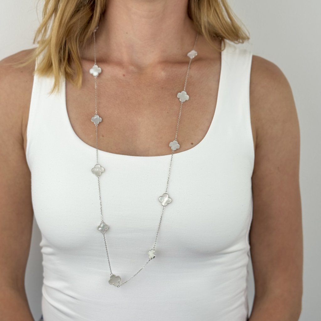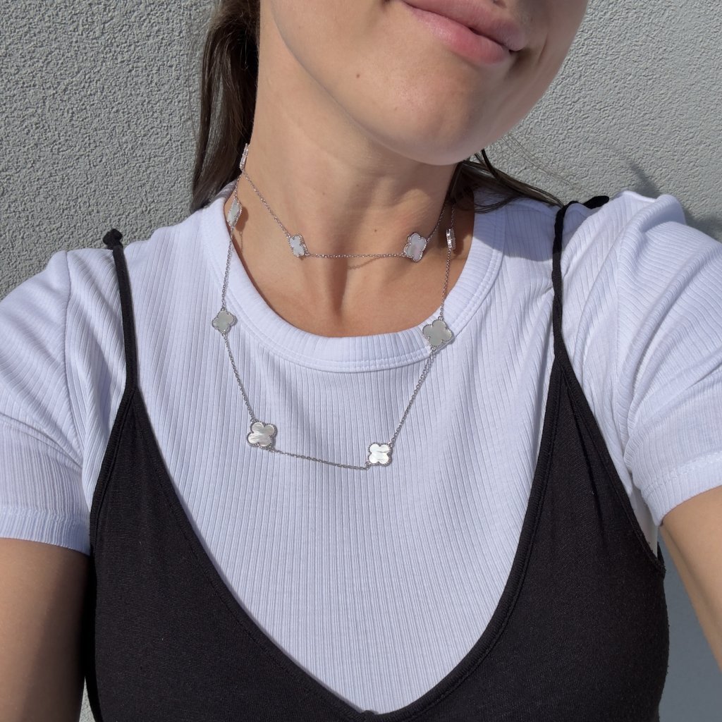 Połączenie rodowanego srebra najwyższej próby Ag925/1000 i perłowych czterolistnych koniczynek tworzy ponadczasowy dodatek, który rozświetli każdą kreację. Szczególnie dobrze komponuje się z letnimi sukienkami i topami z odkrytymi ramionami. Każdy łańcuszek jest starannie wykonany i dostarczany w eleganckim pudełku prezentowym, co czyni go idealnym prezentem dla Twoich bliskich lub dla Ciebie samej.