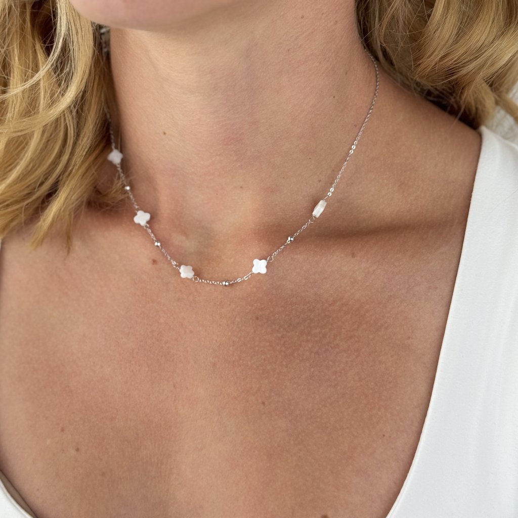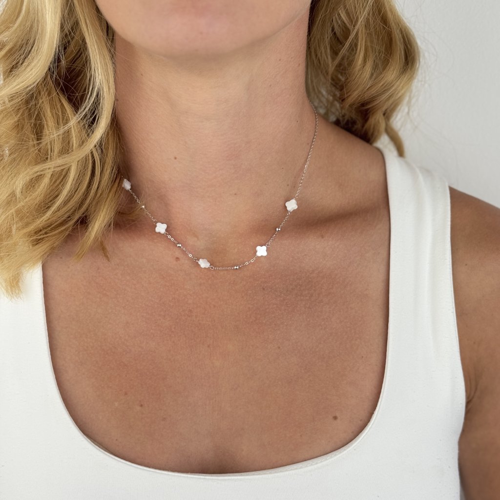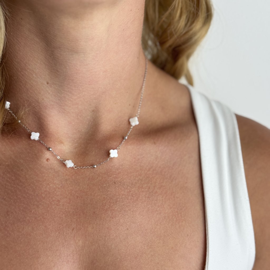 Łańcuszek LUCKY RYAN wykonany z wysokiej jakości srebra próby 925/1000 z roduowanym wykończeniem wnosi do Twojej szkatułki odrobinę szczęścia i elegancji. Delikatny łańcuszek zdobią tematyczne zawieszki - czterolistna koniczyna jako symbol szczęścia, uzupełniona przepięknymi perłami słodkowodnymi i błyszczącymi kuleczkami.