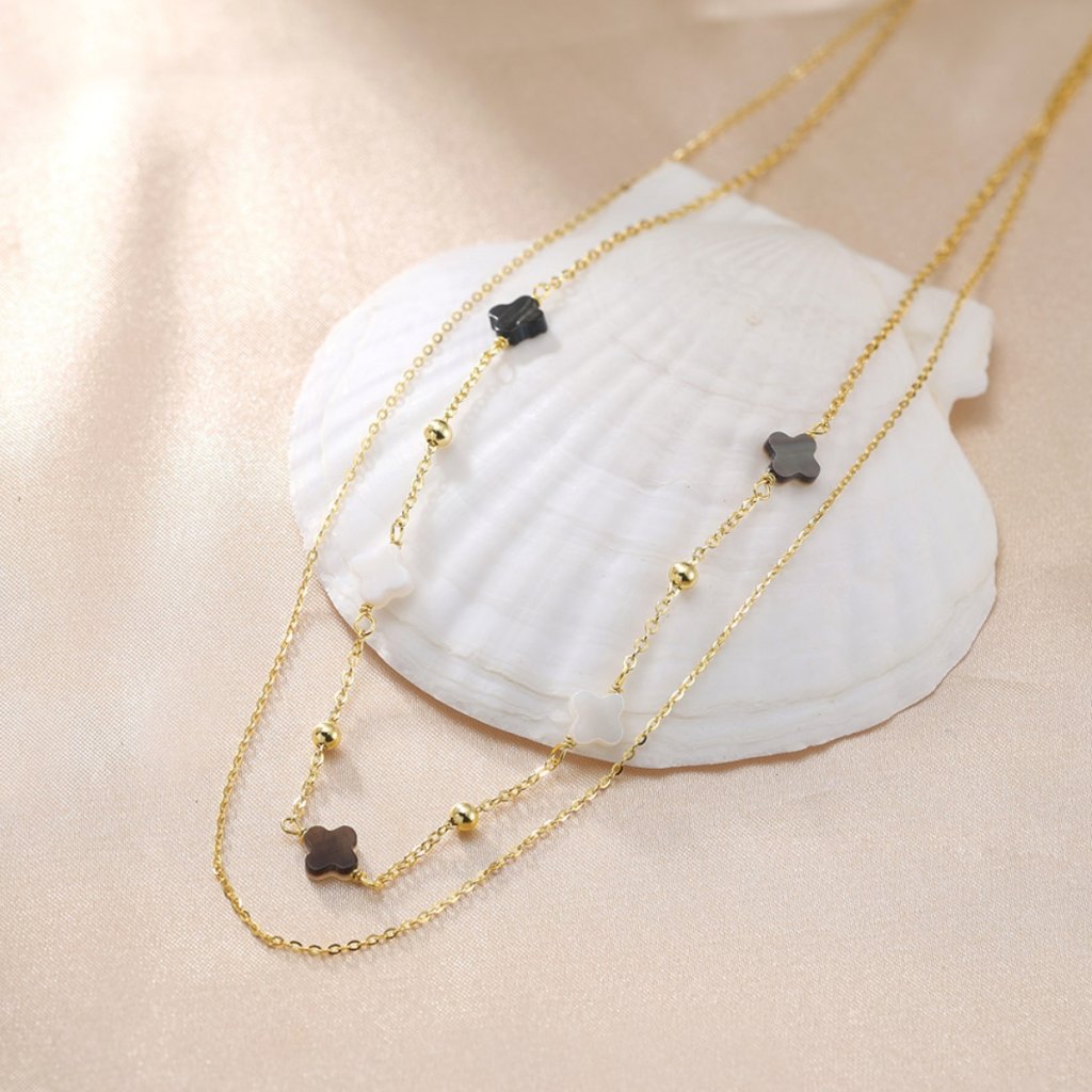 Naszyjnik LUCKY CARRIE z wysokiej jakości srebra próby 925/1000 z luksusową 14-karatową powłoką ze złota wnosi do Twojej szkatułki odrobinę szczęścia i elegancji. Delikatny łańcuszek zdobią tematyczne zawieszki - czterolistna koniczyna jako symbol szczęścia, uzupełniona pięknymi perłami słodkowodnymi uformowanymi w czterolistne koniczyny.
