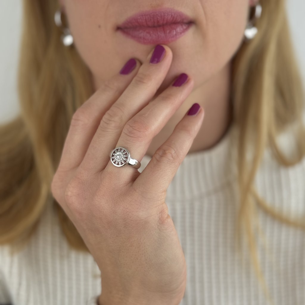 Odkryj nasz srebrny pierścionek z motywem kwiatowym w okręgu, klejnot, który jest prawdziwym dziełem sztuki. Wykonany z czystego srebra próby 925 pierścionek jest uosobieniem elegancji i wyrafinowania. Wyobraź sobie spacer po ogrodzie o świcie, gdy wszystko pokryte jest delikatną rosą, a kwiaty dopiero rozkwitają. Ten pierścionek to chwila uchwycona w czasie, z detalami tak precyzyjnymi, że można poczuć zapach kwiatów na pierścionku.