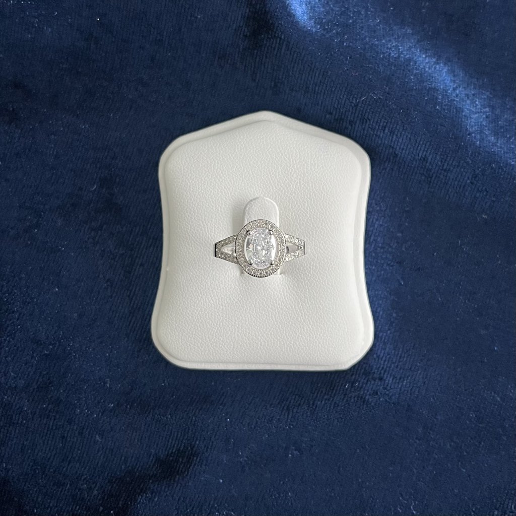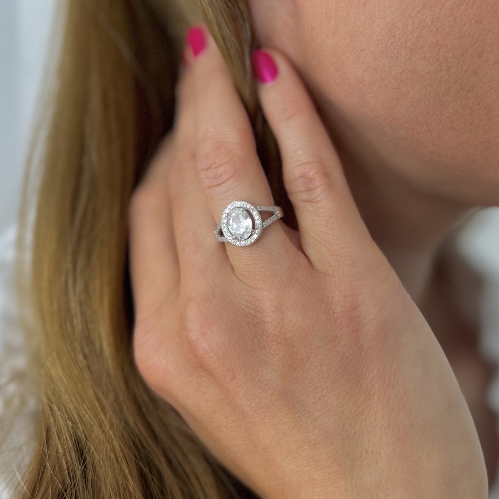 Pierścionek wykonany jest z najczystszego srebra Ag925/1000, które lśni jak blask księżyca i jest ozdobiony świecącymi cyrkoniami sześciennymi, które dodają mu blasku. Umieszczony pośrodku przezroczysty kamień o wymiarach 8x6 mm dodaje pierścionkowi kolejnej warstwy elegancji i wyrafinowania.