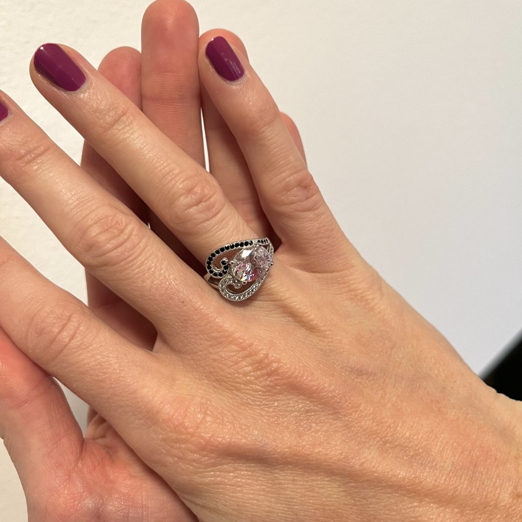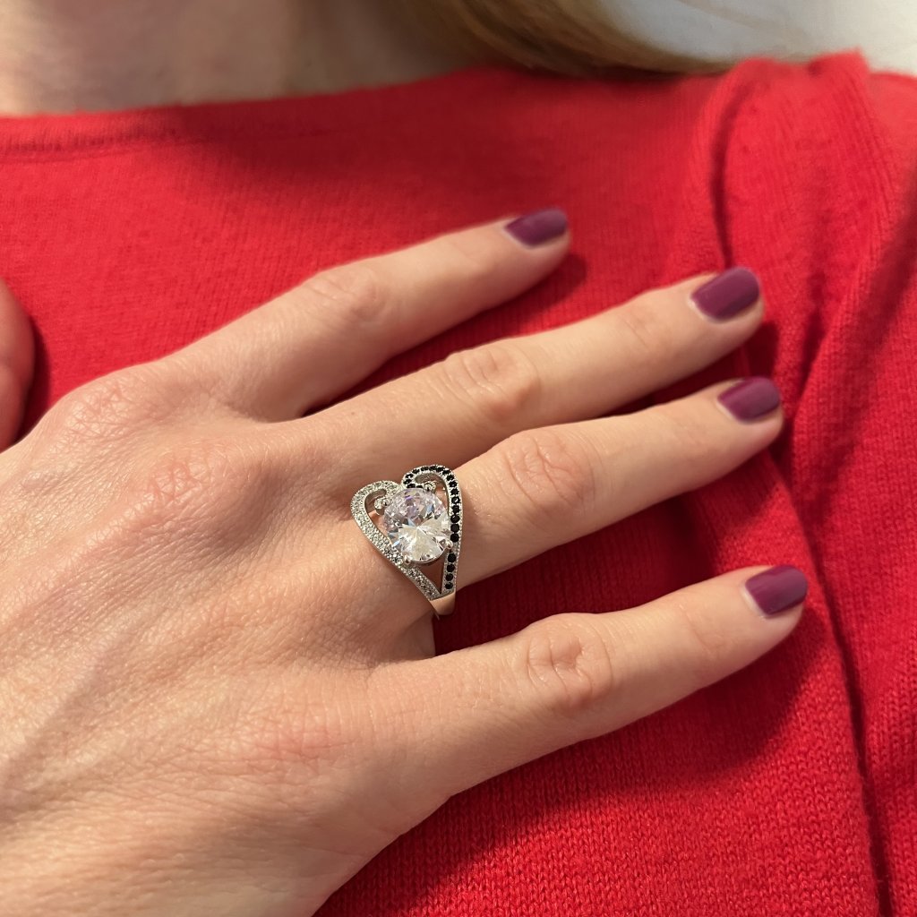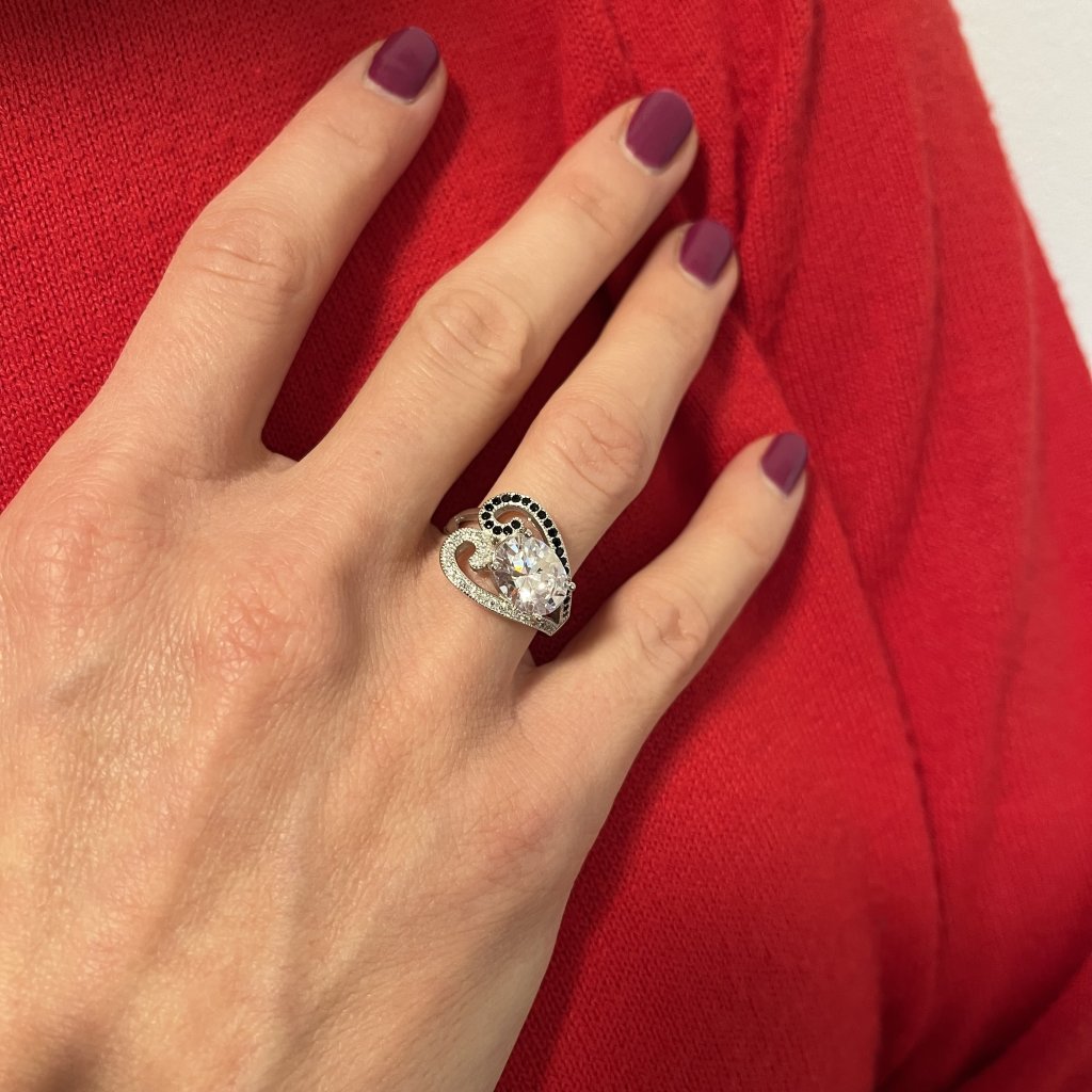 W centrum uwagi znajduje się duża przezroczysta cyrkonia sześcienna o wymiarach 10 × 8 mm, która jest otoczona mniejszymi czarnymi cyrkoniami sześciennymi. Ten kontrast kolorów nadaje pierścionkowi unikalny wygląd i żywy połysk, który przyciąga wzrok już na pierwszy rzut oka.