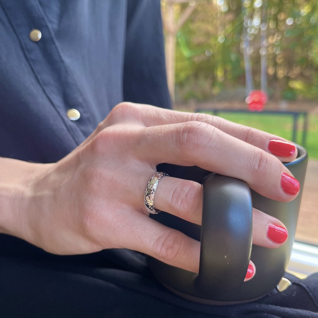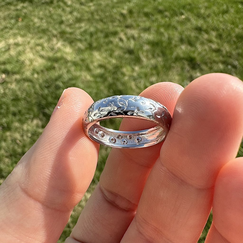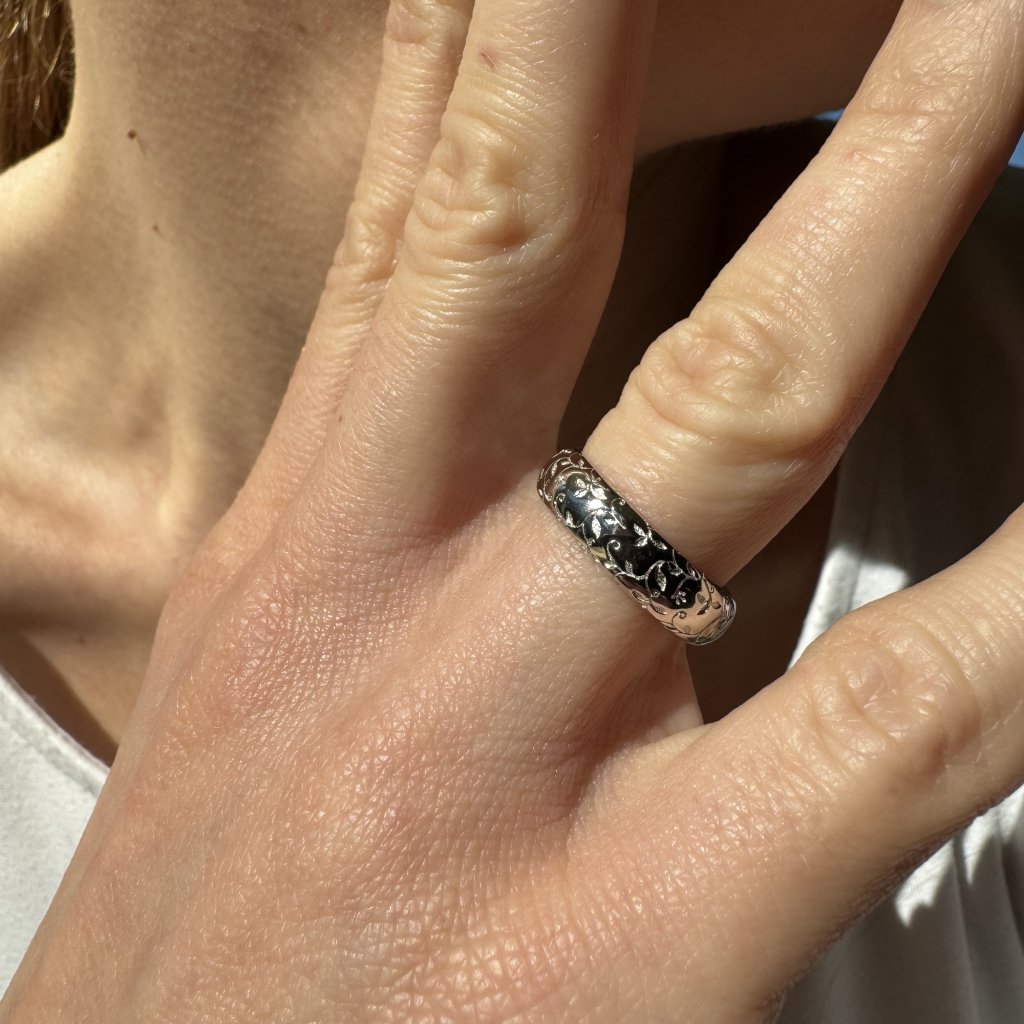 Pierścionek wykonany jest ze srebra próby 925, które jest wysoko cenione ze względu na swoją czystość i trwałość. Srebrny odcień pierścionka jest wzmocniony przez rodowanie, nadając mu piękny połysk, jednocześnie chroniąc go przed uszkodzeniem.