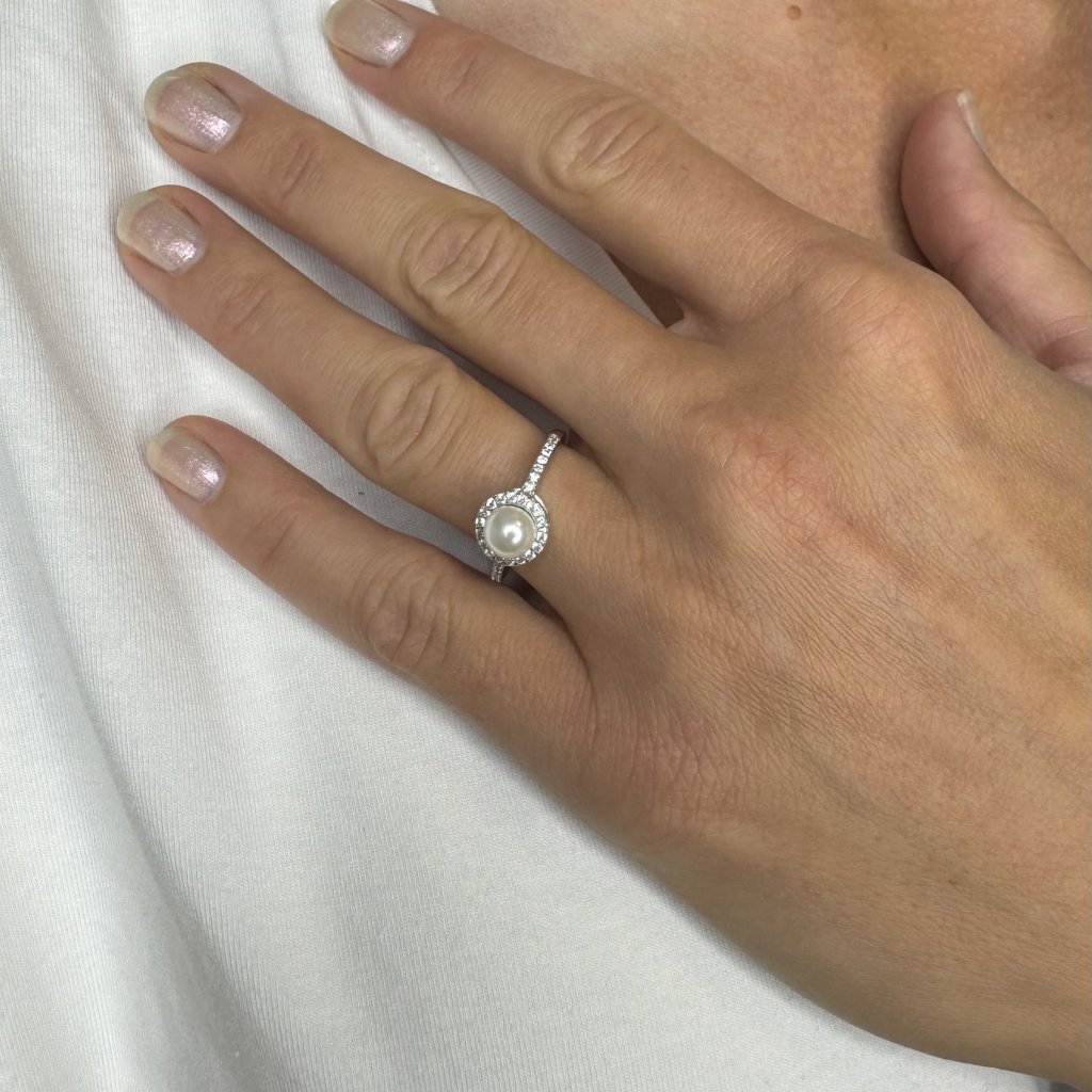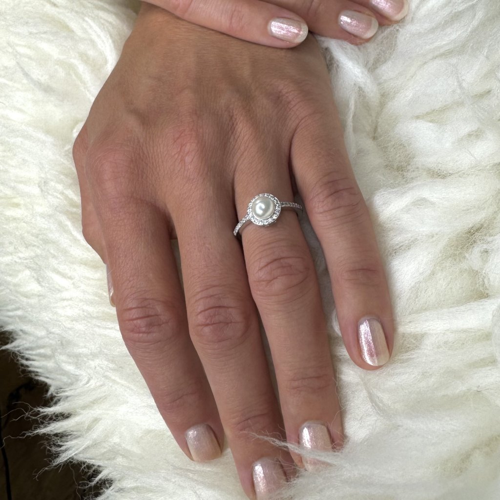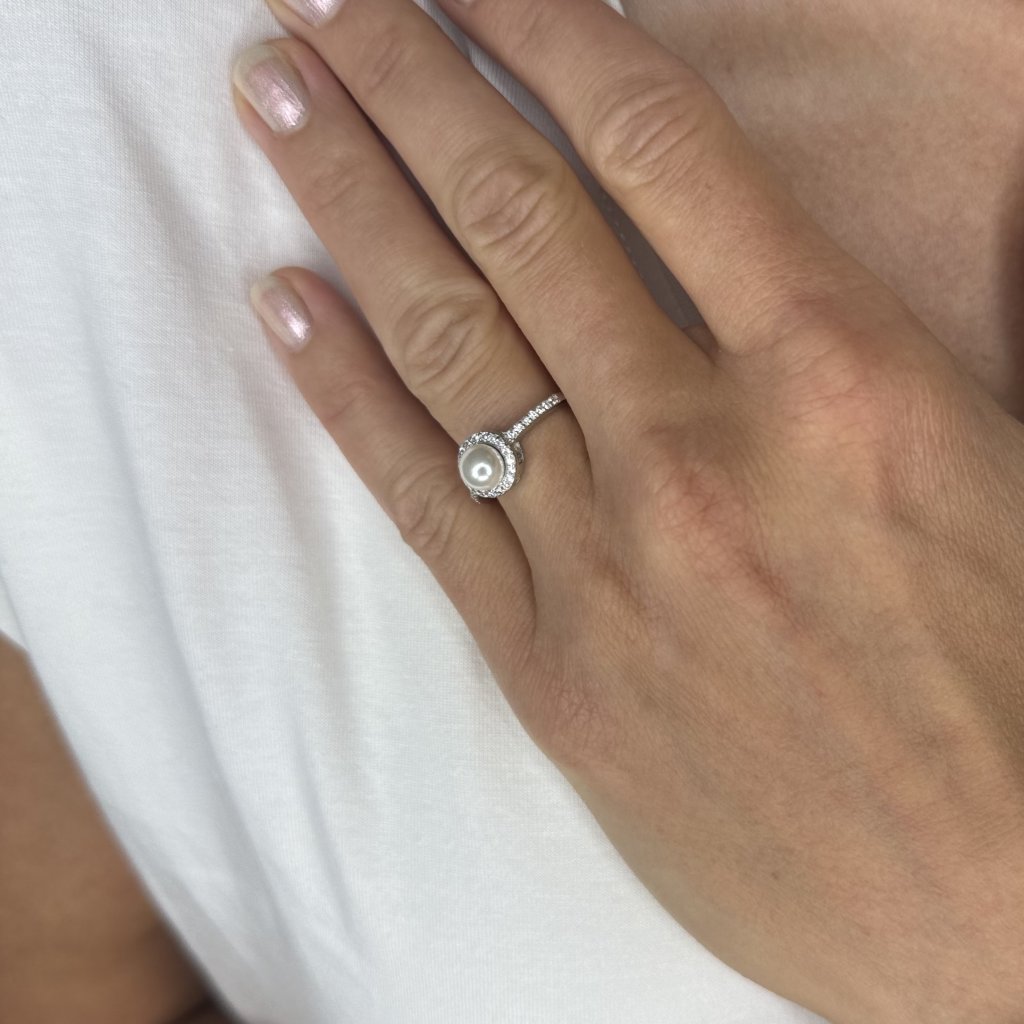 Ta wyjątkowa biżuteria z rodowanego srebra Ag925 łączy w sobie lśniące cyrkonie sześcienne z delikatną perłą o średnicy 6 mm, symbolizując czystość i wyjątkowość Twojej miłości. Pokrycie rodem zapewnia, że pierścionek zachowa swój blask i piękno przez wiele lat, tak jak wasz związek.