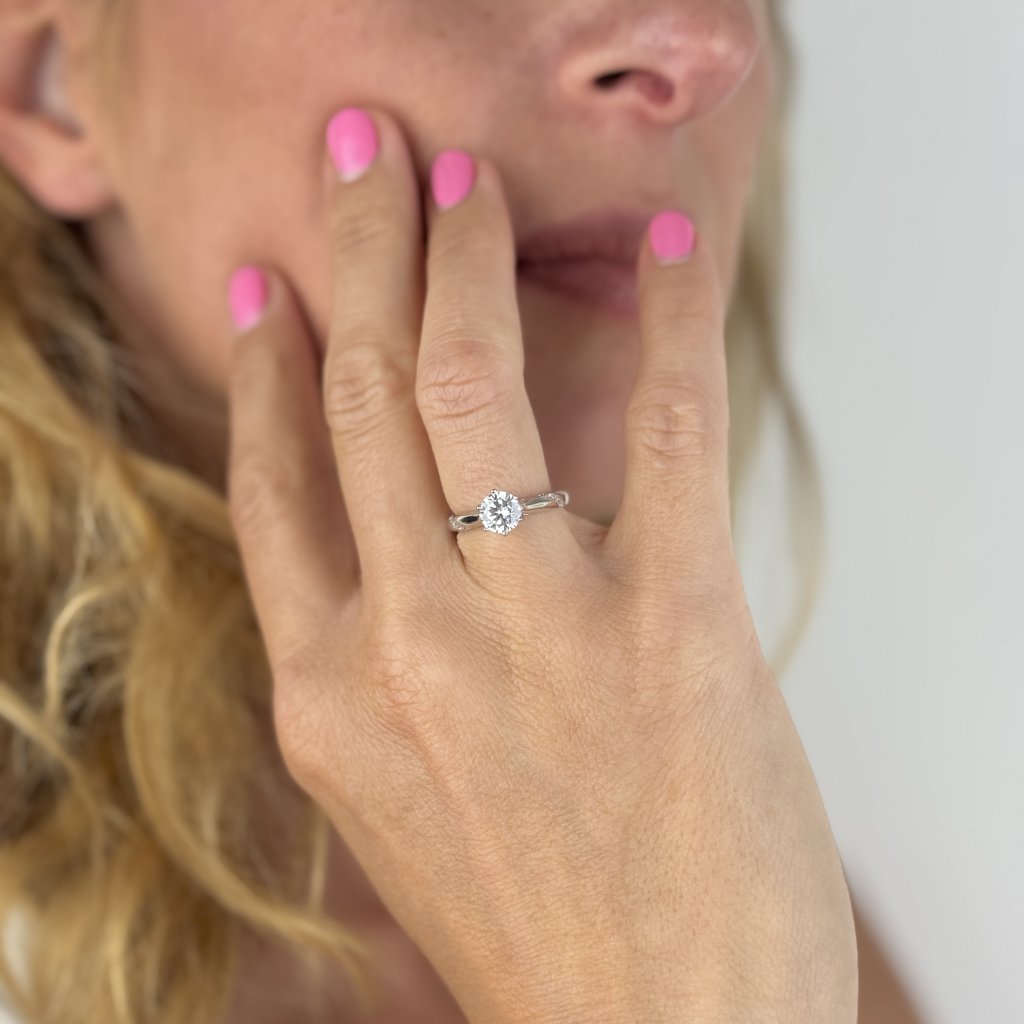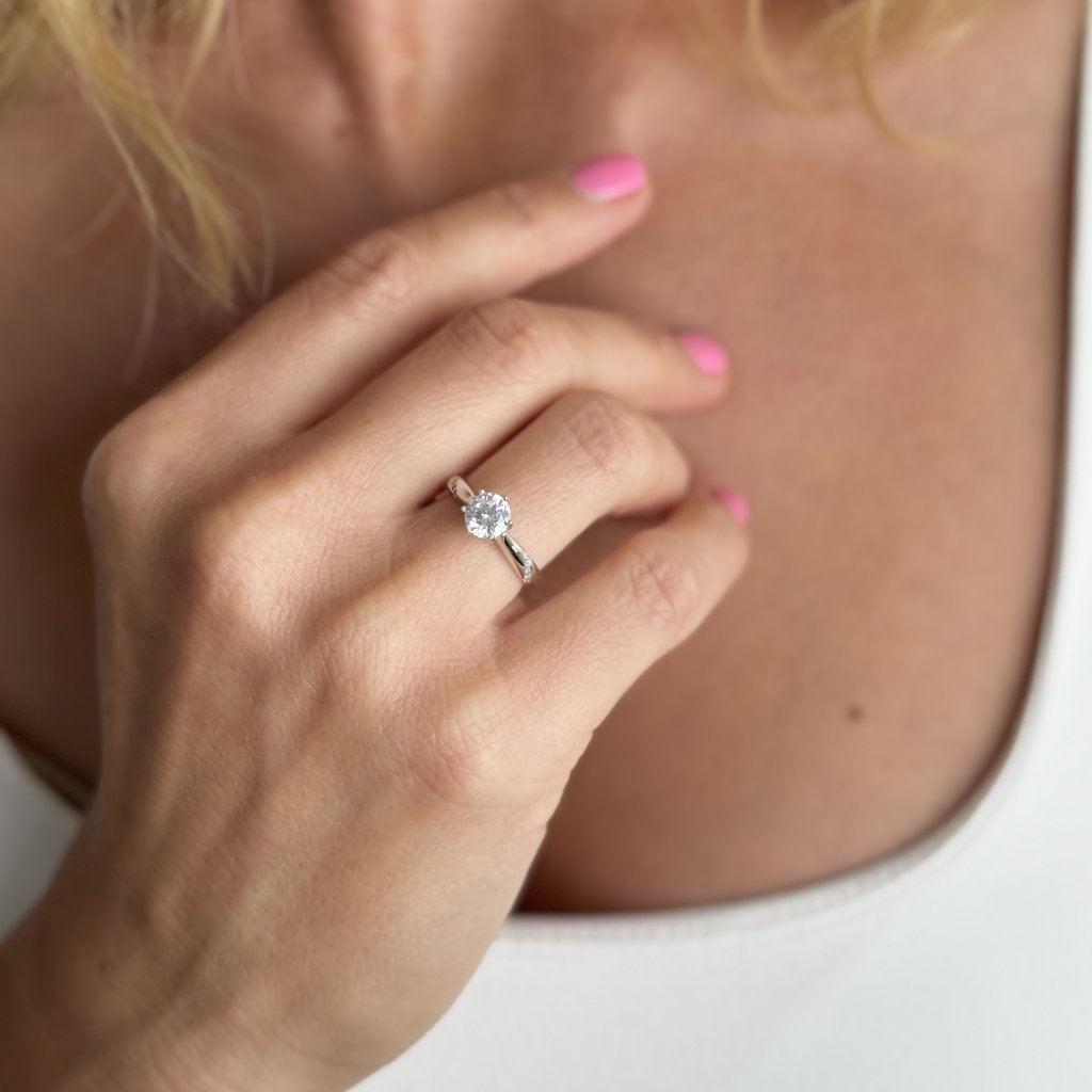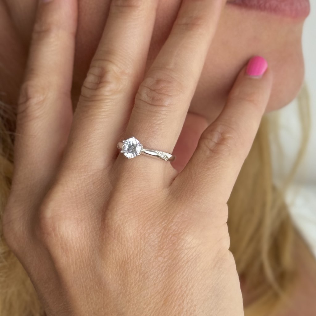 Srebrny pierścionek zaręczynowy YES FOREVER z cyrkoniami. Piękna biżuteria z rodowanego srebra Ag925 to najlepszy wybór na oświadczyny. Pierścionek jest wysadzany błyszczącymi cyrkoniami o średnicy 6 mm, które przyciągają uwagę i dodają klejnotowi odrobiny luksusu. Pokrycie rodem gwarantuje, że pierścionek zachowa swój blask i piękno przez całe wspólne życie.