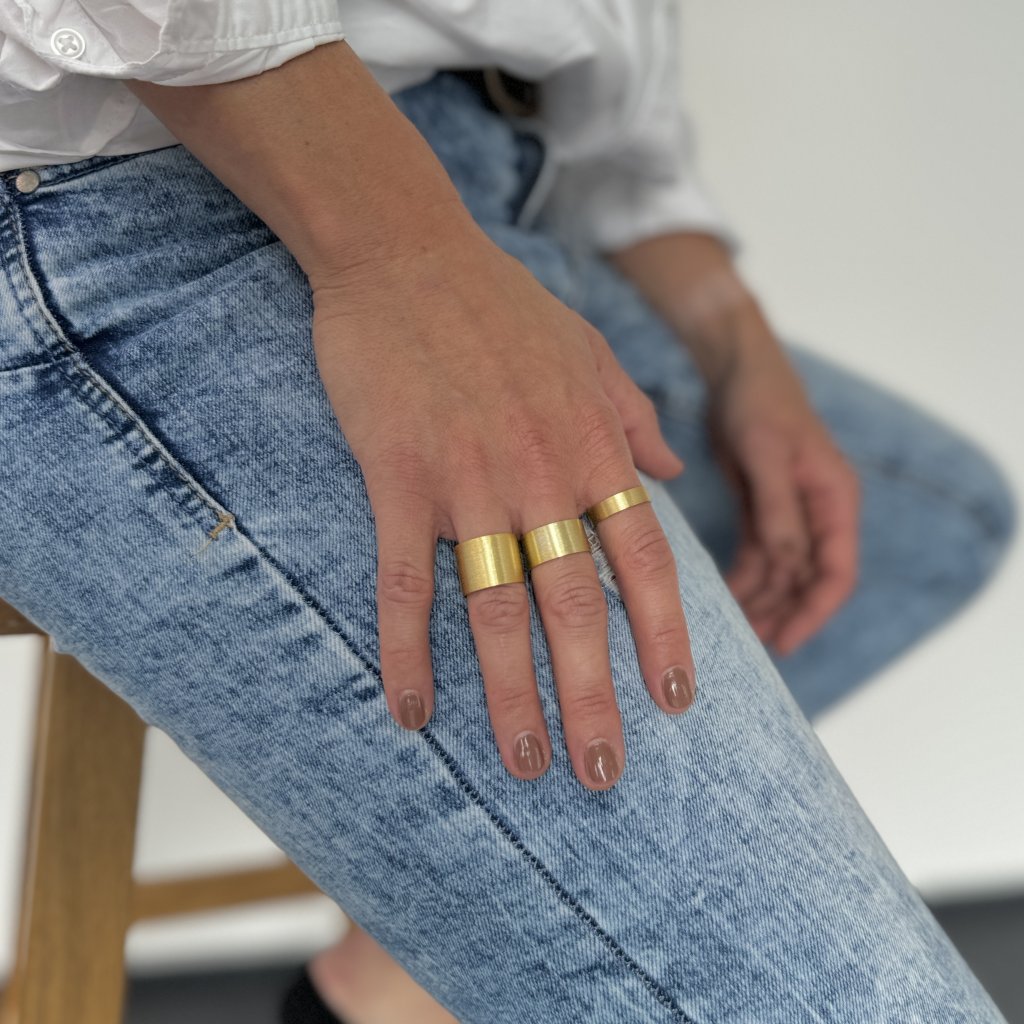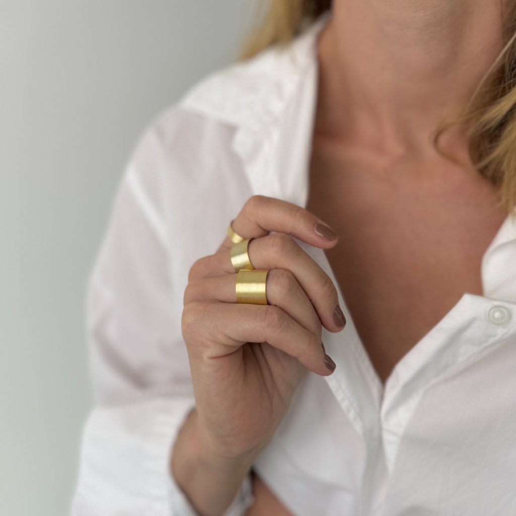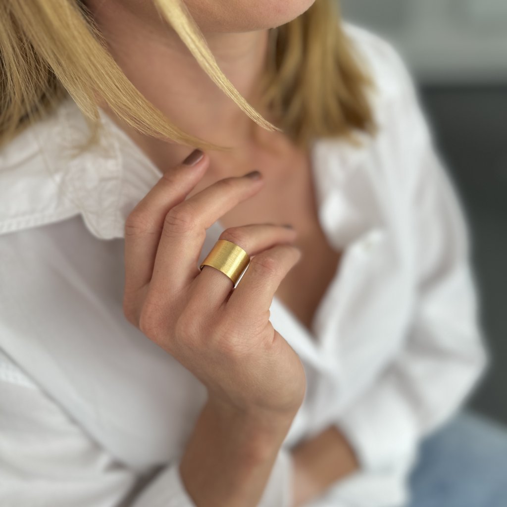 Srebrny pierścionek FIONA L w bardzo szerokim rozmiarze 14 mm z pozłacanym wykończeniem to ponadczasowy minimalistyczny klejnot, który pokochają zarówno mężczyźni, jak i kobiety. Regulowany rozmiar od 6 do 10 zapewnia idealne dopasowanie do każdego palca. Pierścionek wykonany jest z wysokiej jakości srebra próby 925/1000, a jego powierzchnia pokryta jest prawdziwym 14-karatowym złotem, które nadaje mu luksusowy wygląd, wysoki połysk i chroni go przed zużyciem.