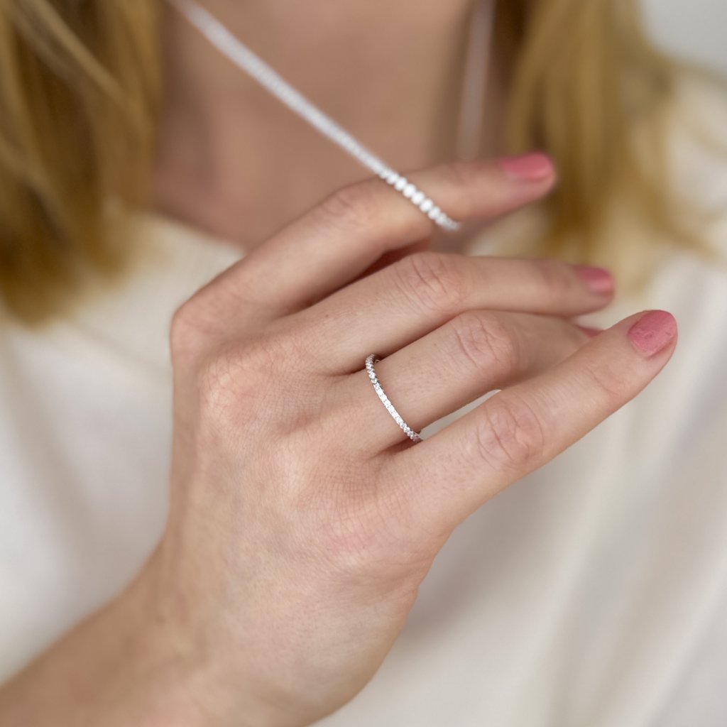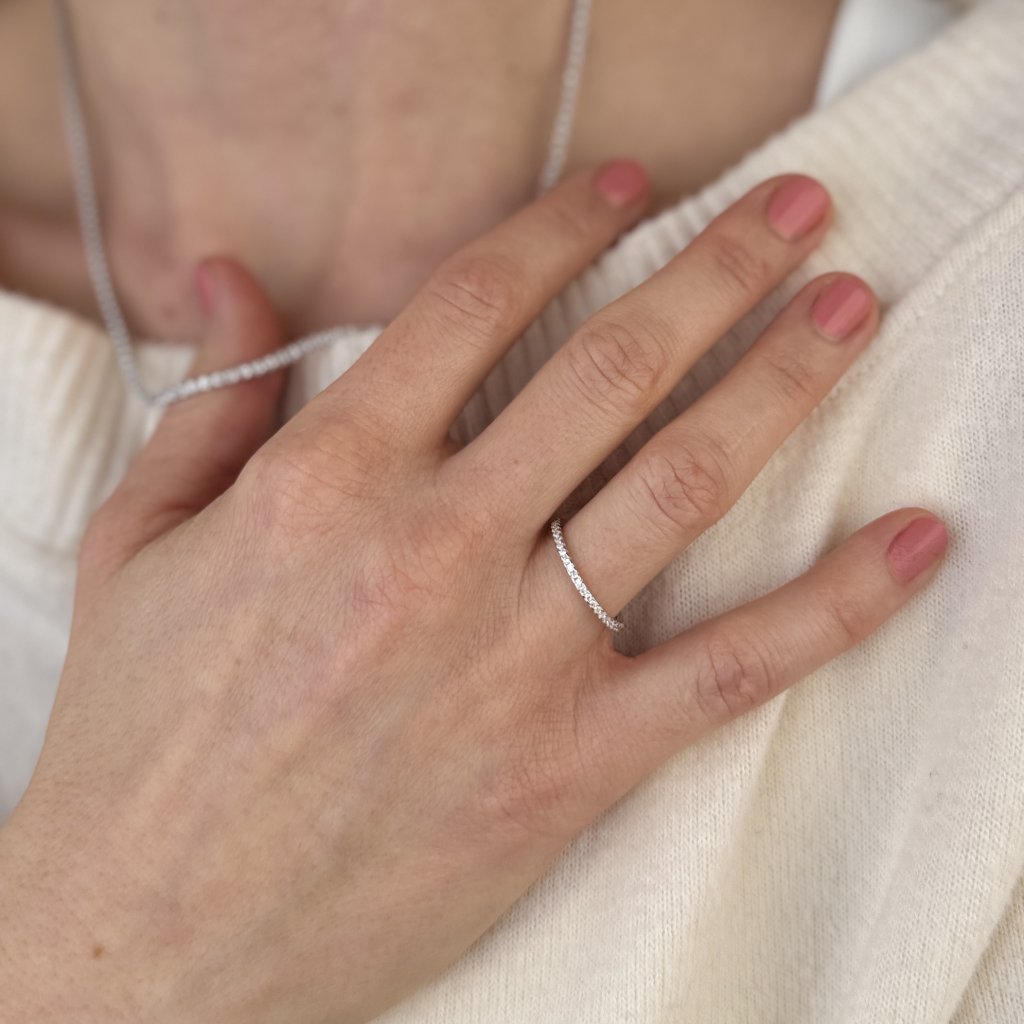 Dzięki szerokości zaledwie 1 mm, DONATELLA jest idealnym wyborem dla kobiet, które preferują subtelną i dyskretną biżuterię. Dzięki rodowanemu wykończeniu pierścionek zachowuje swój blask przez długi czas i jest odporny na zarysowania.