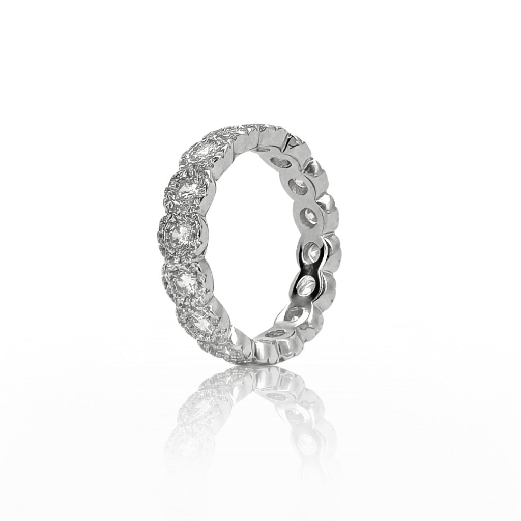 Srebrny pierścionek SAFFIRA to uosobienie elegancji i blasku. Szerokość 5 mm i bogato wysadzany sześciennymi cyrkoniami dookoła, gwarantuje, że przyciągnie wzrok. Ten rodowany pierścionek zaręczynowy ze srebra próby 925 to idealny wybór dla kobiet, które chcą wyróżnić się swoim niepowtarzalnym stylem.